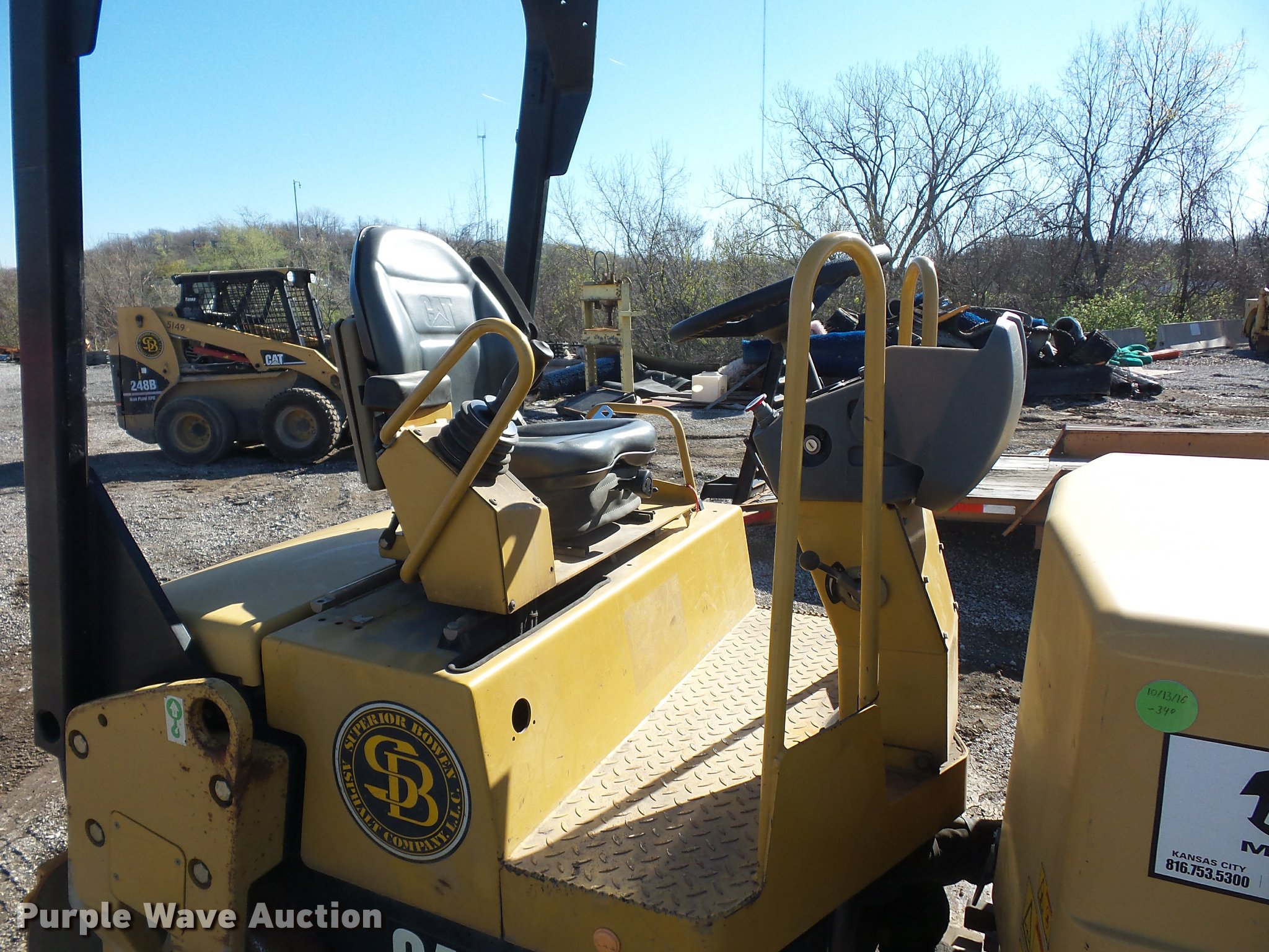 Caterpillar CB334E double drum vibratory roller. 1,979 hours on meter, Four cylinder diesel engine, Hydrostatic transmission, 51"W x 32" diameter drums, Front and rear drum scrapers, Front and rear water application, Work lights, Serial CATCB334JC3A00272, Unit# 1724. Superior Bowen Asphalt. 2501 Manchester Trafficway. Kansas City, MO 64129