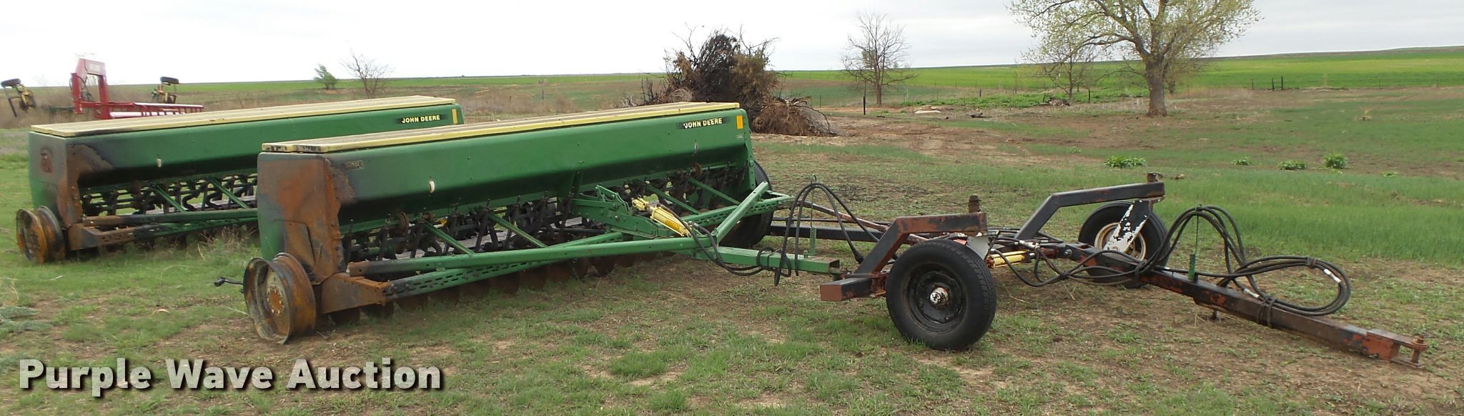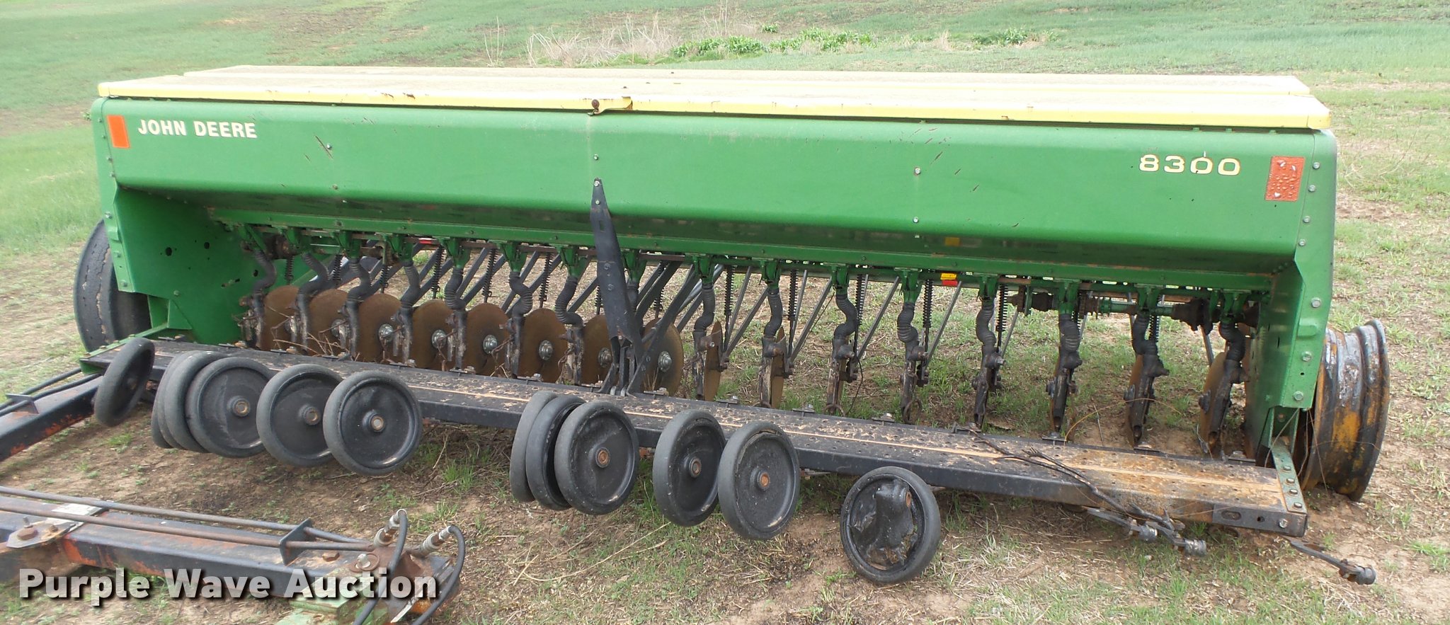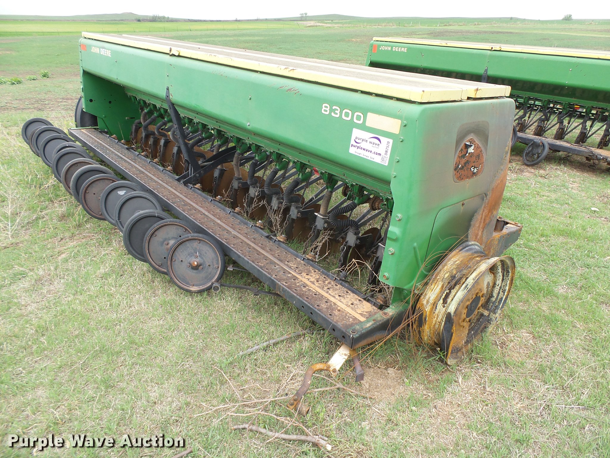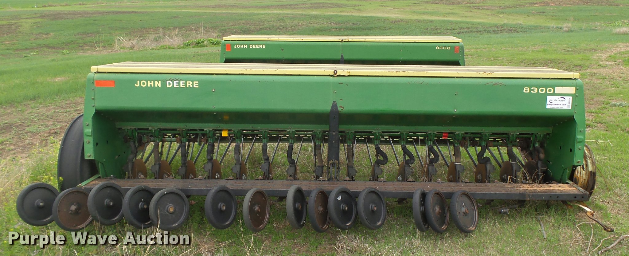 Purple Wave is selling a used Grain Drill or Seeder in Kansas. This item is a (2) John Deere 8300 grain drills with the following: 28'W, 16 row units, 10" row spacing, Hydraulic wing fold, Bulk fill system, Single disk opener, Single rubber closing system, Pin hitch, Double drill hitch, (2) P215/70R15 transport tires, (2) 7.50-20 drive/outside tires, Fire damage, Serial 041692, 011203, Unit# A304640P00