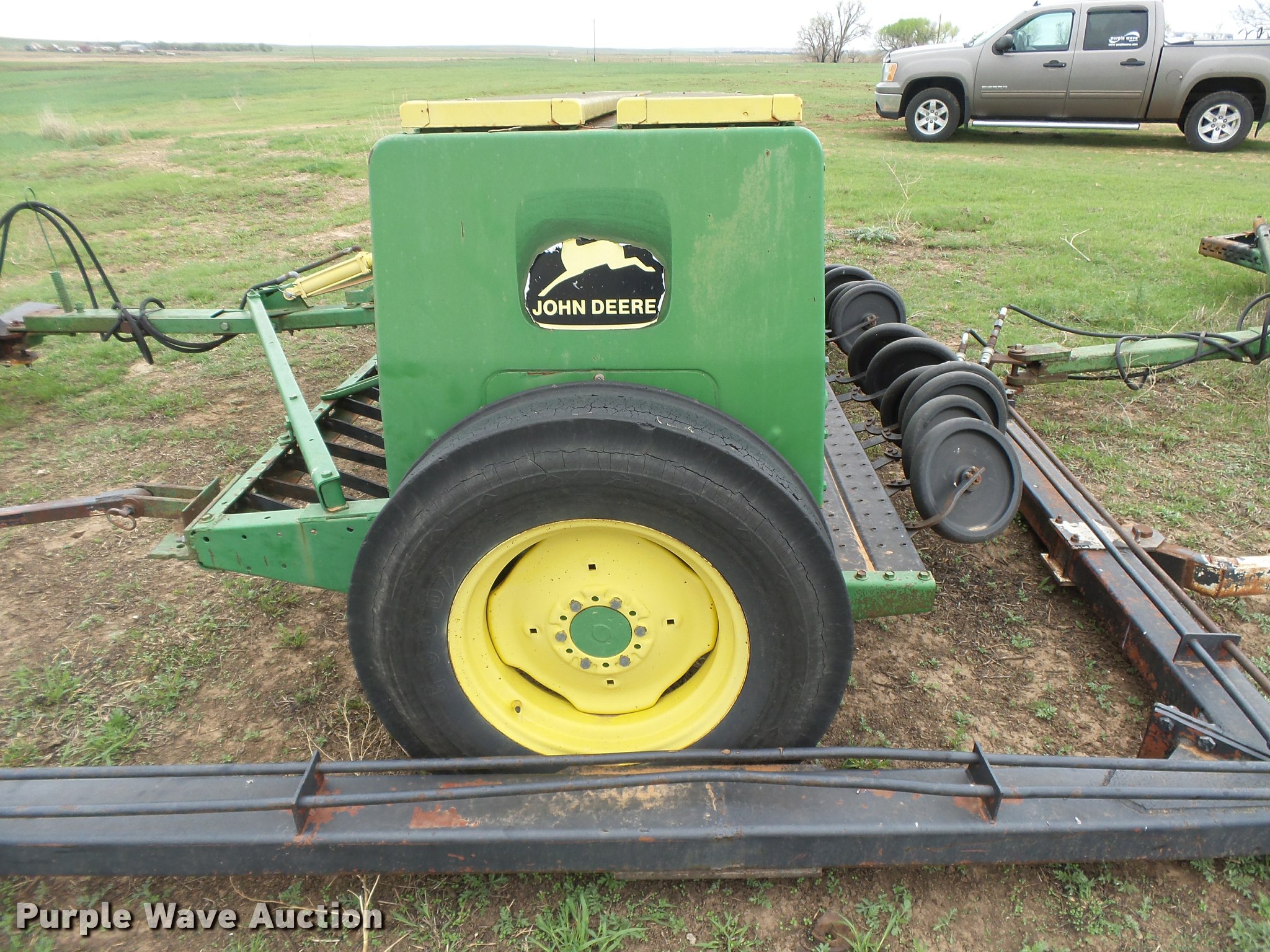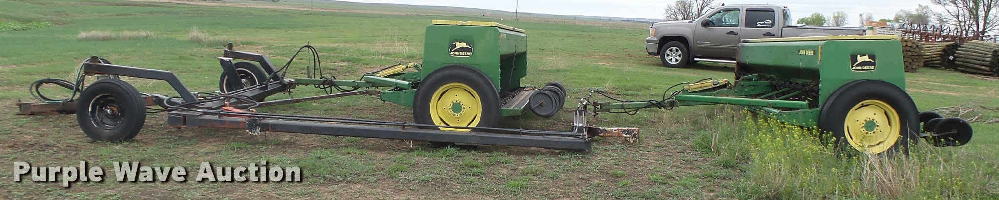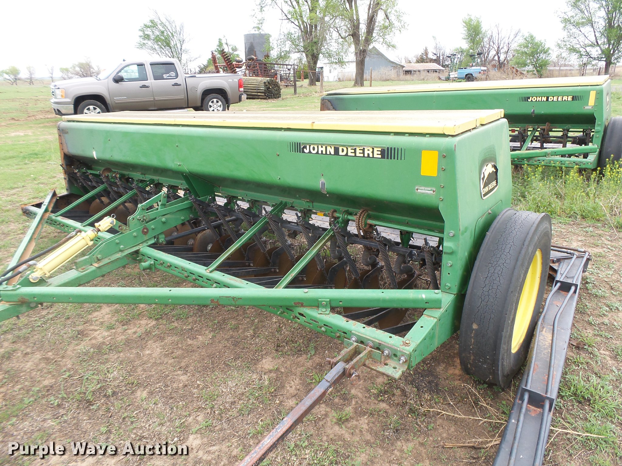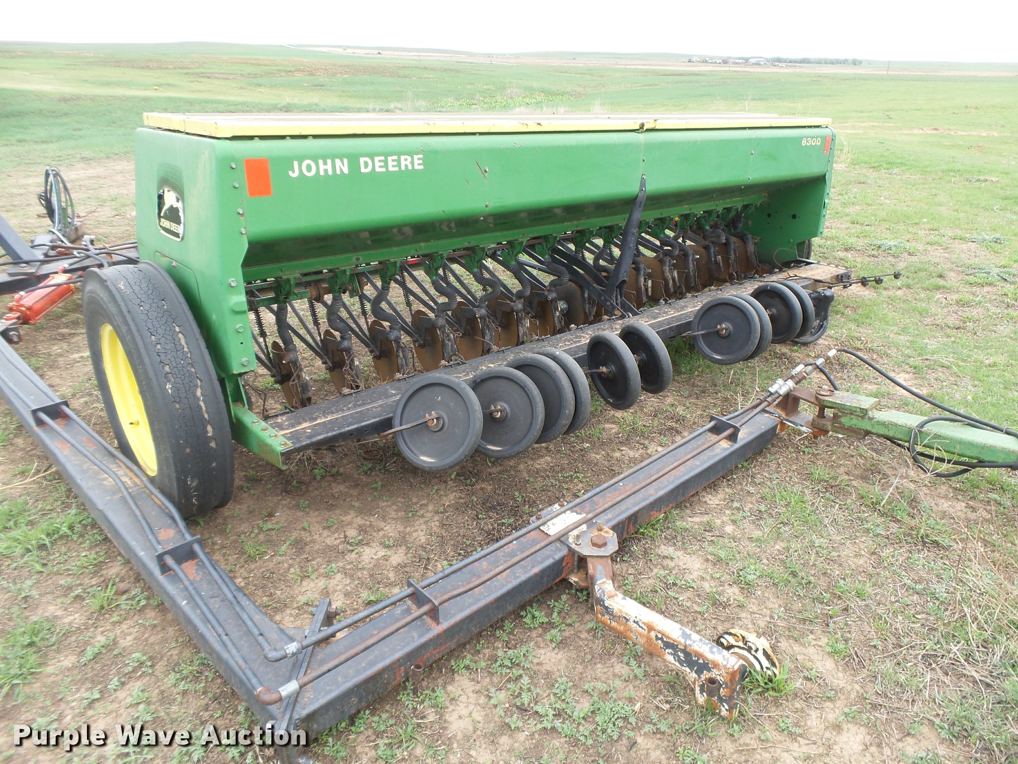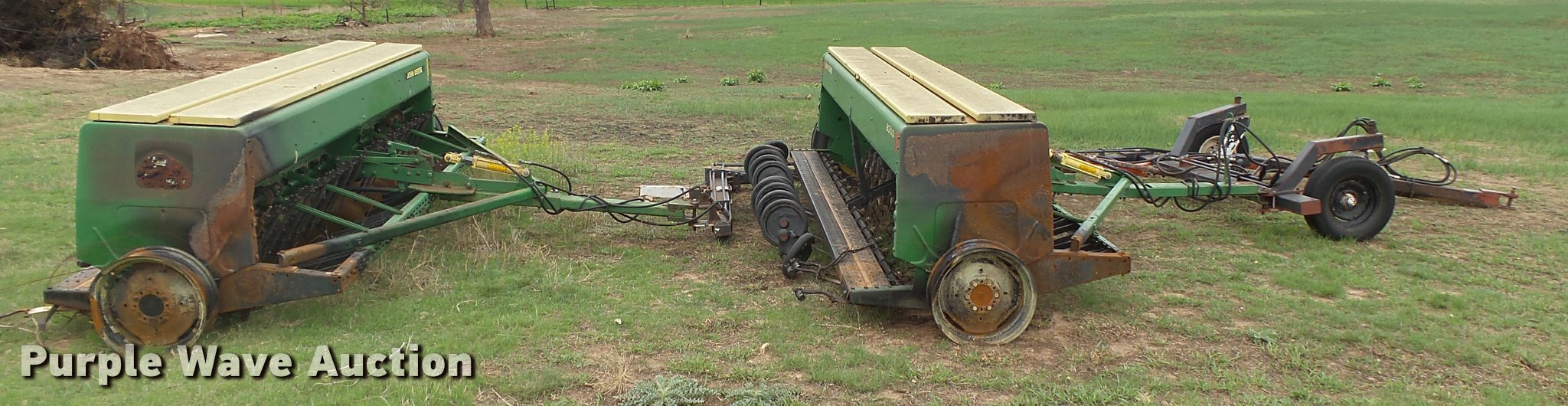 Purple Wave is selling a used Grain Drill or Seeder in Kansas. This item is a (2) John Deere 8300 grain drills with the following: 28'W, 16 row units, 10" row spacing, Hydraulic wing fold, Bulk fill system, Single disk opener, Single rubber closing system, Pin hitch, Double drill hitch, (2) P215/70R15 transport tires, (2) 7.50-20 drive/outside tires, Fire damage, Serial 041692, 011203, Unit# A304640P00
