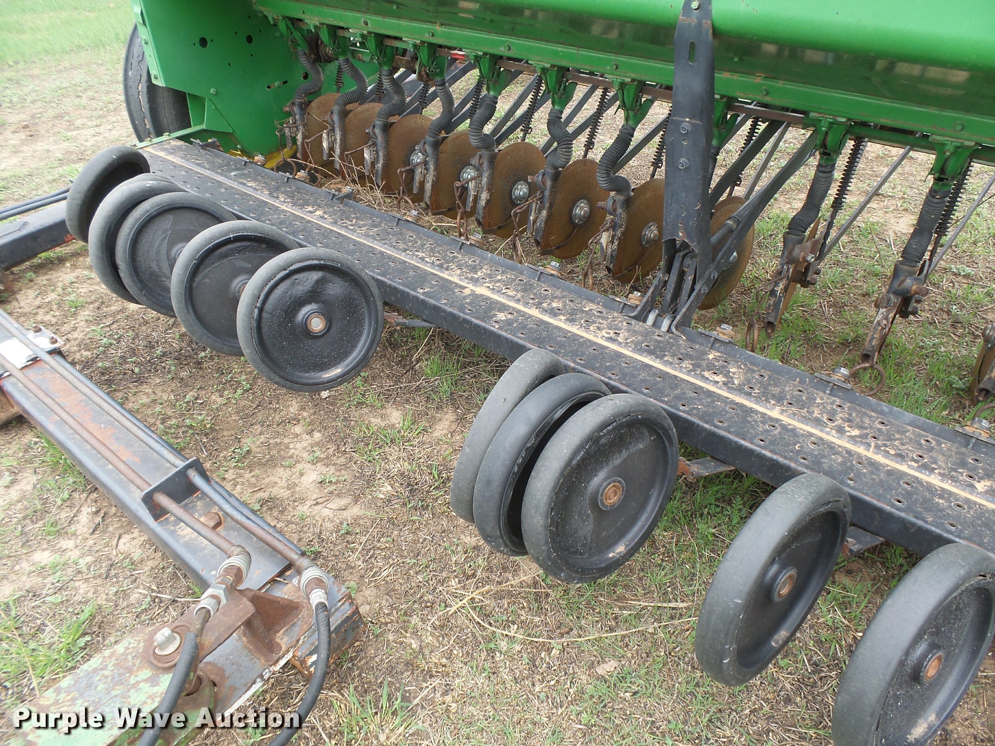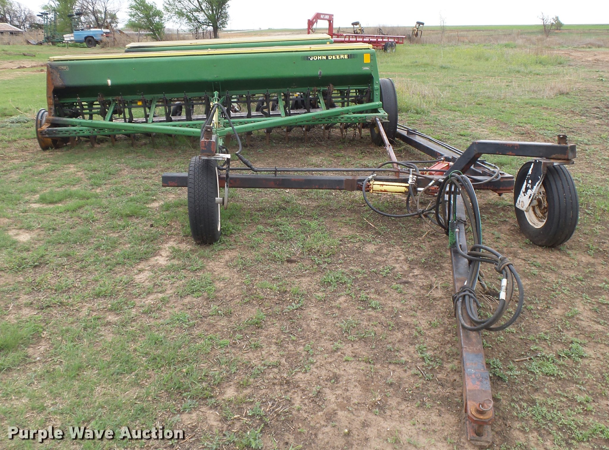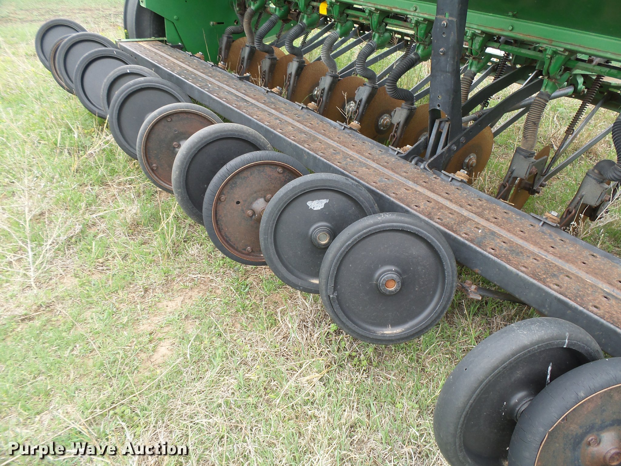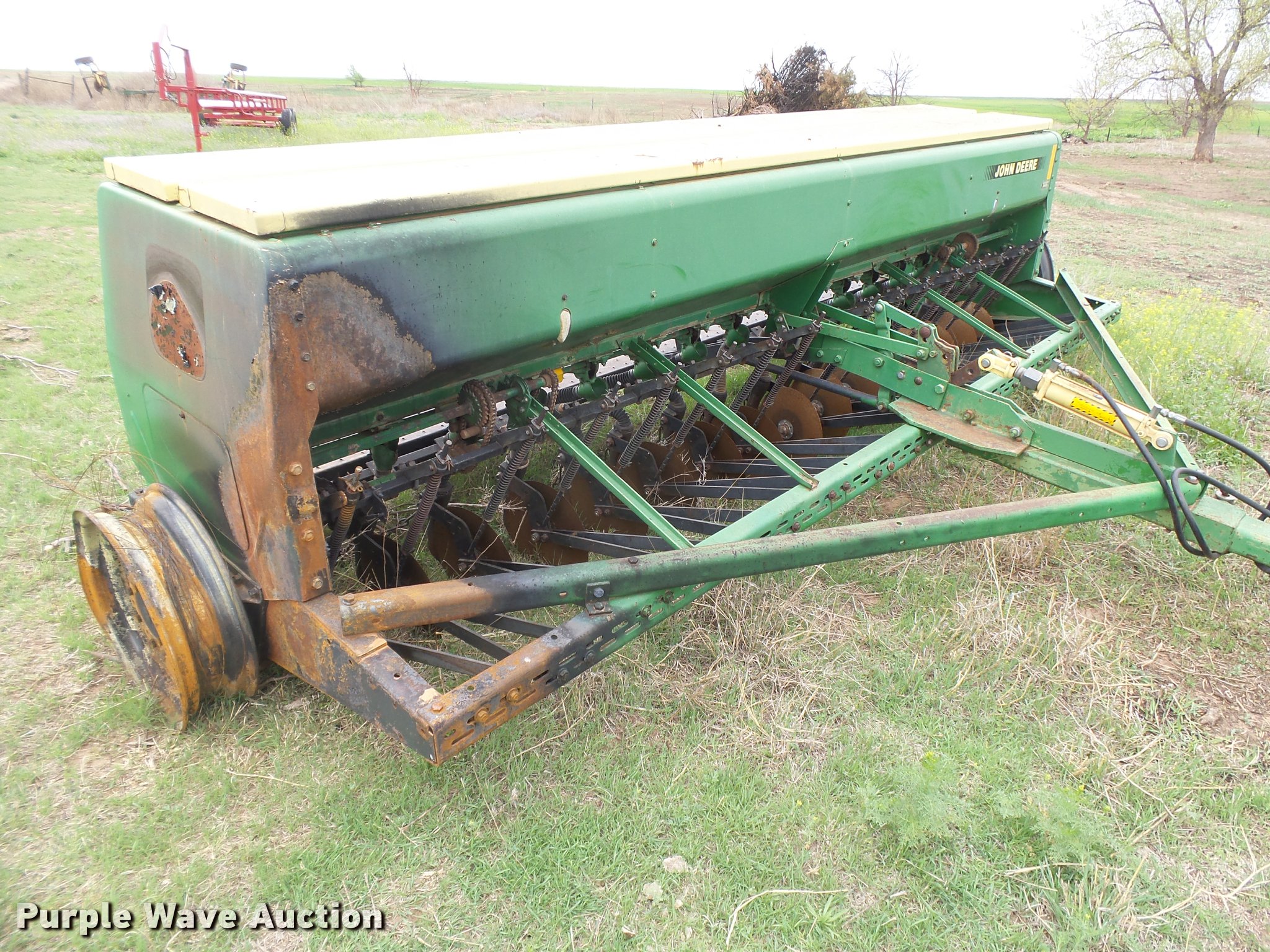 Purple Wave is selling a used Grain Drill or Seeder in Kansas. This item is a (2) John Deere 8300 grain drills with the following: 28'W, 16 row units, 10" row spacing, Hydraulic wing fold, Bulk fill system, Single disk opener, Single rubber closing system, Pin hitch, Double drill hitch, (2) P215/70R15 transport tires, (2) 7.50-20 drive/outside tires, Fire damage, Serial 041692, 011203, Unit# A304640P00