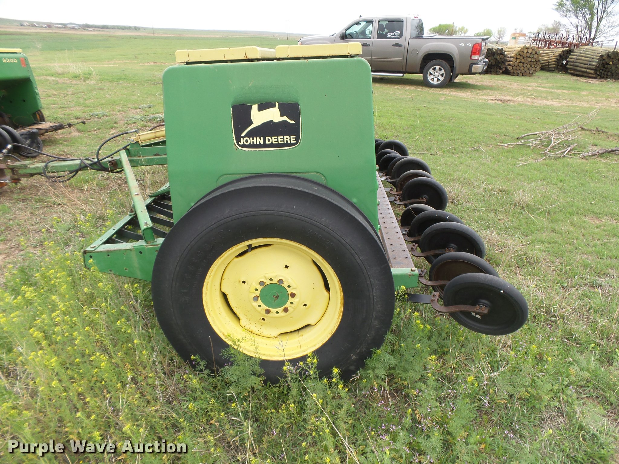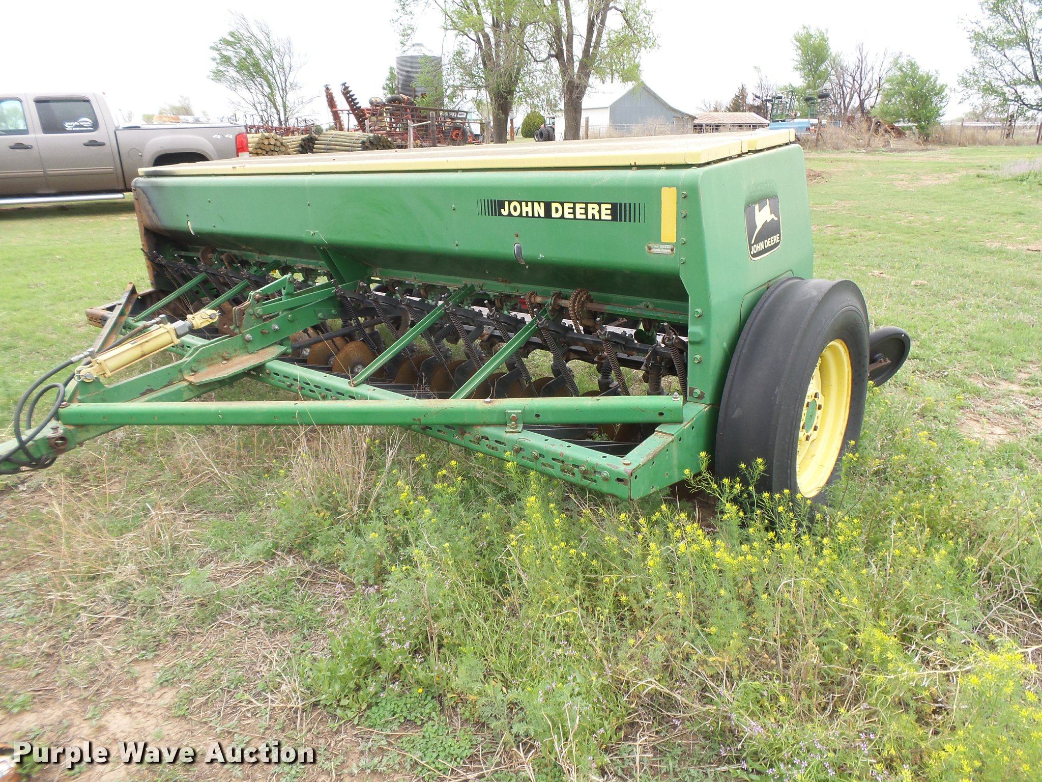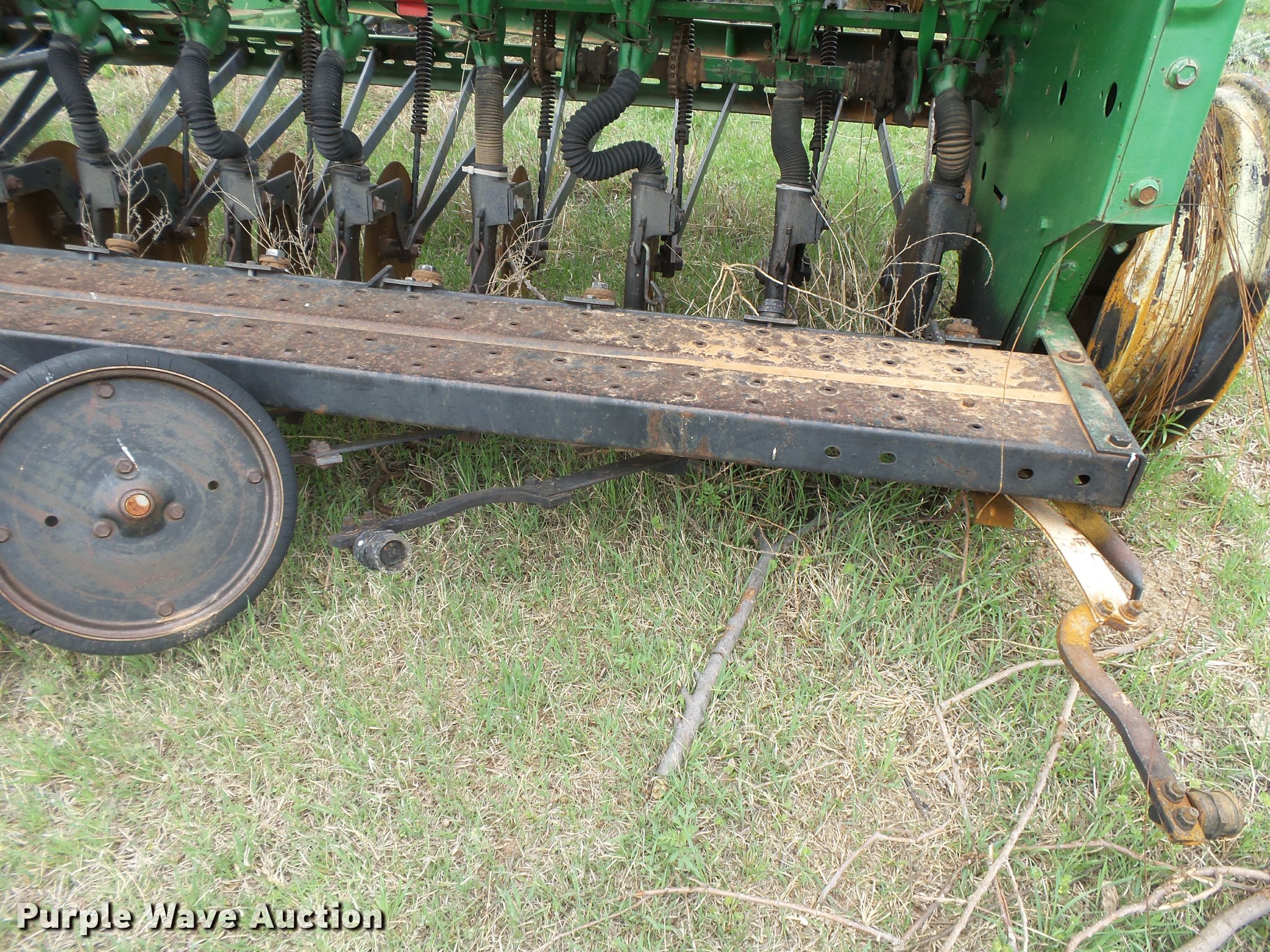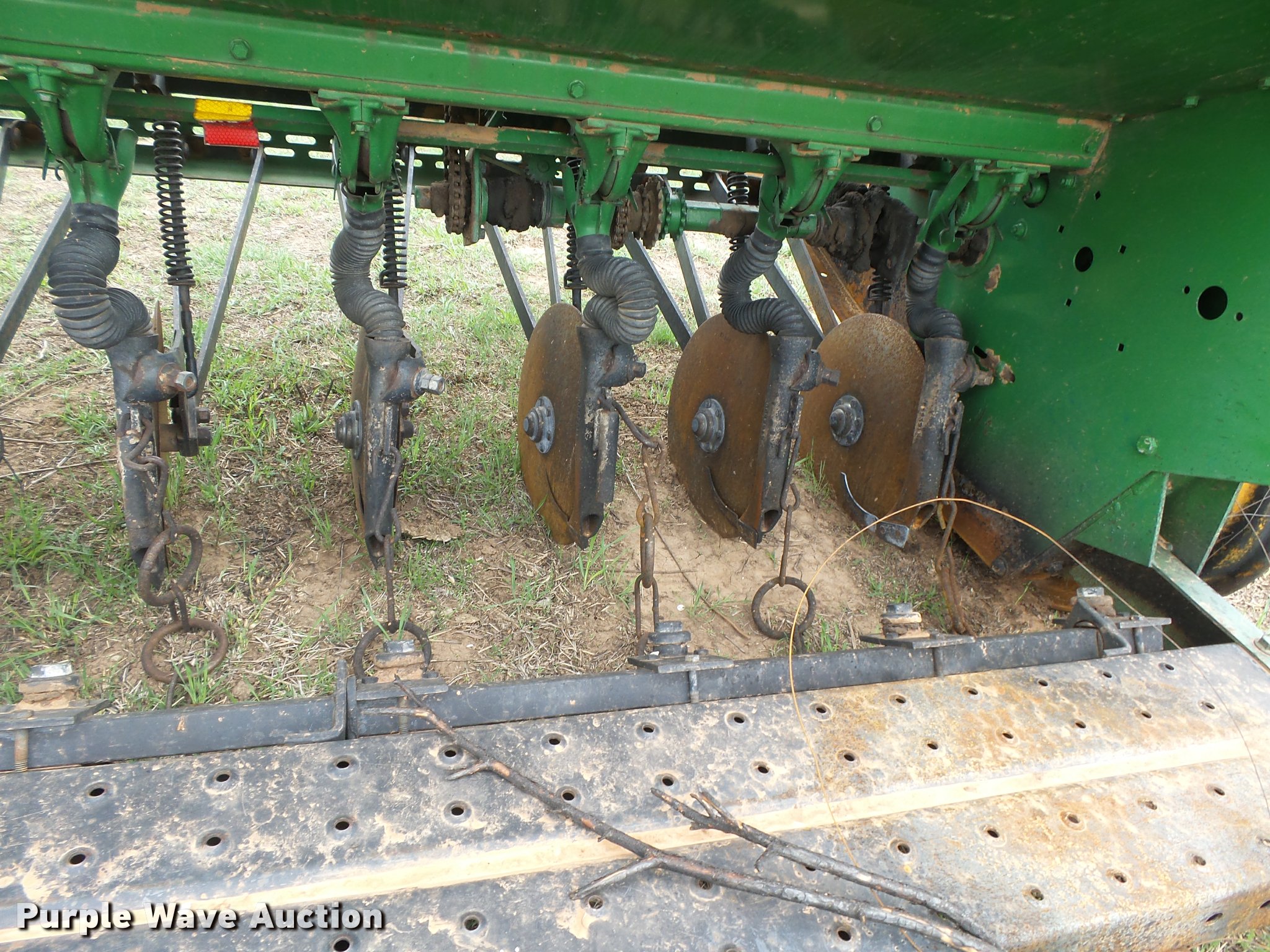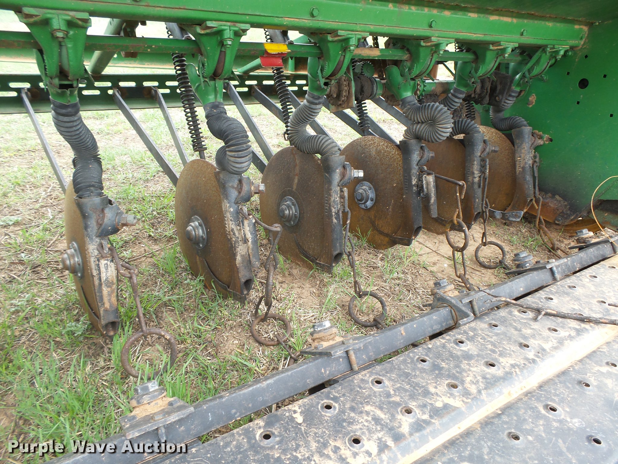 Purple Wave is selling a used Grain Drill or Seeder in Kansas. This item is a (2) John Deere 8300 grain drills with the following: 28'W, 16 row units, 10" row spacing, Hydraulic wing fold, Bulk fill system, Single disk opener, Single rubber closing system, Pin hitch, Double drill hitch, (2) P215/70R15 transport tires, (2) 7.50-20 drive/outside tires, Fire damage, Serial 041692, 011203, Unit# A304640P00
