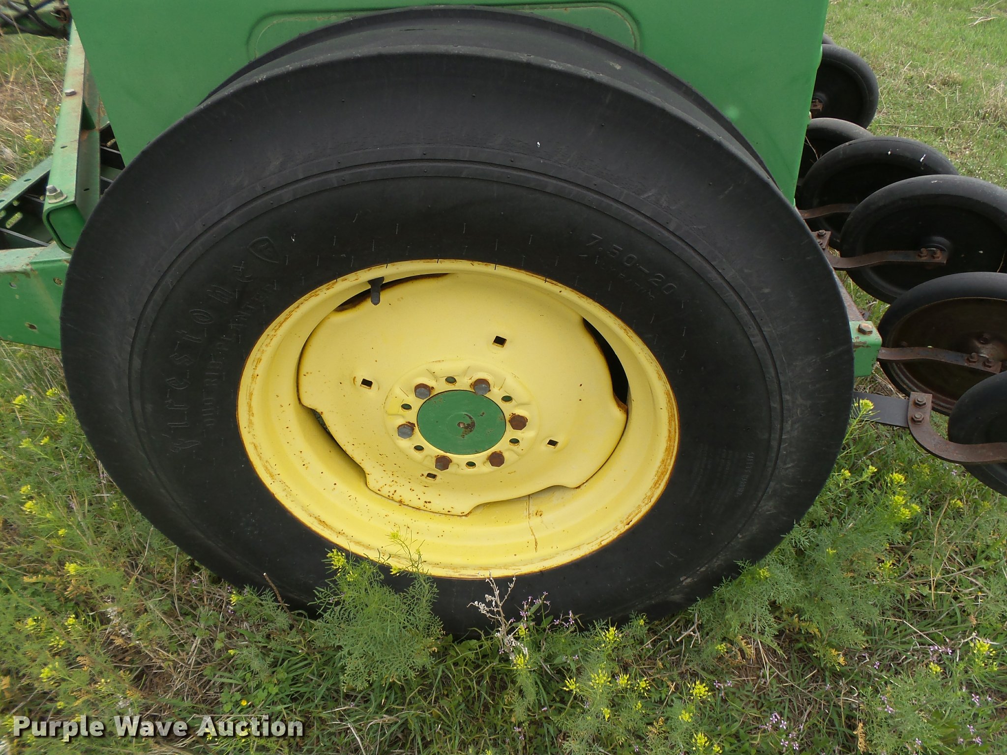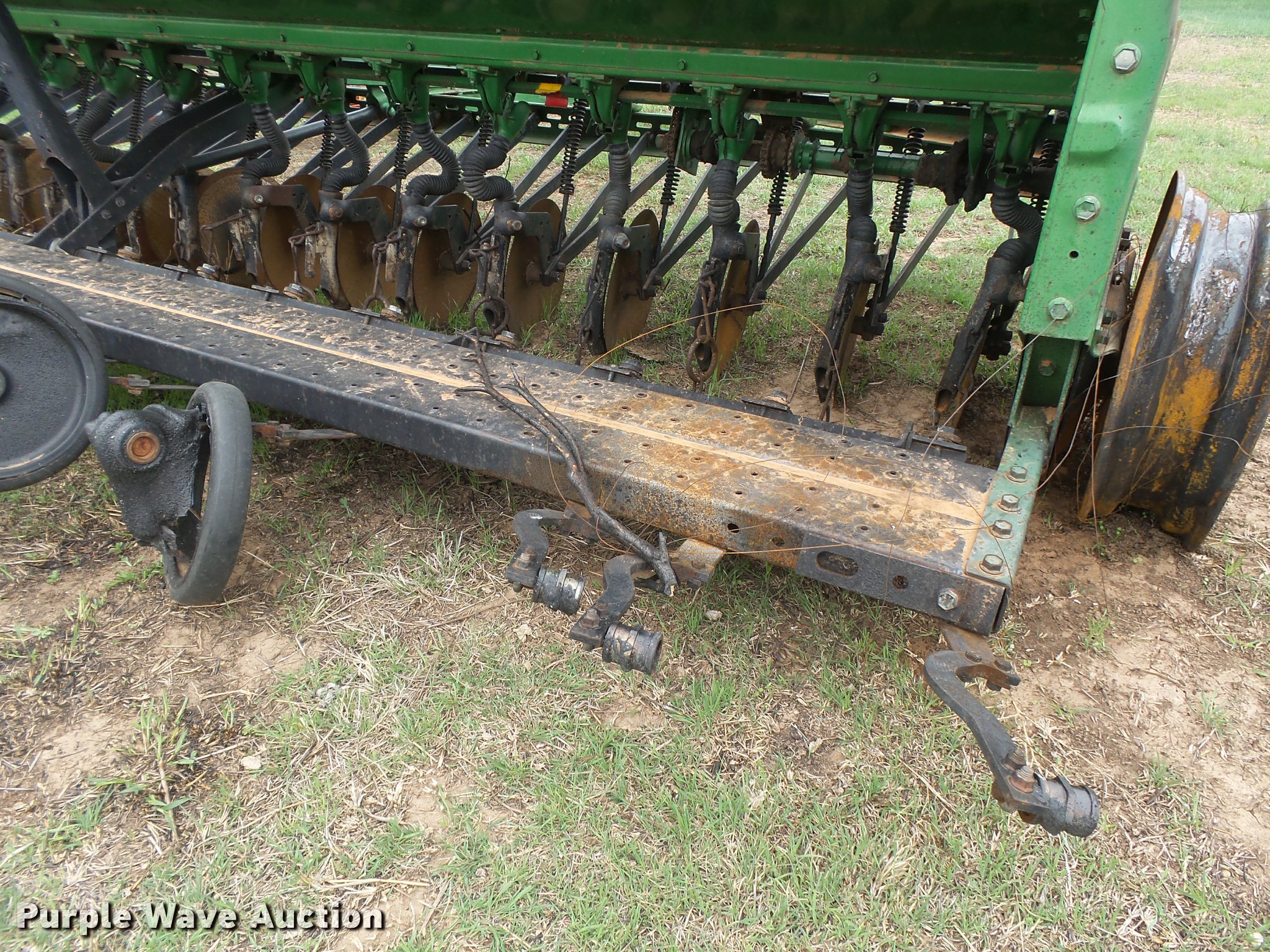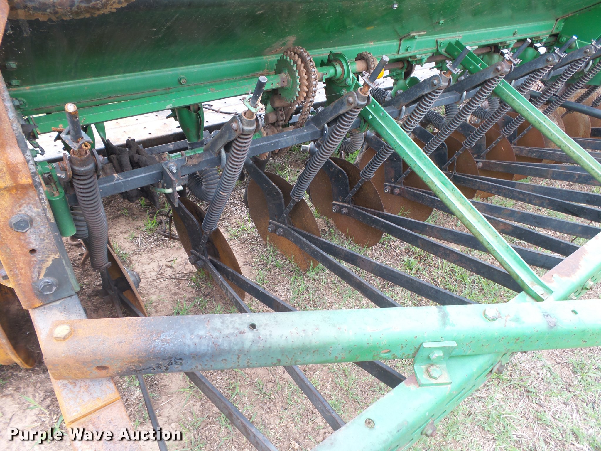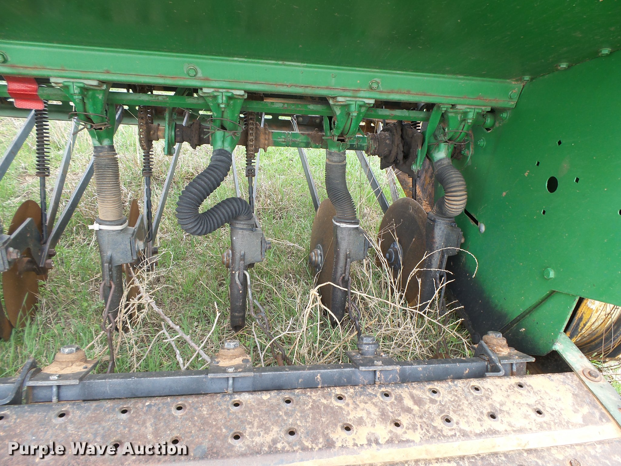Purple Wave is selling a used Grain Drill or Seeder in Kansas. This item is a (2) John Deere 8300 grain drills with the following: 28'W, 16 row units, 10" row spacing, Hydraulic wing fold, Bulk fill system, Single disk opener, Single rubber closing system, Pin hitch, Double drill hitch, (2) P215/70R15 transport tires, (2) 7.50-20 drive/outside tires, Fire damage, Serial 041692, 011203, Unit# A304640P00
