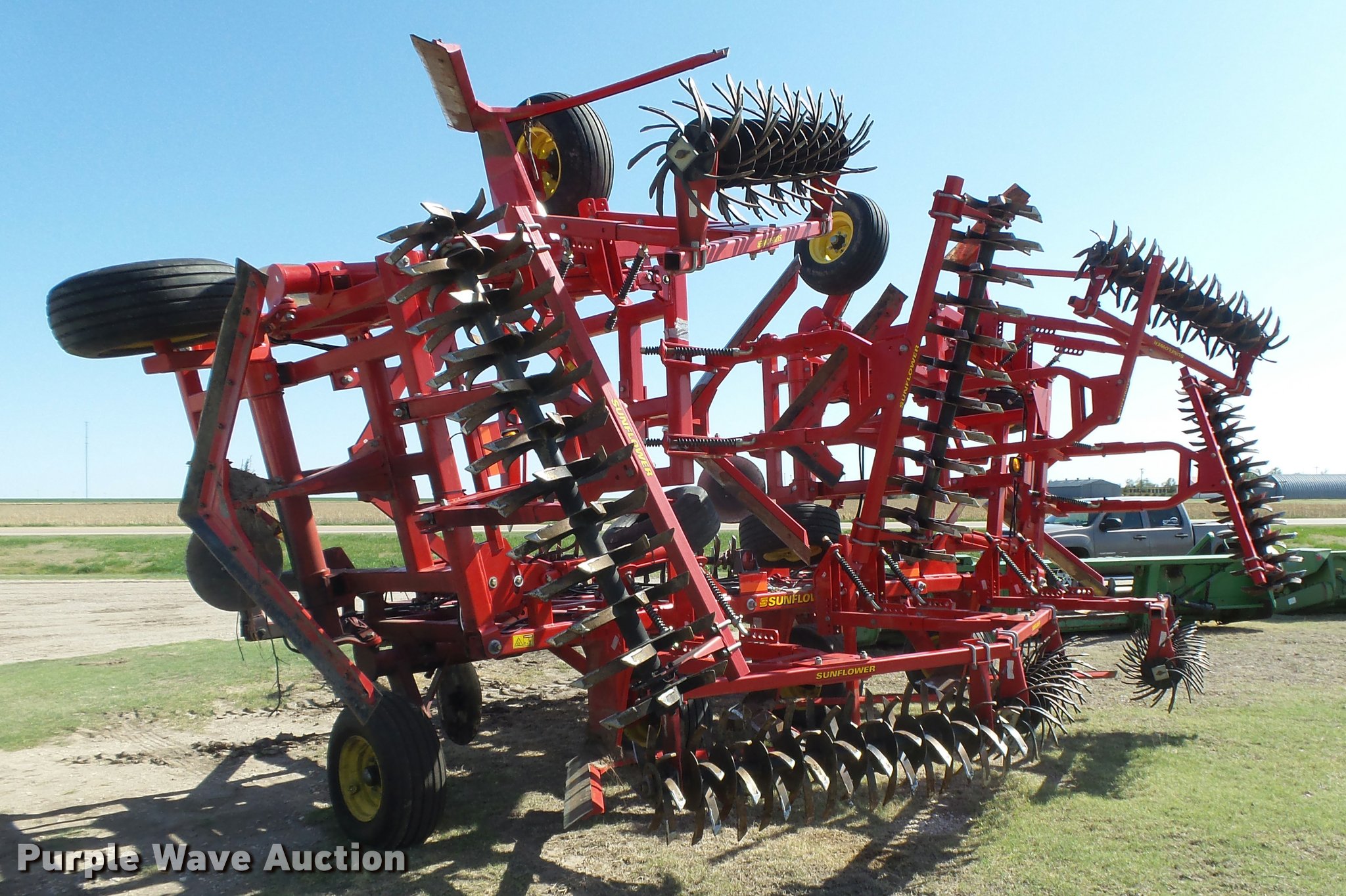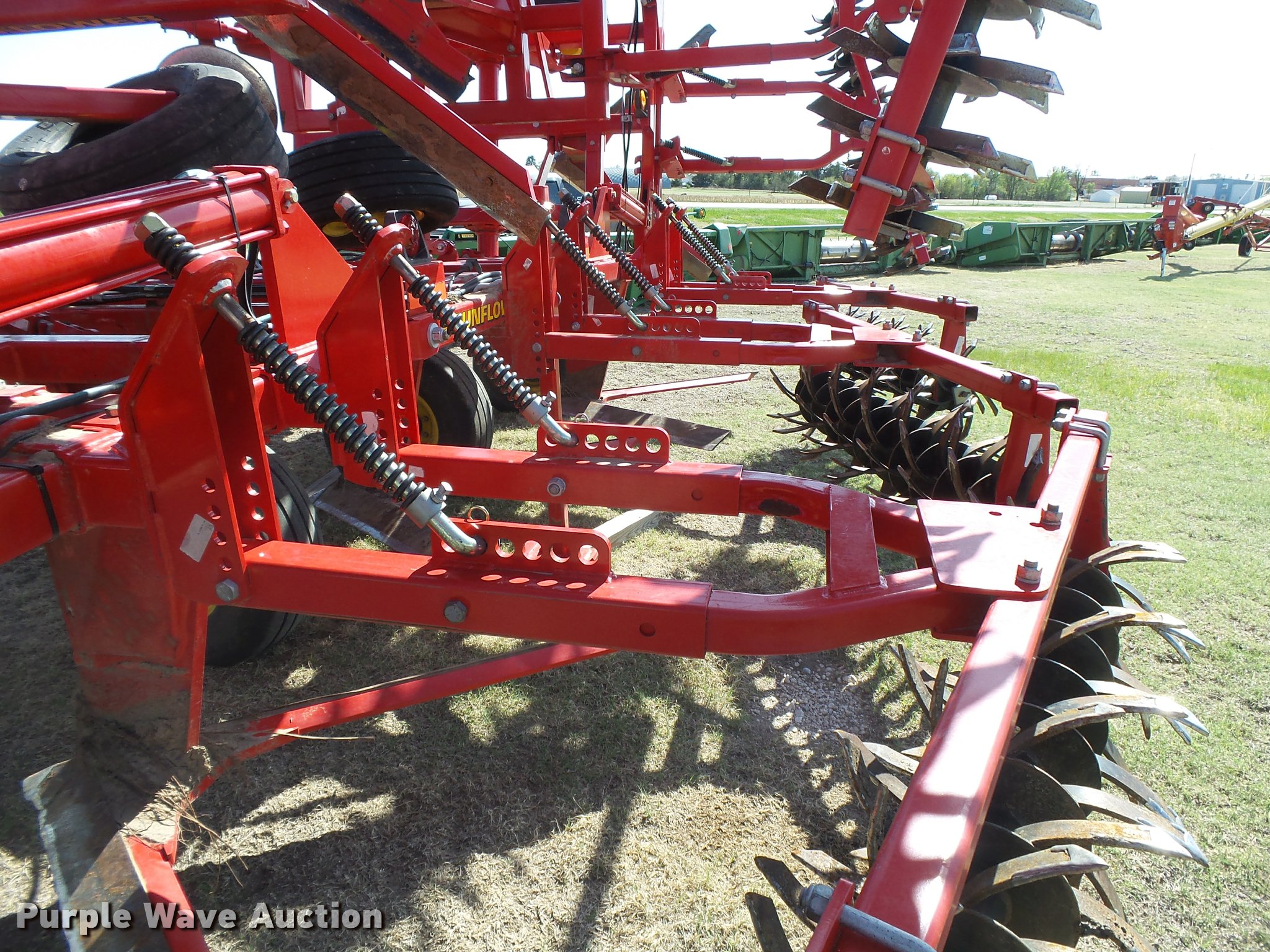Purple Wave is selling a used Field Cultivator or Sweep Plow in Kansas. This item is a 2014 Sunflower 3392-52 9X6 sweep plow with the following: 52'W overall, (9) 72" sweep width, Rolling pickers/treader, Manual leveler, Hydraulic lift and fold, Slab hitch, 12.5L-15 tires, Fire damage, Broken frog, blade, and picker, Bent wheel, Serial AGCS33920EZ300004-52