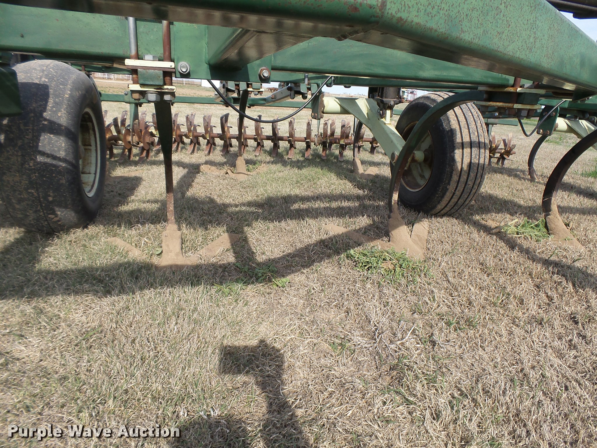 Purple Wave is selling a used Field Cultivator or Sweep Plow in Kansas. This item is a QuinStar FM5-35 field cultivator with the following: 35'W, (20) 26"W sweeps, Rolling pickers/treader, Hydraulic lift and fold, Slab hitch, 11L-15 tires, (2) hydraulic cylinders leaking, Serial FM8812177