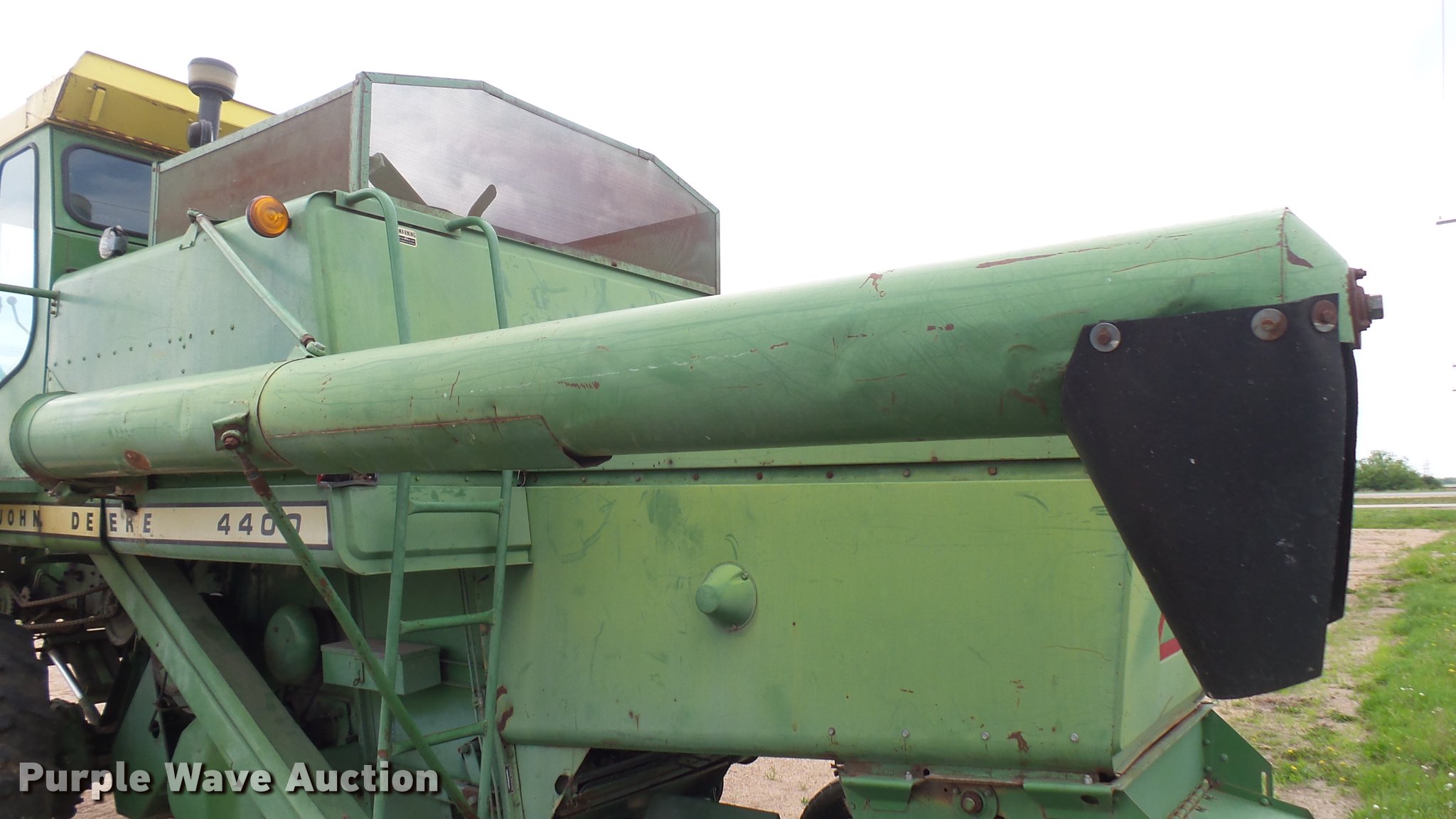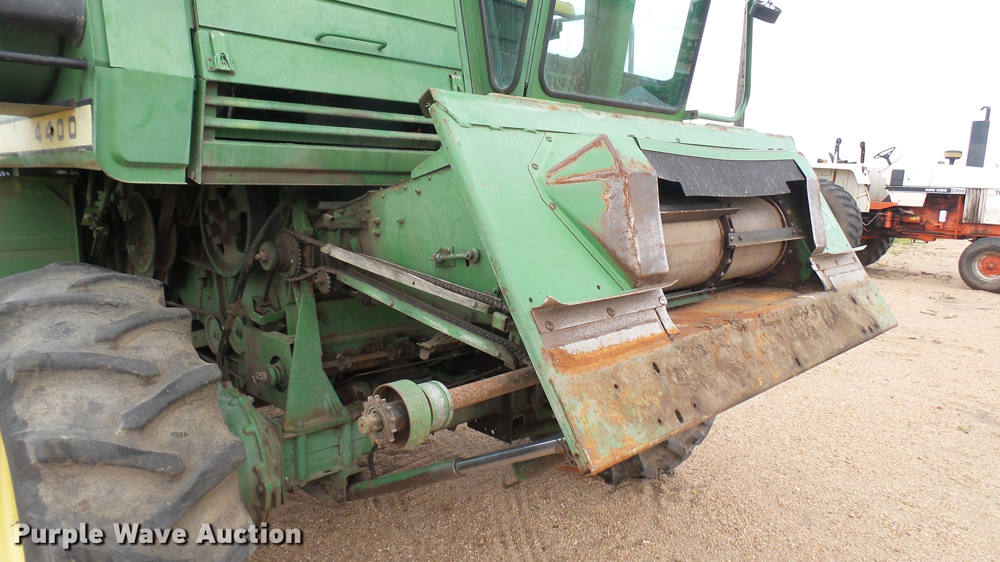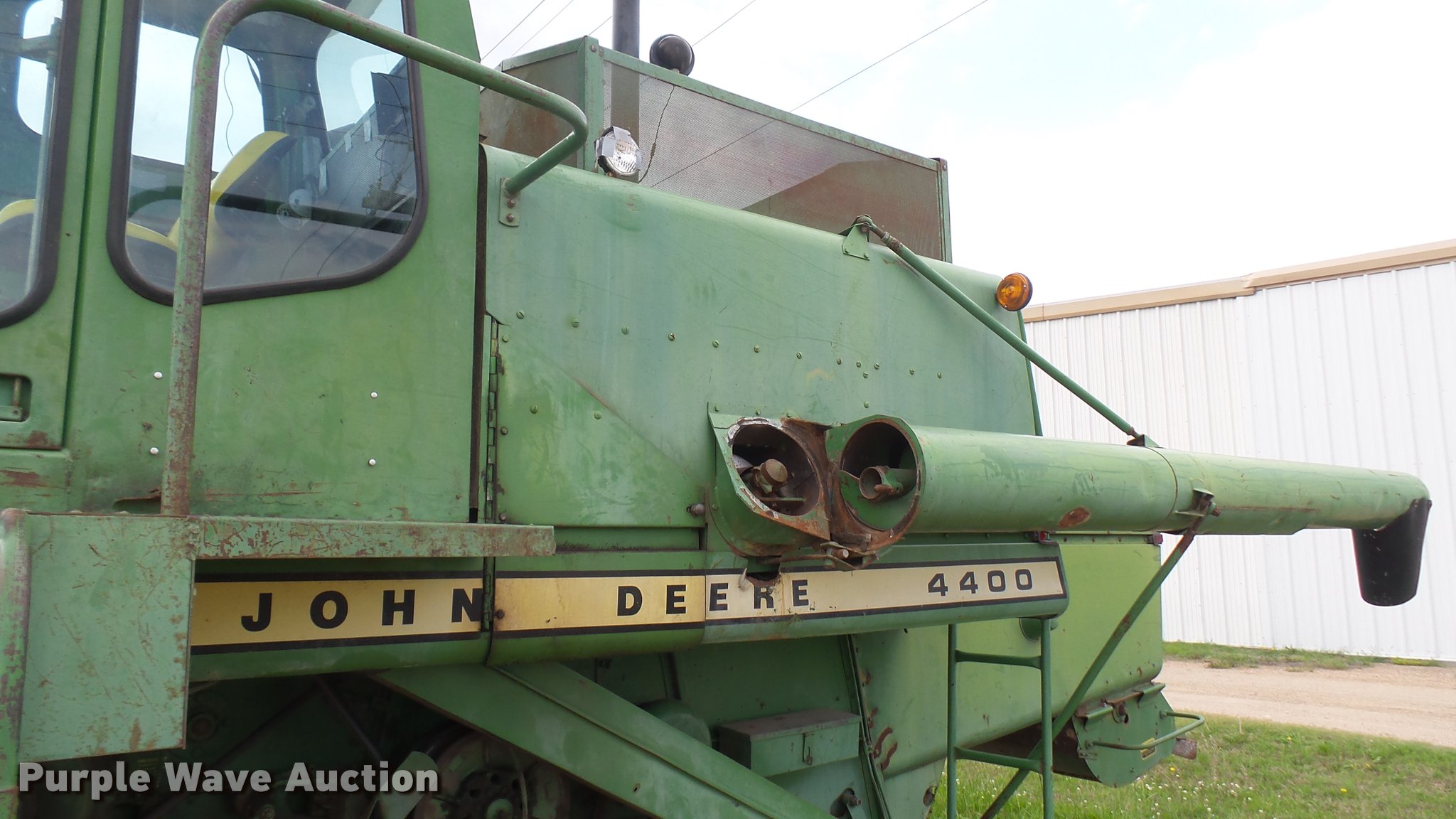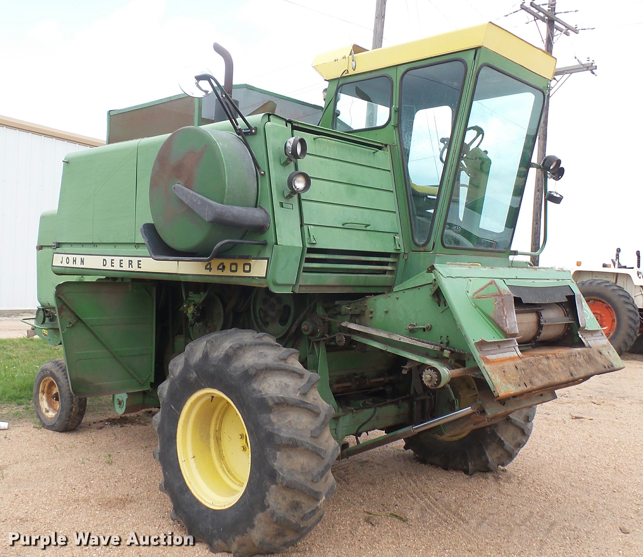 Purple Wave is selling a used Combine in Kansas. This item is a 1975 John Deere 4400 combine with the following: 3,042 engine hours on meter, John Deere six cylinder diesel engine, Hydrostatic transmission, 4F-4R gears, AC and heat, Work lights, Straw chopper, 18.4-26 front tires, 245/75R16 rear tires, Serial 15253H
