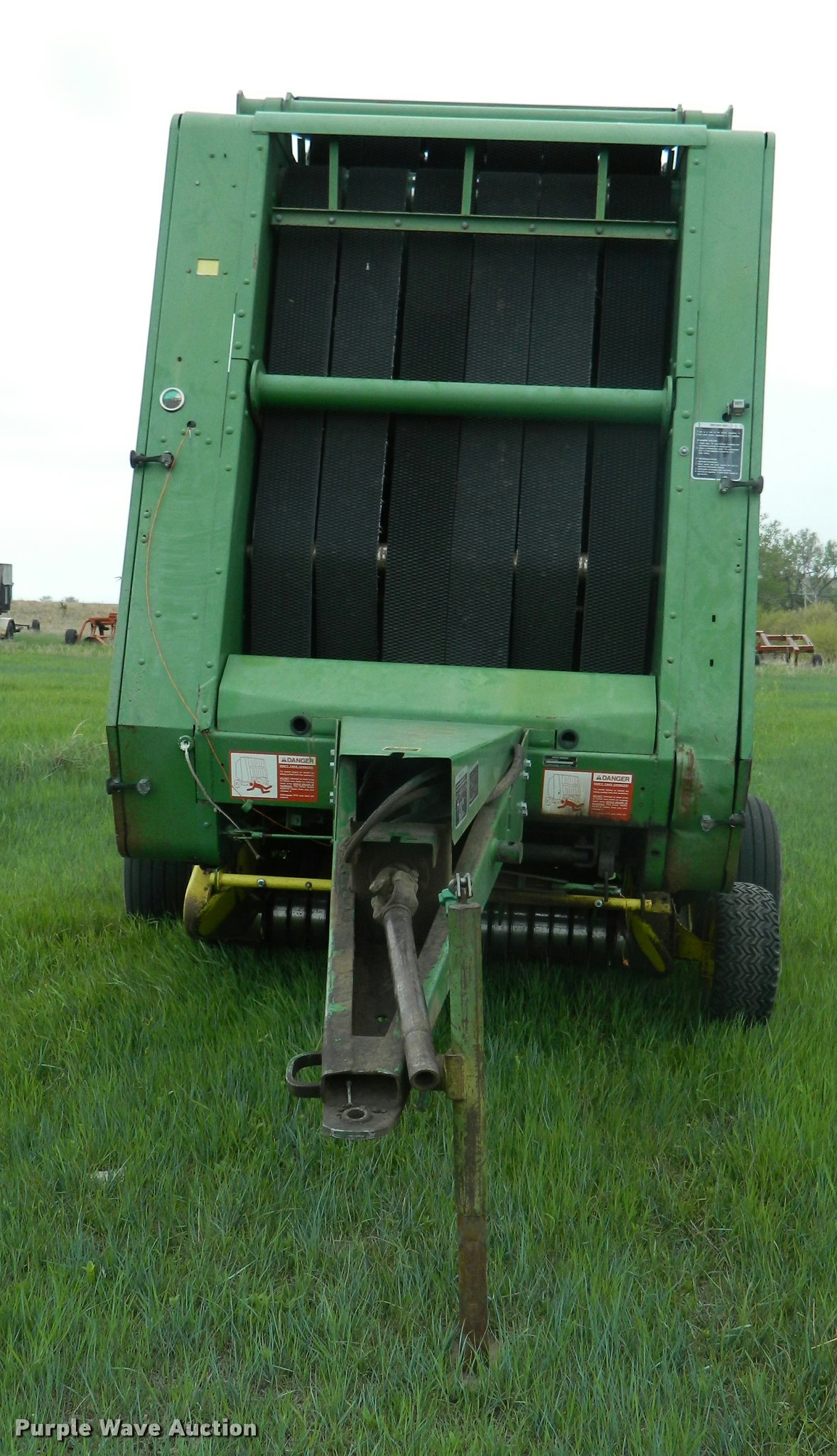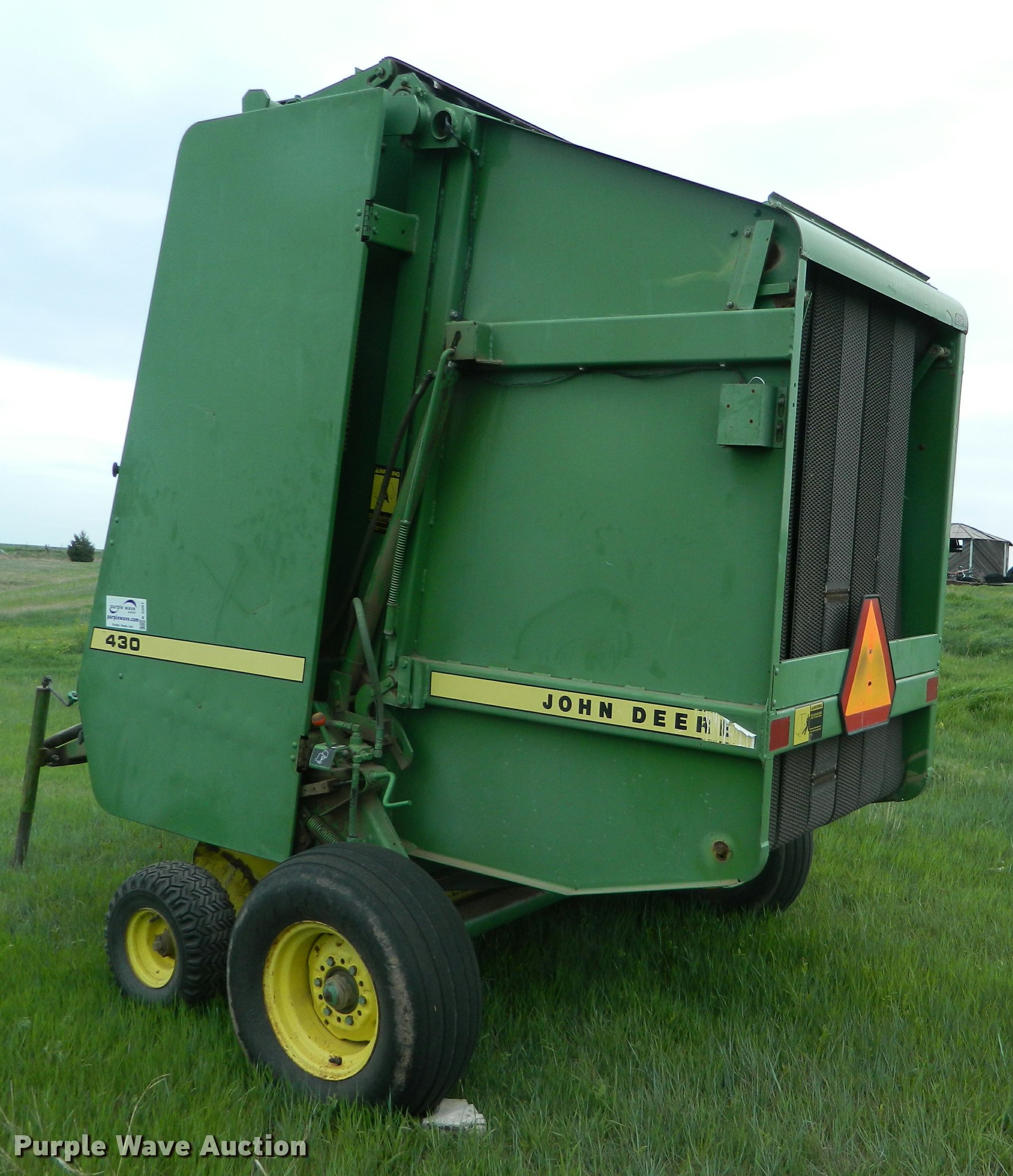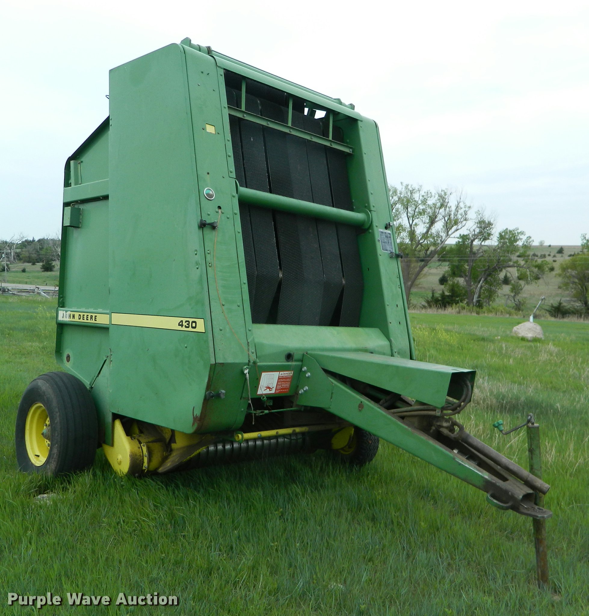 Purple Wave is selling a used Round Baler in Kansas. This item is a 1984 John Deere 430 round baler with the following: 4' x 6' bale capacity, 52"W pickup, 8.50x8 gauge wheels, John Deere 430 monitor, Auto-tie, Twine tie, 540 PTO, Pin hitch, 11L-14 tires, Operator manual, Serial E00430X655183