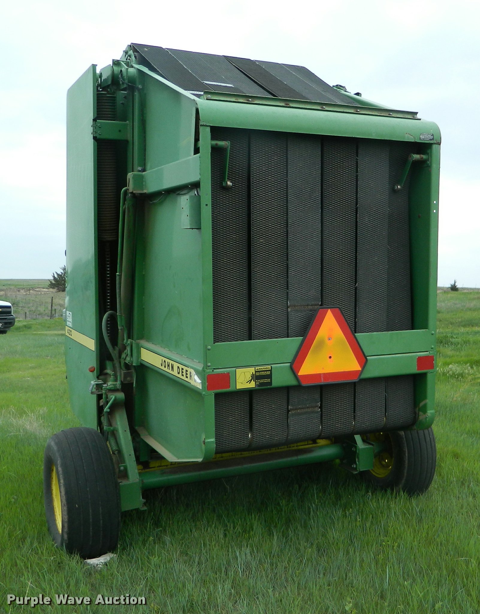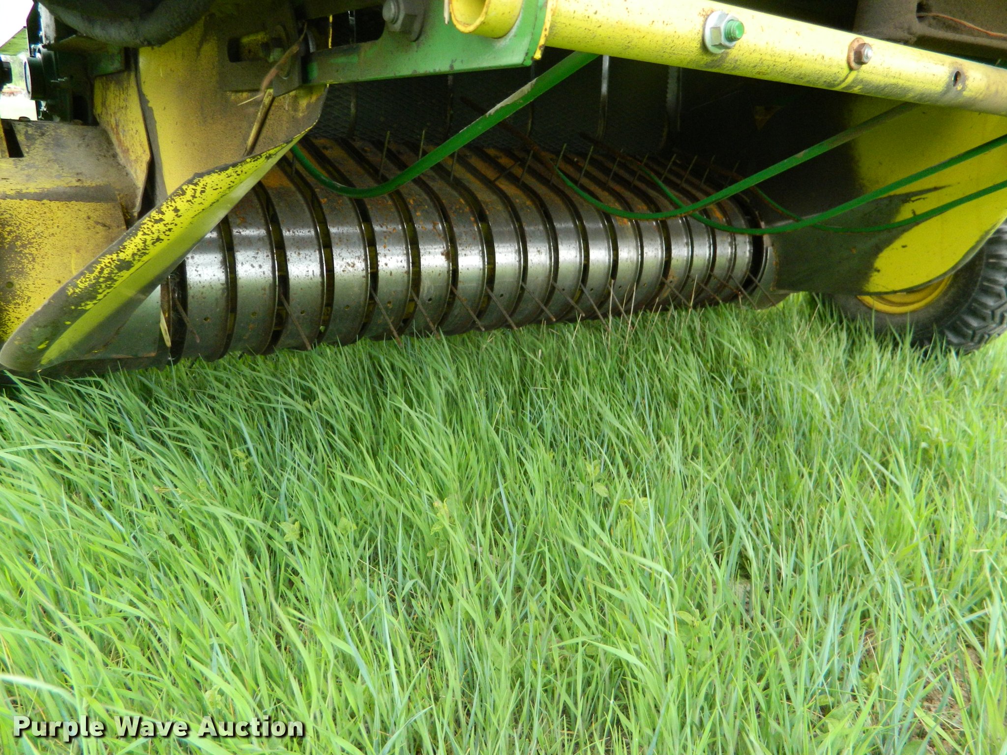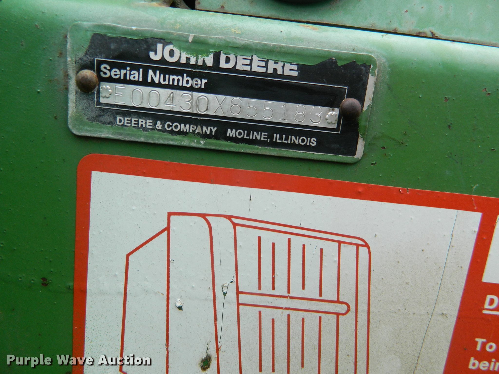 Purple Wave is selling a used Round Baler in Kansas. This item is a 1984 John Deere 430 round baler with the following: 4' x 6' bale capacity, 52"W pickup, 8.50x8 gauge wheels, John Deere 430 monitor, Auto-tie, Twine tie, 540 PTO, Pin hitch, 11L-14 tires, Operator manual, Serial E00430X655183