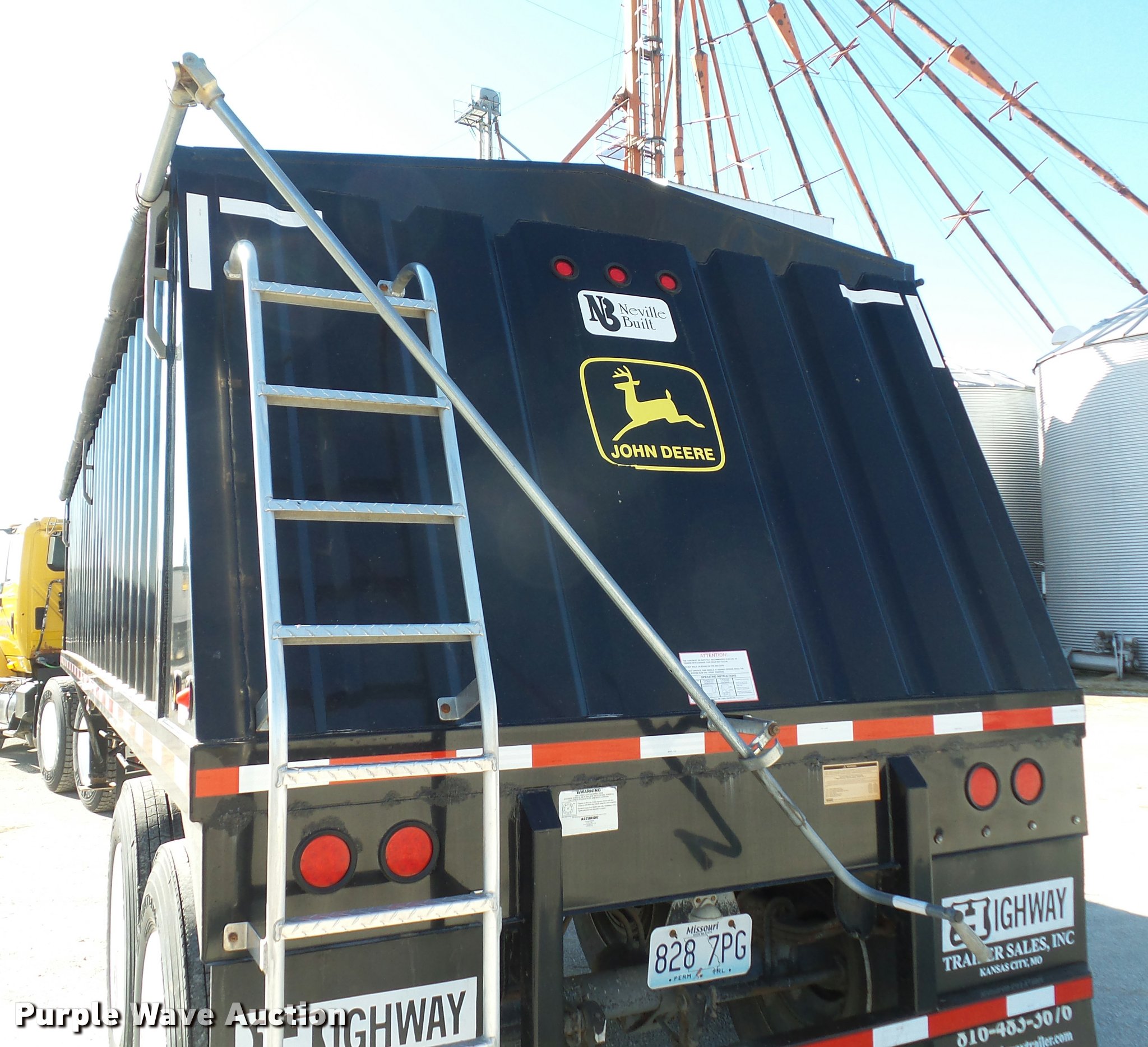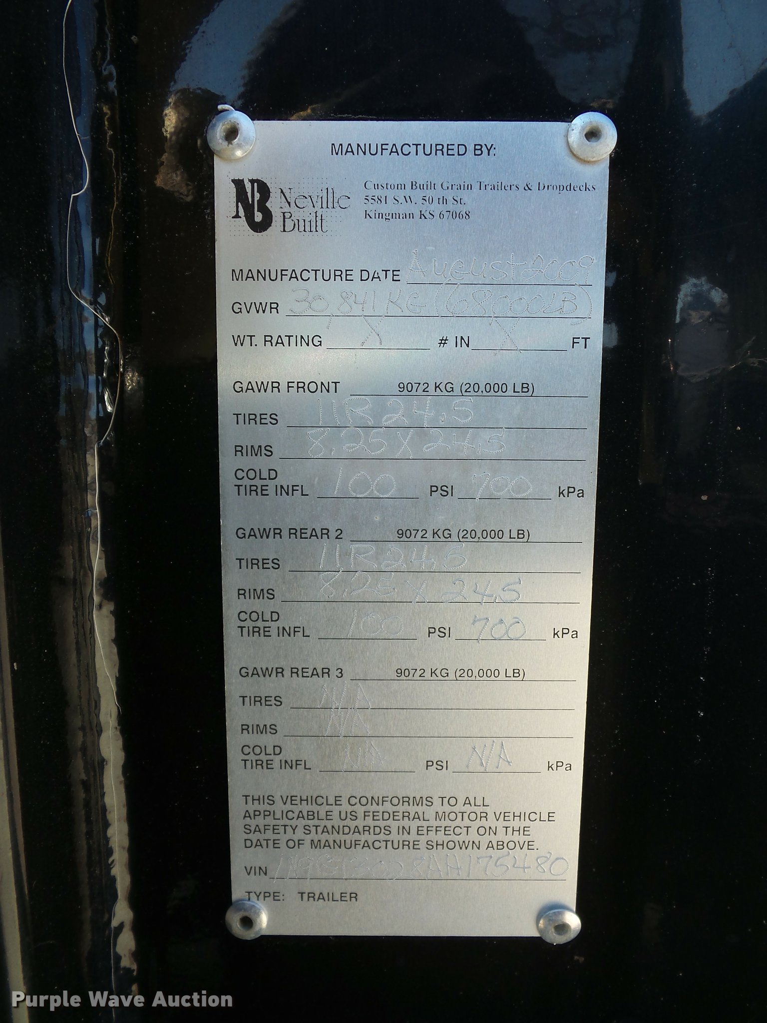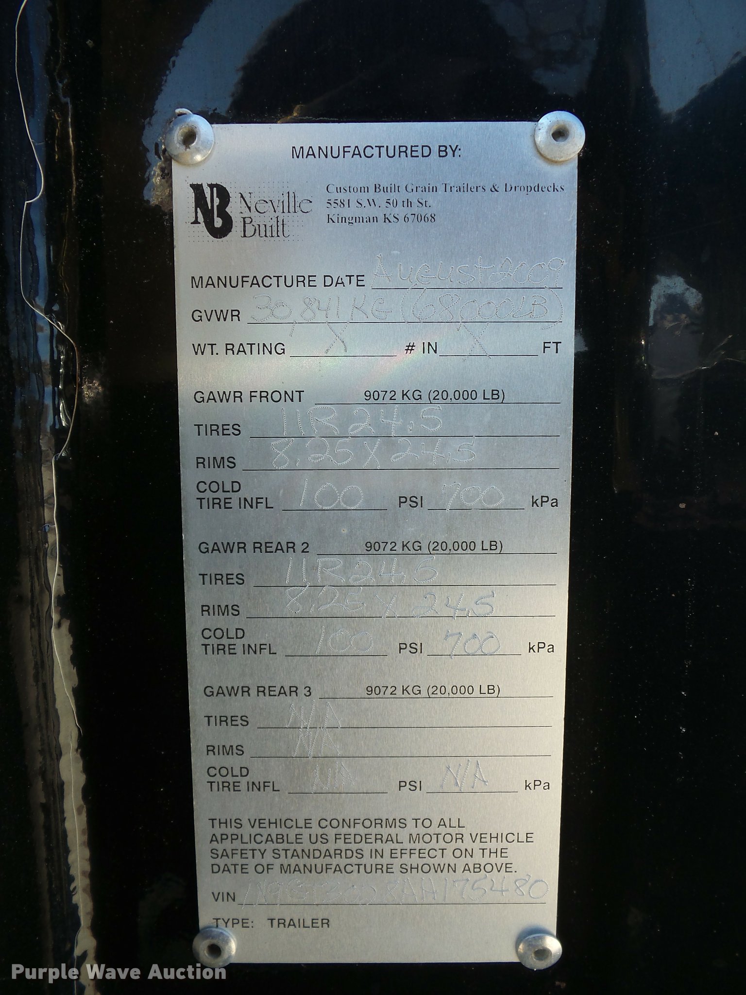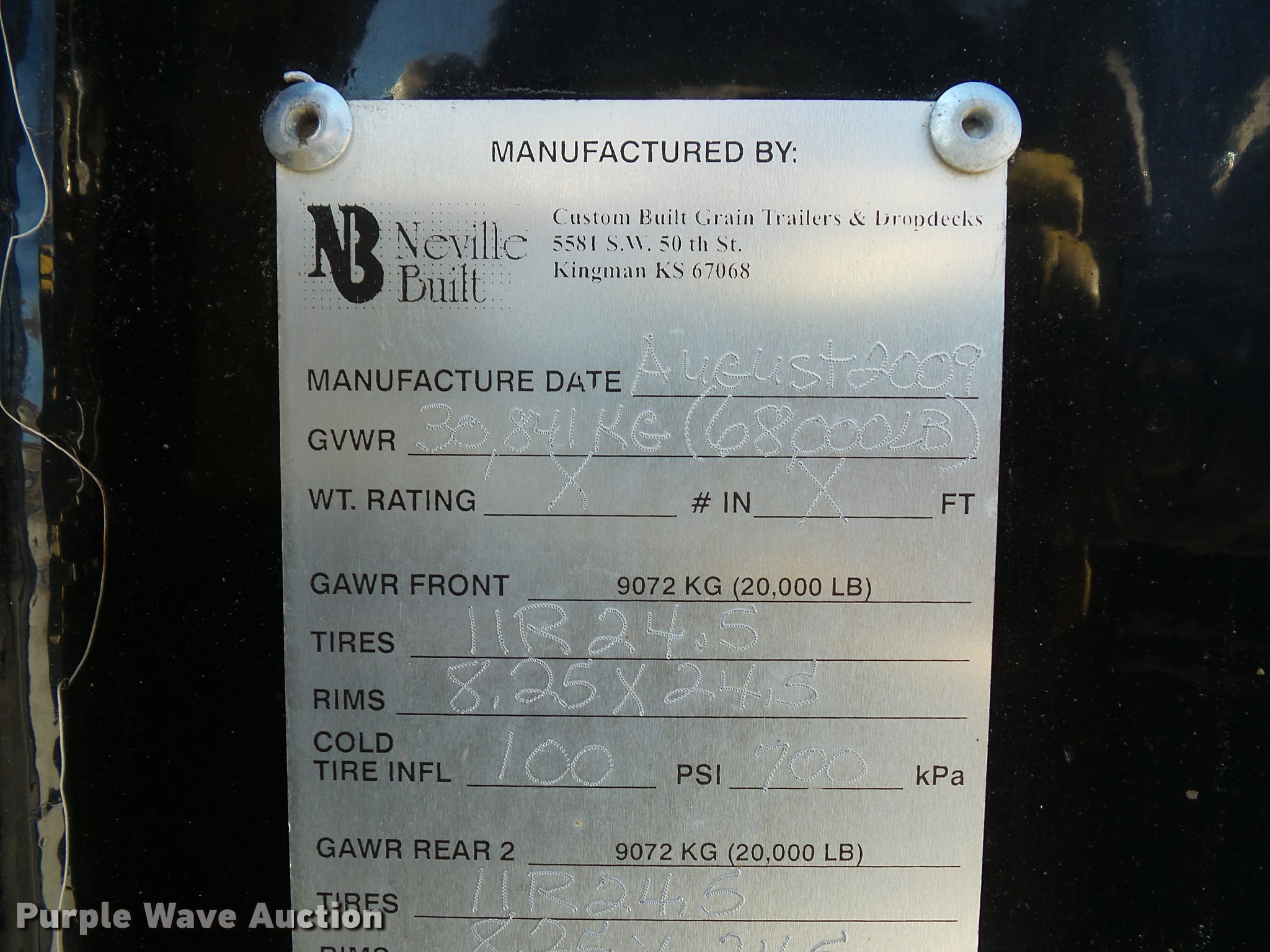 Purple Wave is selling a used Grain or Commodity Trailer in Missouri. This item is a 2010 Neville Built double hopper grain trailer with the following: 30'L x 100"W, Tarp, Front and rear ladders, Fifth wheel hitch, Manual jacks, Spring suspension, Air brakes, Tandem axle, 11R24.5 tires, GVWR 68,000 lbs, GAWR 20,000 lbs, Spring suspension, Air brakes