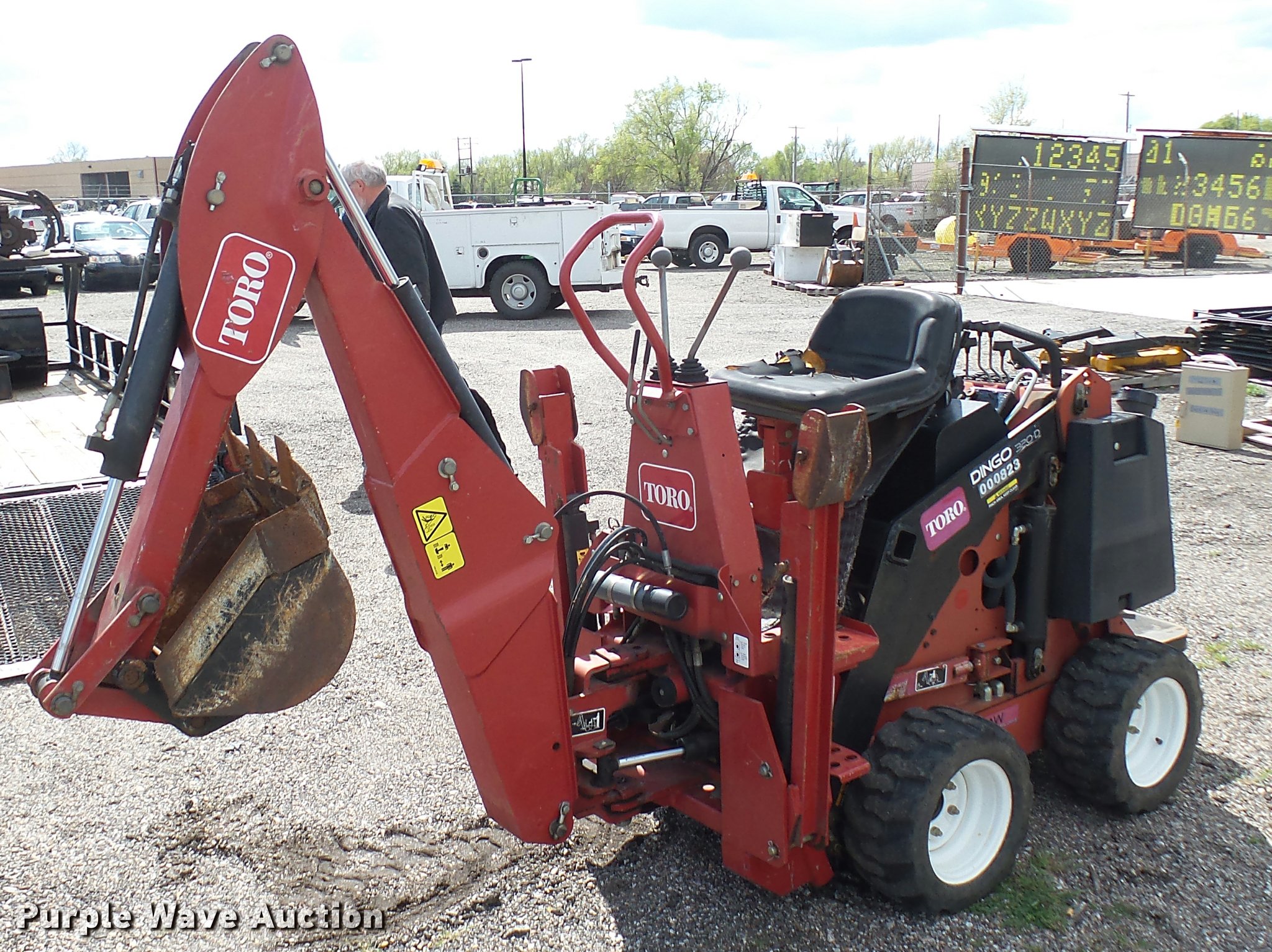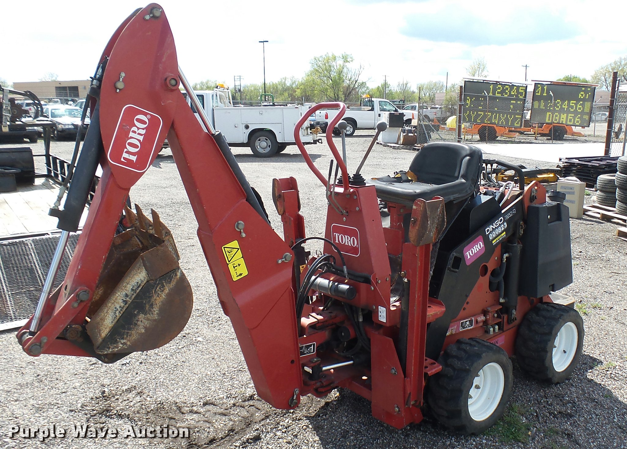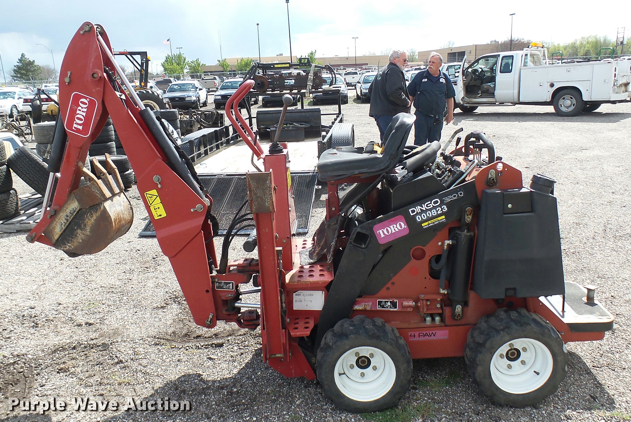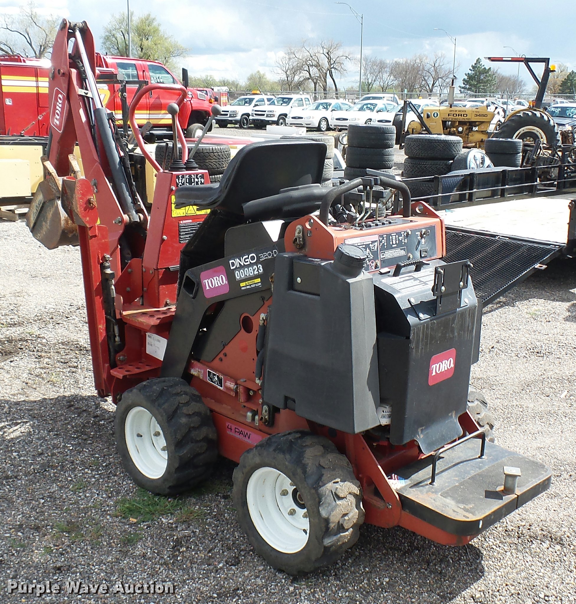 Purple Wave is selling a used Compact Utility Loader in Kansas. This item is a Toro Dingo 320D compact utility loader with the following: 470 hours on meter, Kubota three cylinder diesel engine, Hydrostatic transmission, Independent four wheel drive, Operators platform, 4-Paw, Rear counterweight, 18x8.50-10 tires, Serial 190884, Toro backhoe attachment, Model 23163, Two stick controls, 36" stick, 12"W bucket, Three teeth, Operators seat, Hydraulic outriggers, Toro 22414 blade, 48"W, Weld-on cutting edge, Hydraulic angle, Toro loader bucket, 40"W, Weld-on cutting edge, Toro 22470 trencher attachment, 48" bar, 6"W trench, Crumber, Toro auger attachment, (2) dirt bits, Toro fork attachment, 30"W carriage, 36"L fork, Unit# 000823