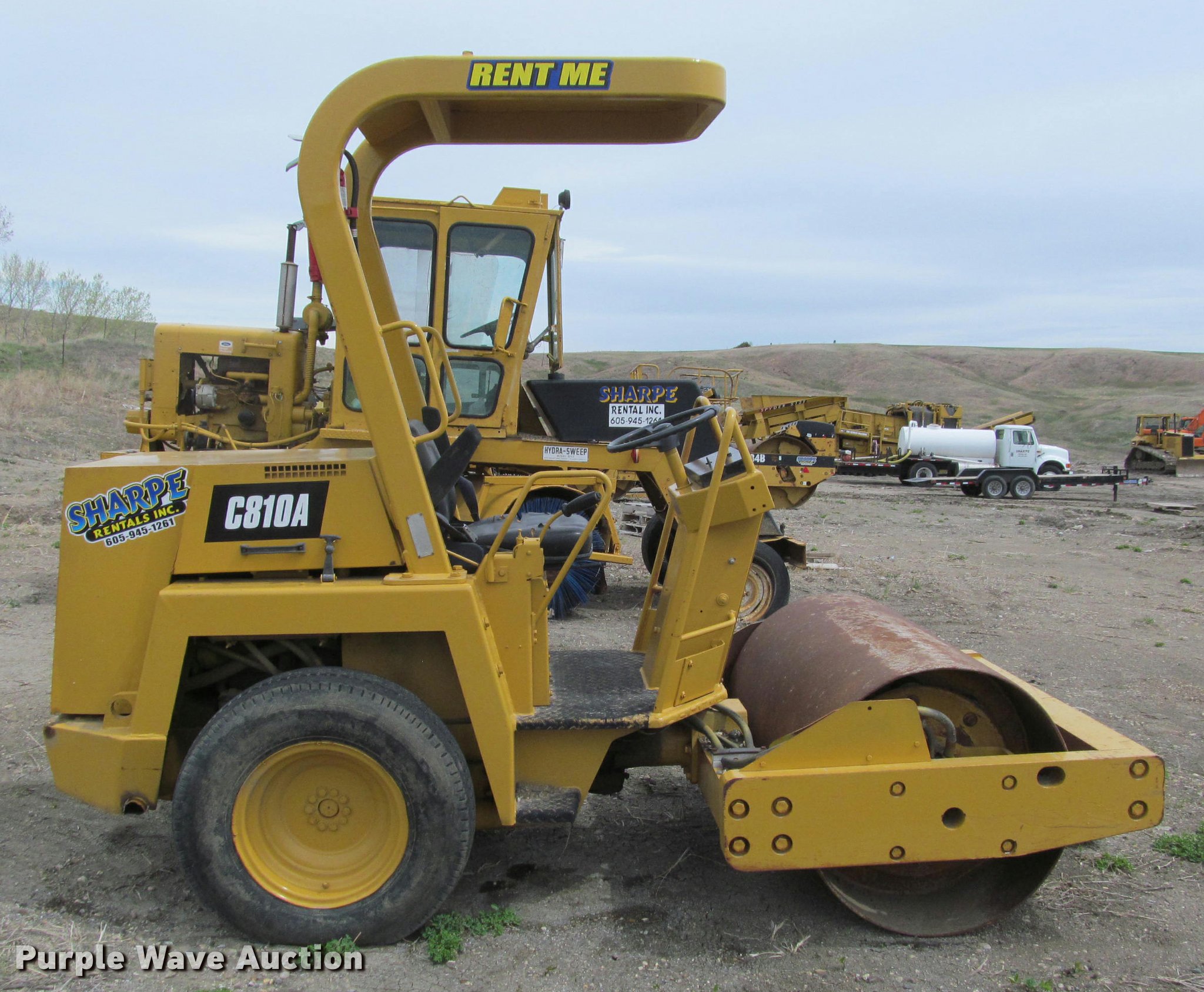 Hypac C810A single drum vibratory roller. 2,136 hours on meter, Deutz F3L101F three cylinder diesel engine Serial 00239796, OROPS, Vandalism cover, 4'W smooth drum, 7.50-16 tires, 6,200 lbs. base operating weight, 5,955 lbs base weight, Serial A219C1949V, Unit# 43002. Sharpe Rentals, Inc. - Inspection available May 18 and 19. 720 N Garfield Ave. Pierre, SD 57501