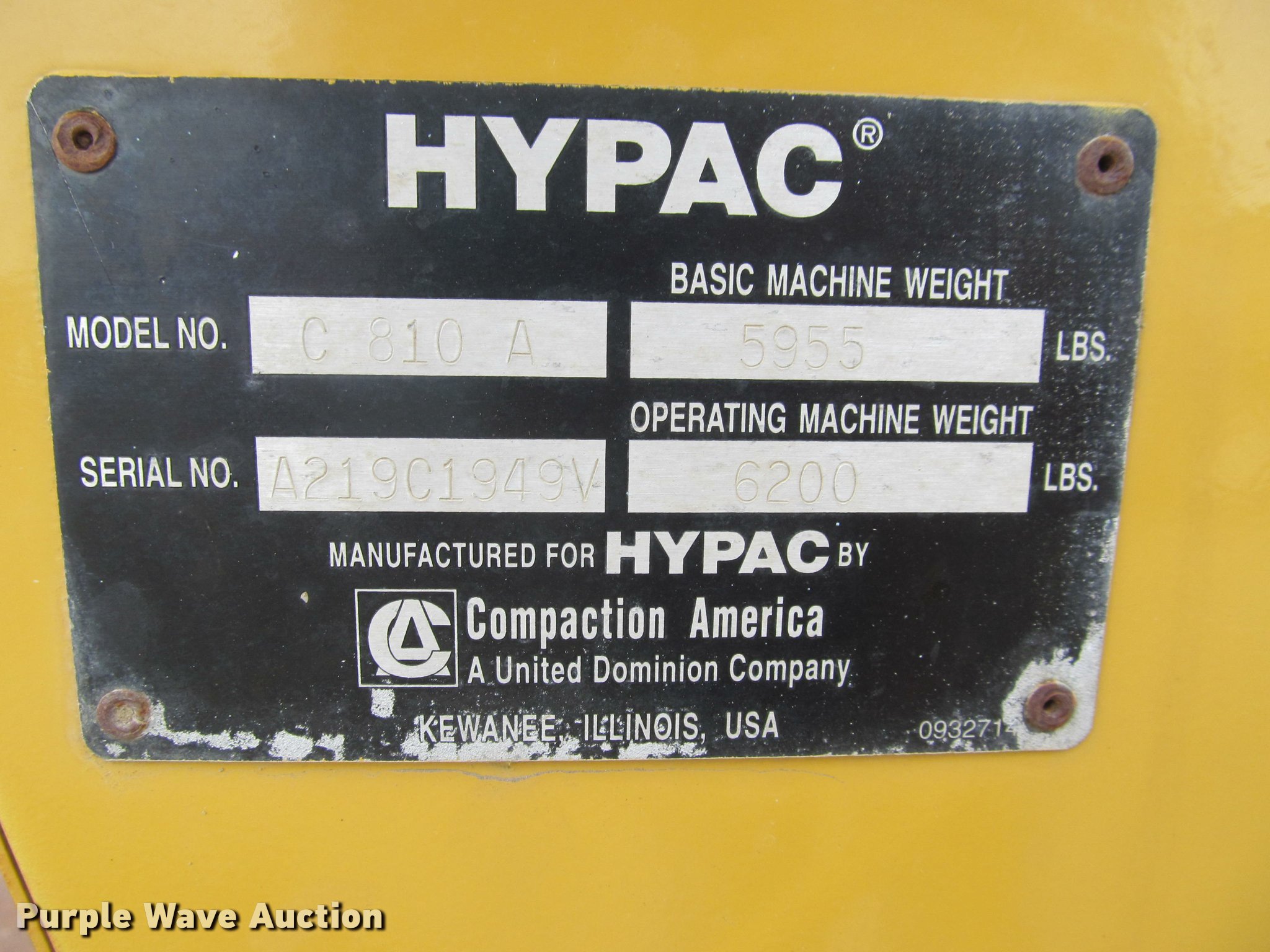 Purple Wave is selling a used Single Drum Roller Compactor in South Dakota. This item is a Hypac C810A single drum vibratory roller with the following: 2,136 hours on meter, Deutz F3L101F three cylinder diesel engine, Serial 00239796, OROPS, Vandalism cover, 4'W smooth drum, 7.50-16 tires, 6,200 lbs. base operating weight, 5,955 lbs base weight, Serial A219C1949V, Unit# 43002