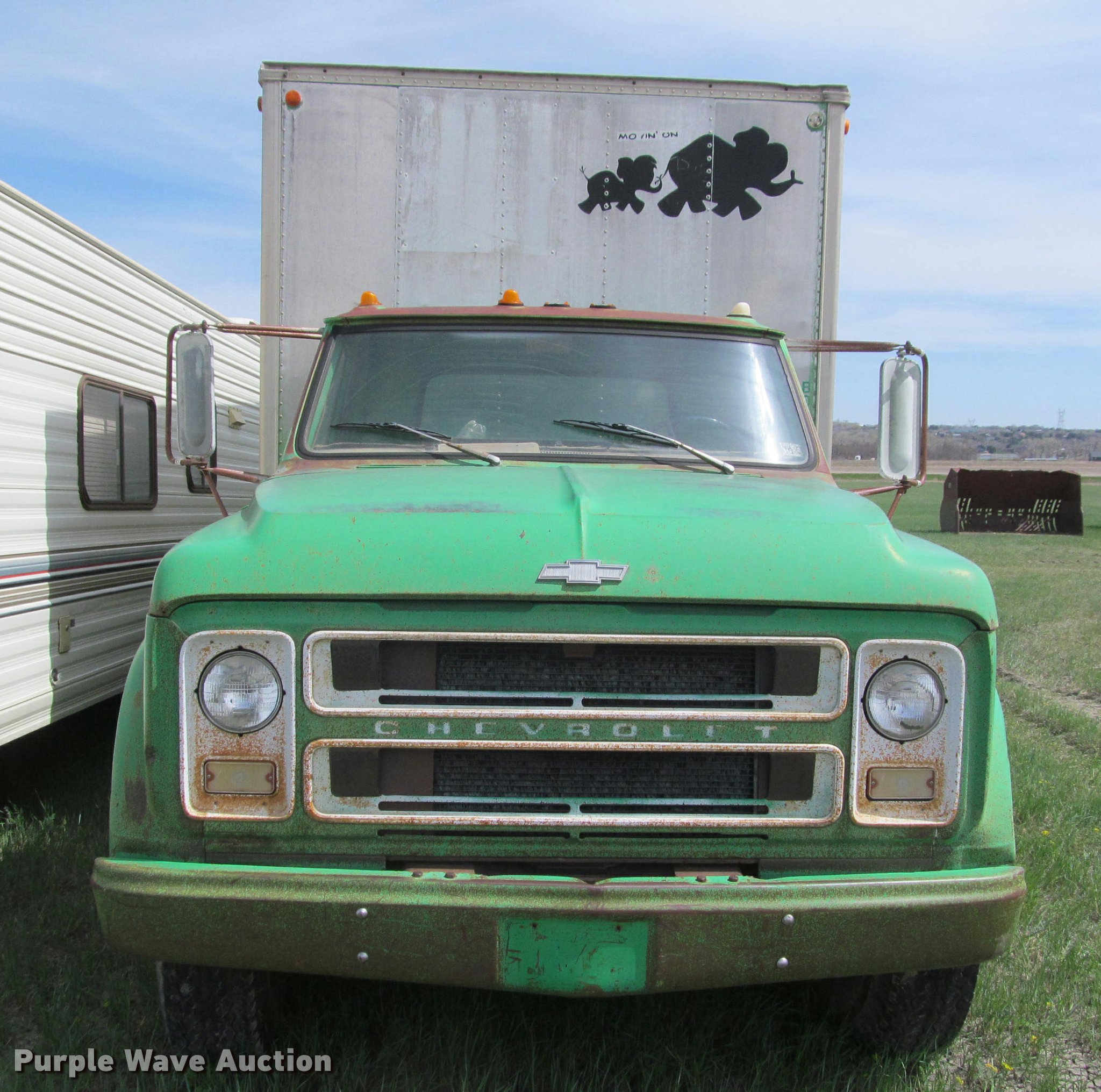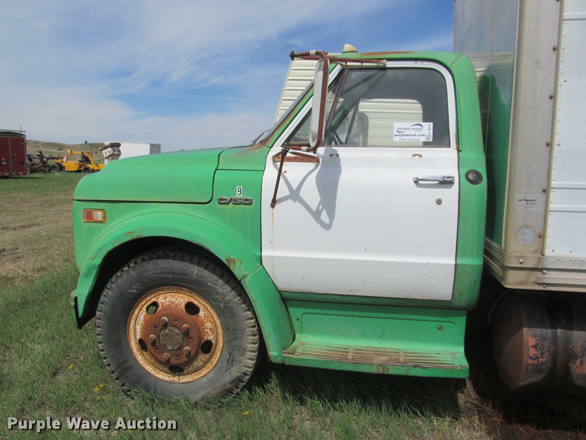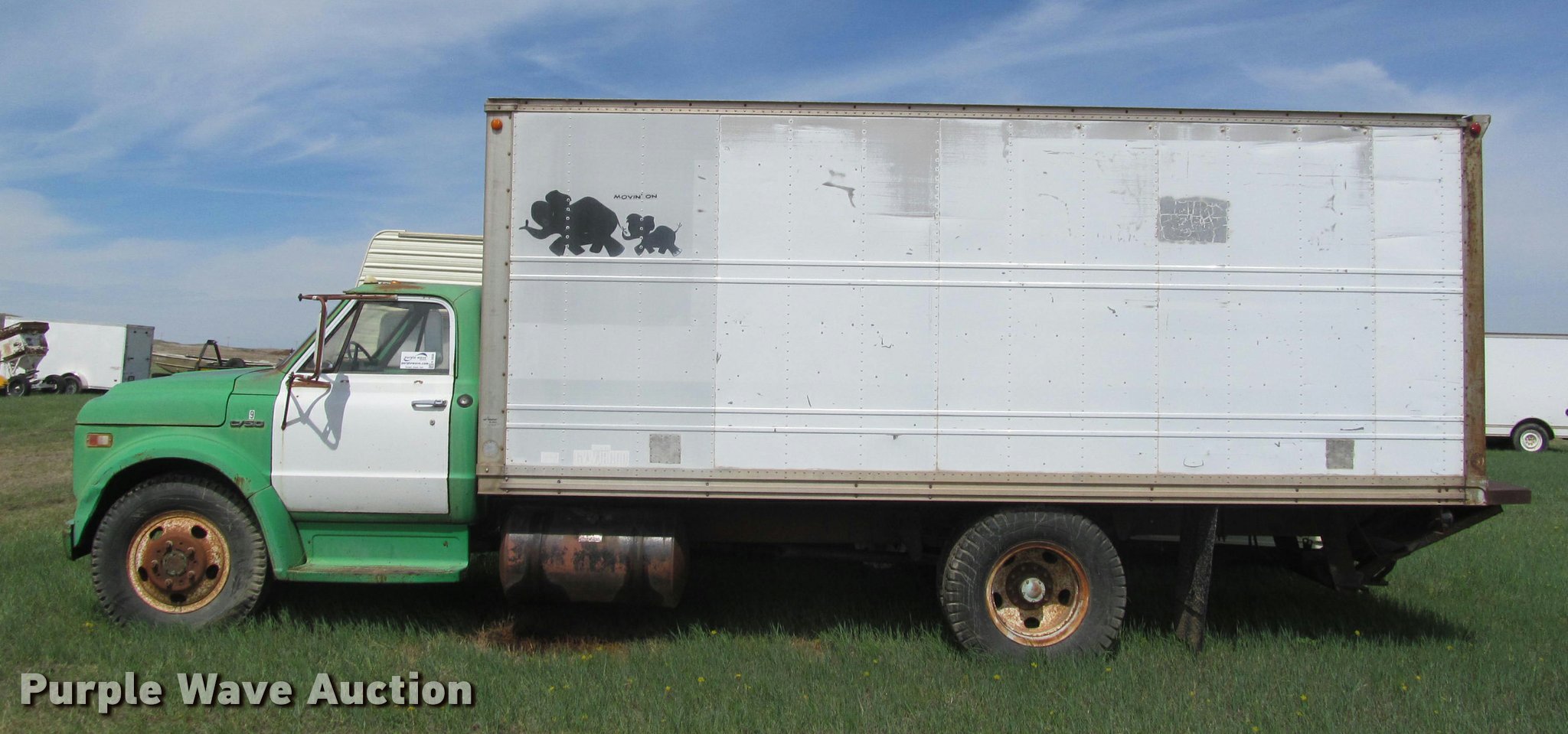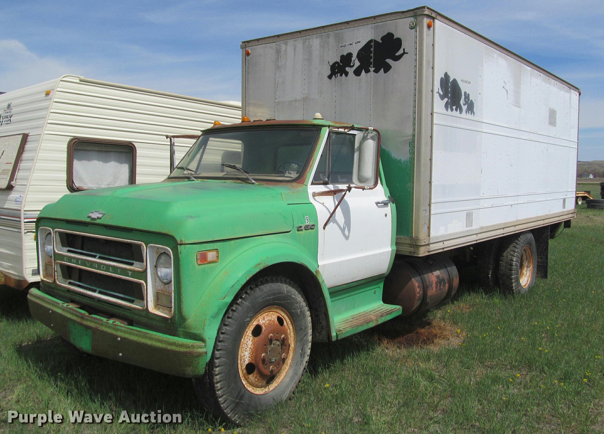 Purple Wave is selling a used Box Truck in South Dakota. This item is a 1970 Chevrolet C50 box truck with the following: 87,540 miles on odometer, V8 5.7L V8 gas engine, Four speed manual transmission, Heat, Manual windows and locks, Cloth interior, PTO, 18'L x 91"W x 7'H box bed, Wood floor, Work bench, End gate lift, Roll-up door, Running boards, Dual fuel tanks, Spring suspension, Hydraulic brakes, 9.00-20 tires, GVWR 18,000-24,000 lbs, Cracked dash, Unit# 11201