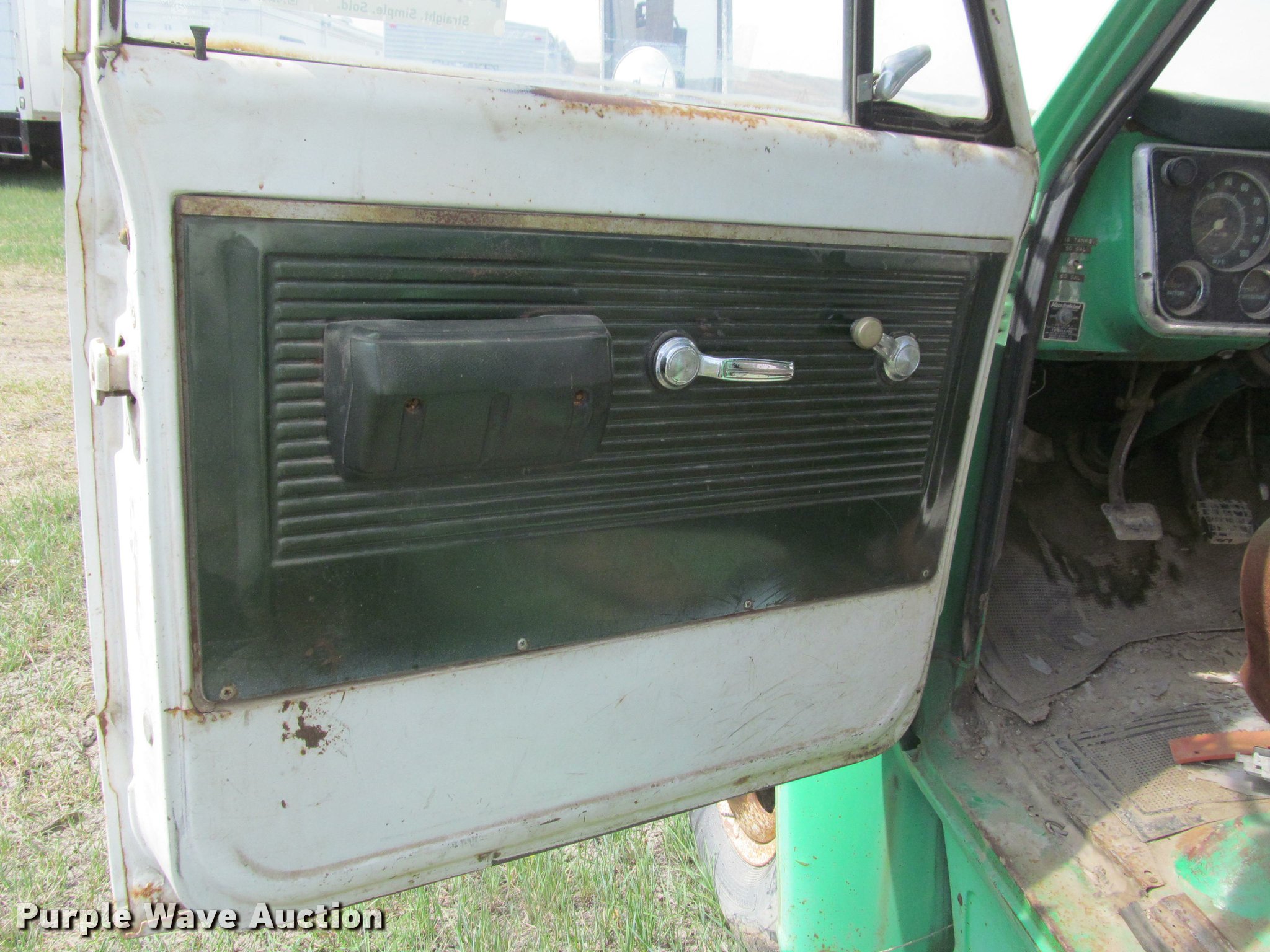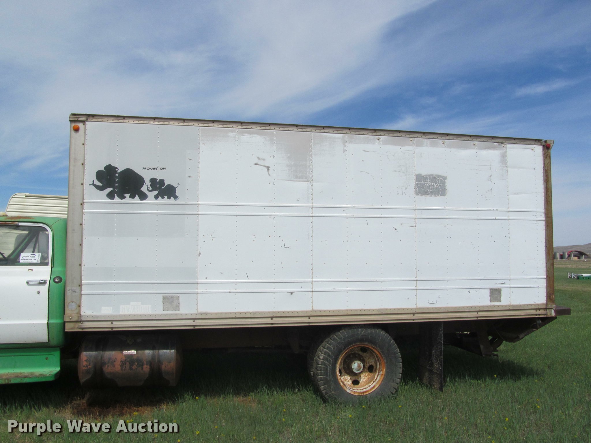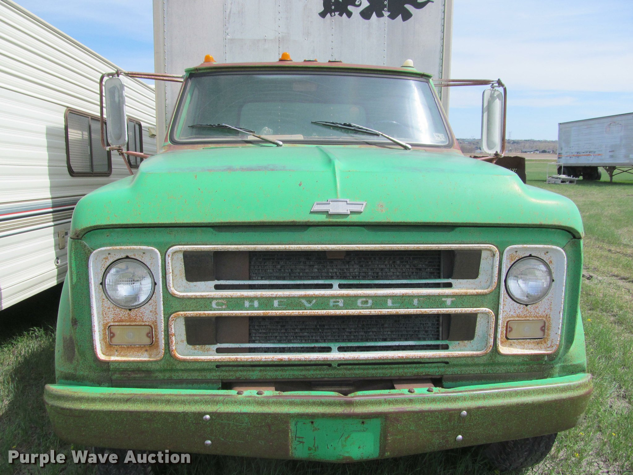 Purple Wave is selling a used Box Truck in South Dakota. This item is a 1970 Chevrolet C50 box truck with the following: 87,540 miles on odometer, V8 5.7L V8 gas engine, Four speed manual transmission, Heat, Manual windows and locks, Cloth interior, PTO, 18'L x 91"W x 7'H box bed, Wood floor, Work bench, End gate lift, Roll-up door, Running boards, Dual fuel tanks, Spring suspension, Hydraulic brakes, 9.00-20 tires, GVWR 18,000-24,000 lbs, Cracked dash, Unit# 11201