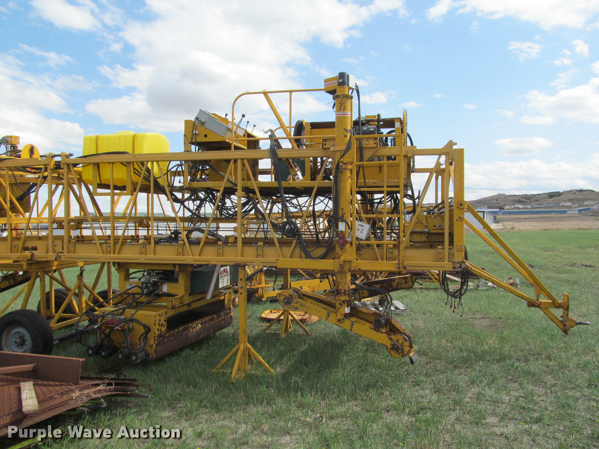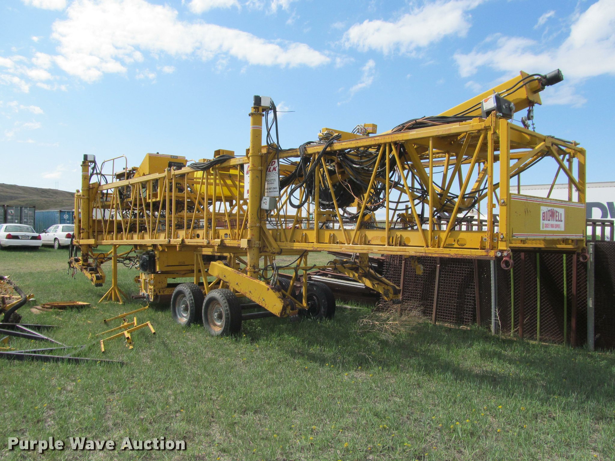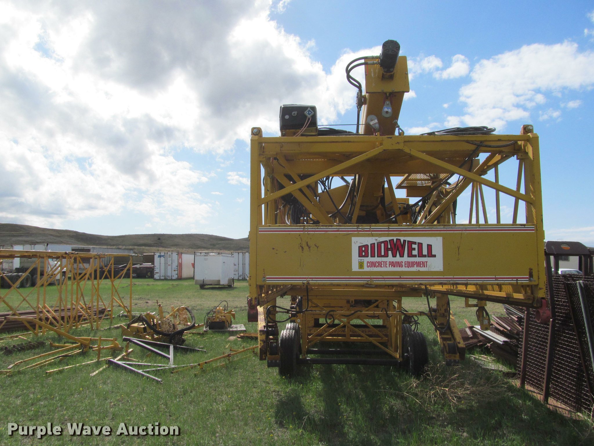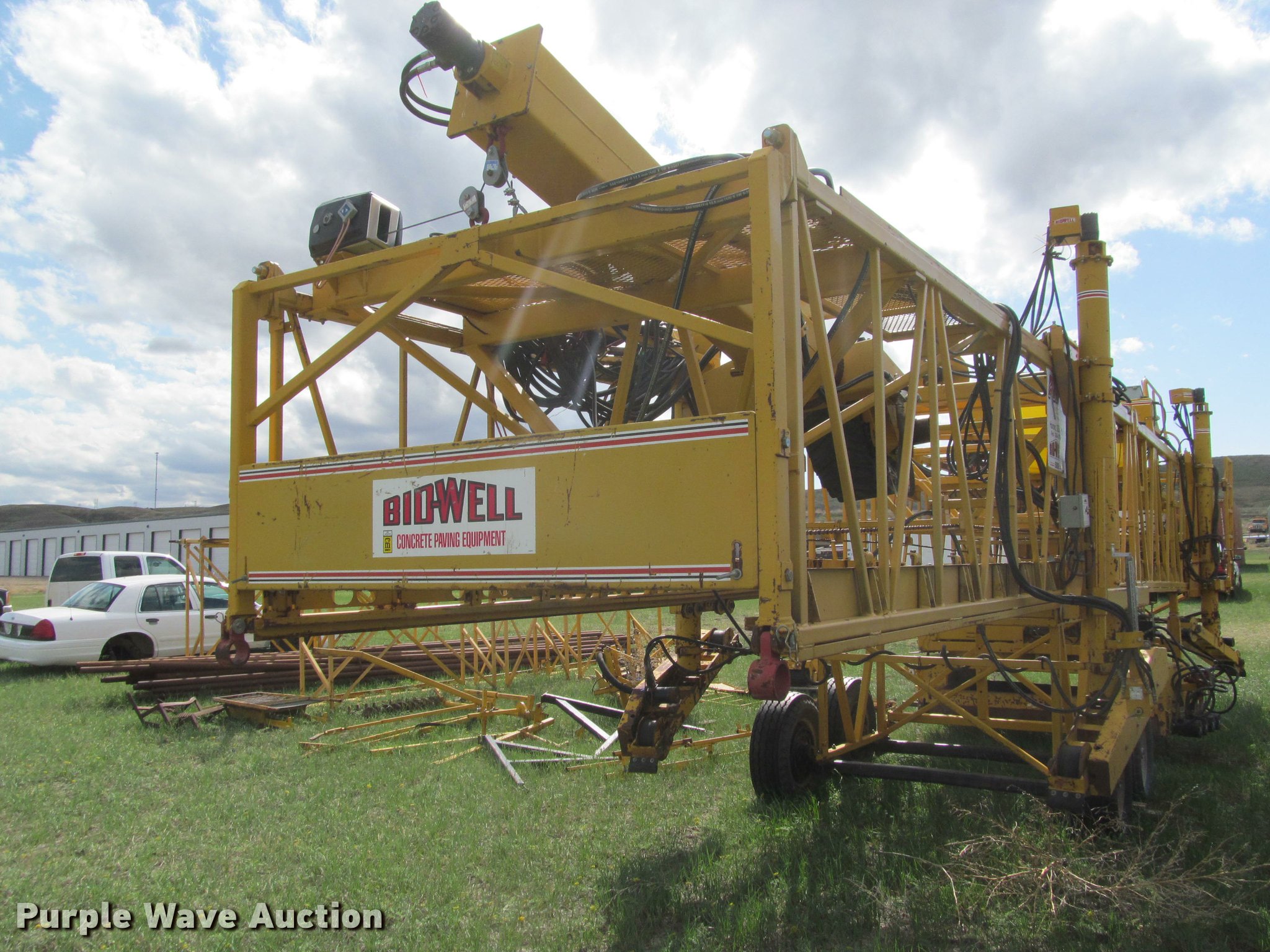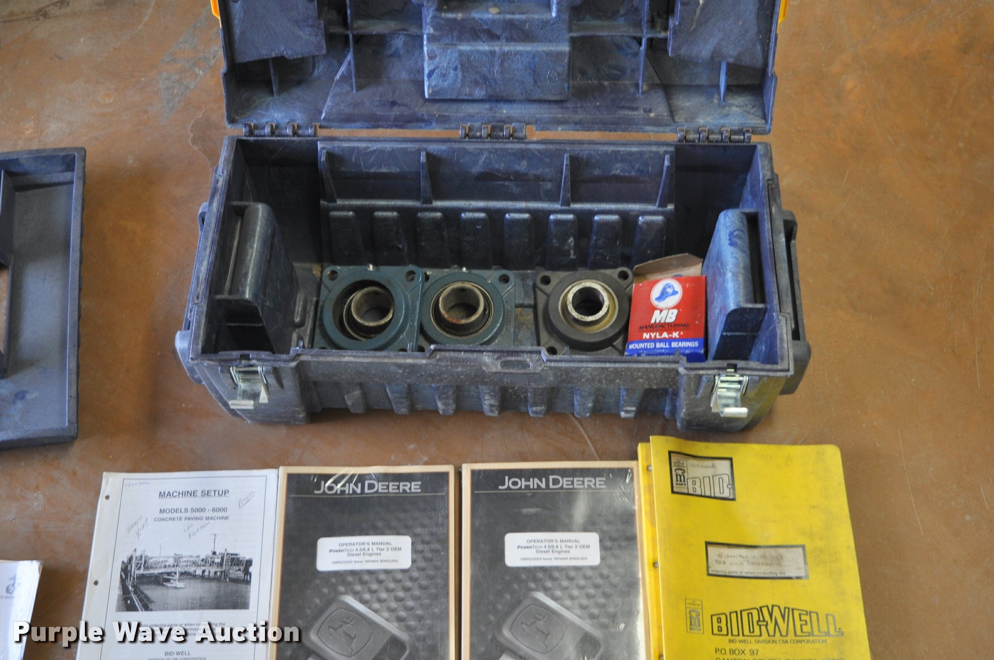 Purple Wave is selling a used Concrete Paver or Curb Machine in South Dakota. This item is a Bid-Well 5000 concrete paver with the following: (2) John Deere 220 three cylinder diesel engines, Model 3015DF05, 354 hours on meter, Serial XCM3015D034303, Model 3015DF05, 459 hours on meter, Serial XCH3015D032813,, Top operators staion, 100 gallon water tank, Paving carriage, Hydraulic swivel, Hydraulic up and down, Dual 6'L steel rollers, Dual carriage travel chains, Grade sensor control, (4) drive bogies, Hydraulic drive, Pintle hitch, Tandem axle, 9.50-16.5 transport tires, GAWR 7,000 lbs, Additional parts included, Assorted brackets, Additional boom extensions, (2) auger bits, Additional rollers for carrier, Approx. 85 additional travel rails, 21'L joints, Approx. 1,750' total,, Manuals, Serial 48.2001964-2-HD-SV-D