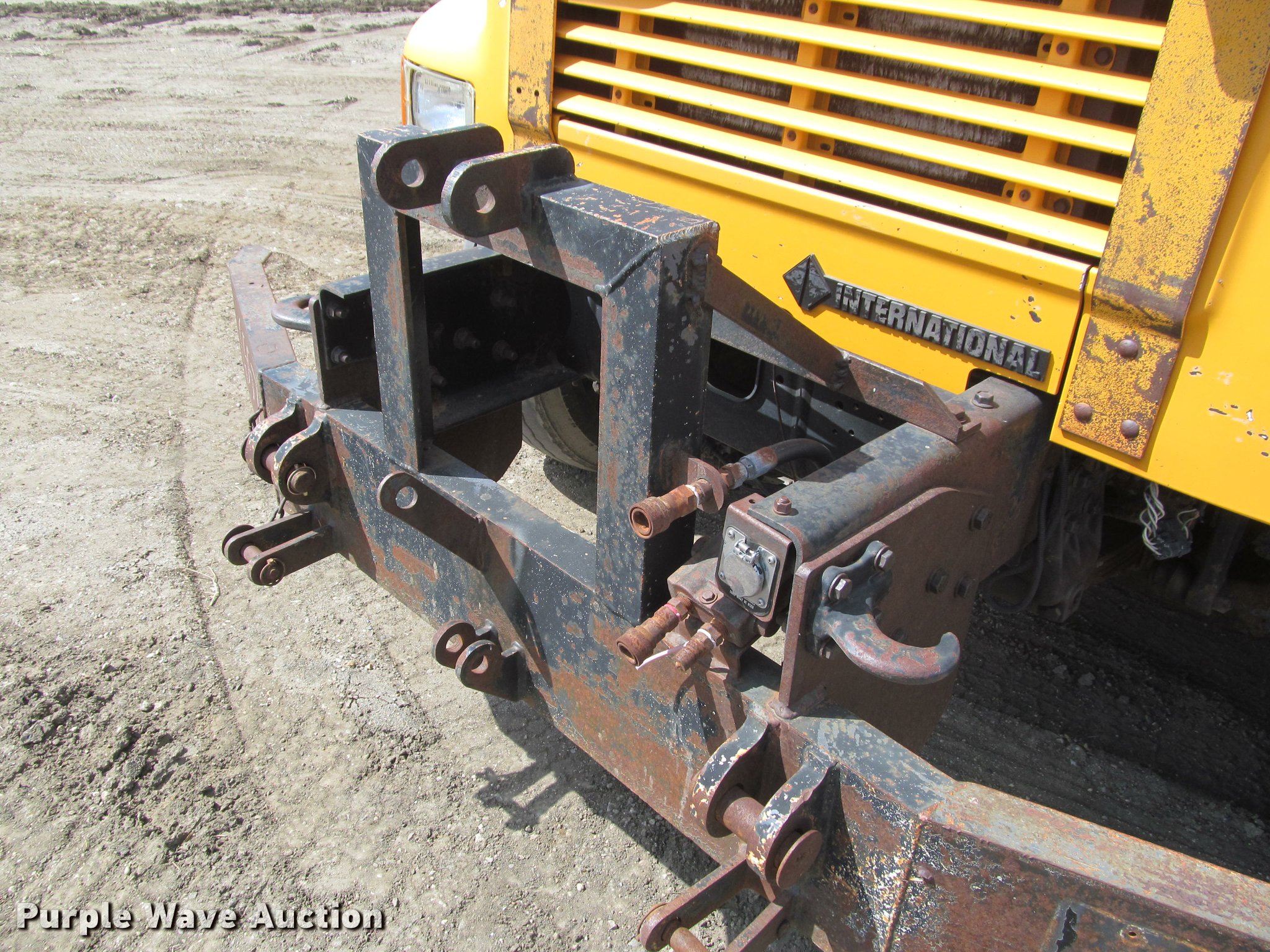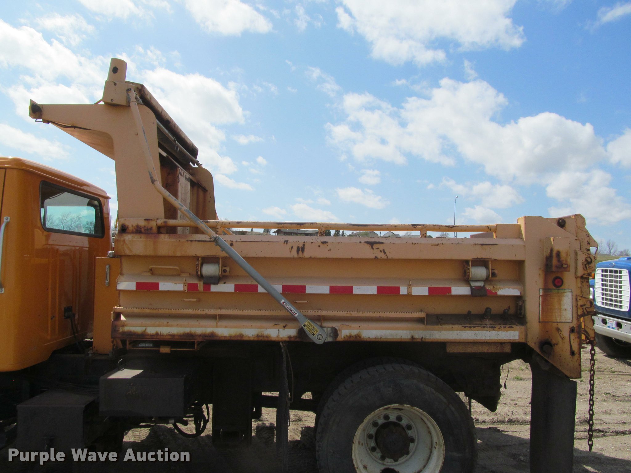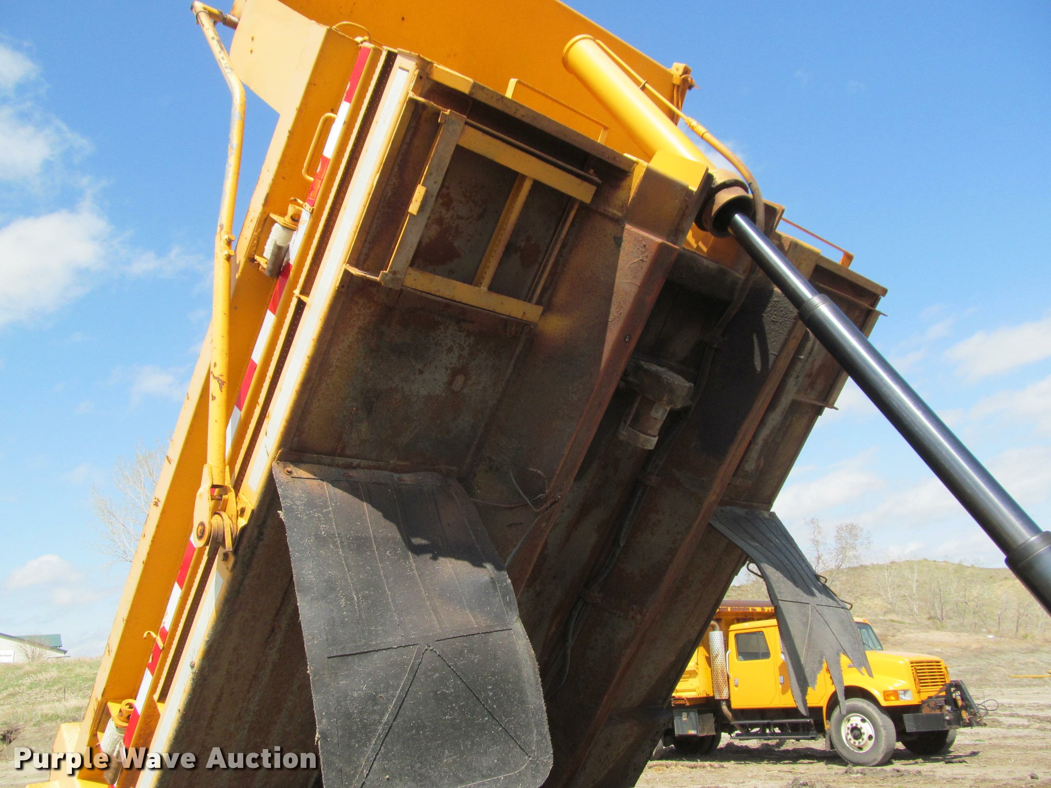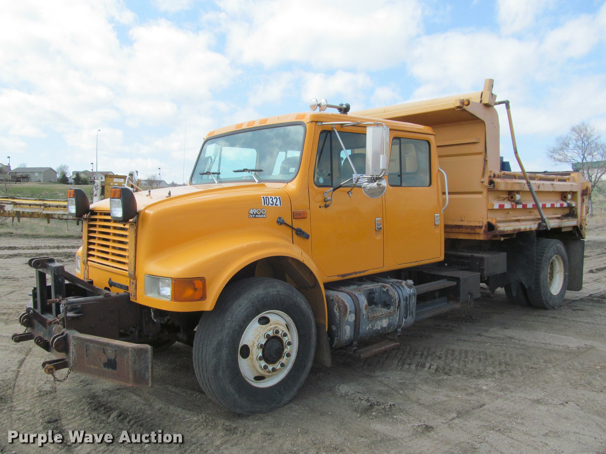 Purple Wave is selling a used Construction Dump Truck in South Dakota. This item is a 2002 International 4900 Crew Cab dump truck with the following: 169,567 miles on odometer, 11,015 hours on meter, International DT466 7.6L L6 turbo diesel engine, Allison automatic transmission, Single axle, AC and heat, Cruise, AM/FM, Power windows, Power and heated mirrors, Block heater, PTO, Galion UFT 4.5-3-90 steel dump bed, 10'L x 8'W, 26" side height, Electric rollover tarp, Bed vibrator, Air operated end gate, Single ram hoist, Dual bed mounted hydraulic remotes, Under-mounted toolbox, Serial H-21165, Plow bracket bumper, Wing plow mount, Single fuel tank, Pintle hitch, Spring suspension, Air brakes, Engine brake, 315/80R22.5 front tires, 11R22.5 rear tires, Rust, Unit# 10321