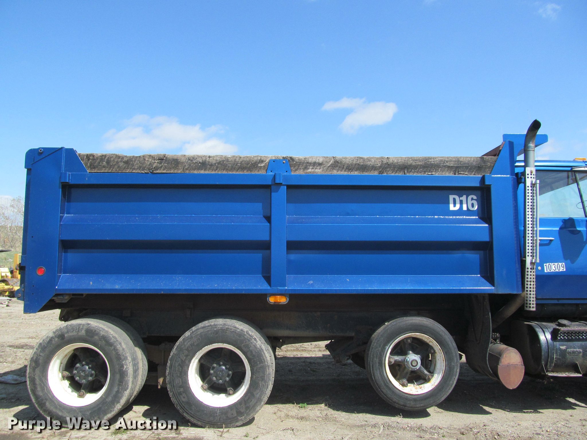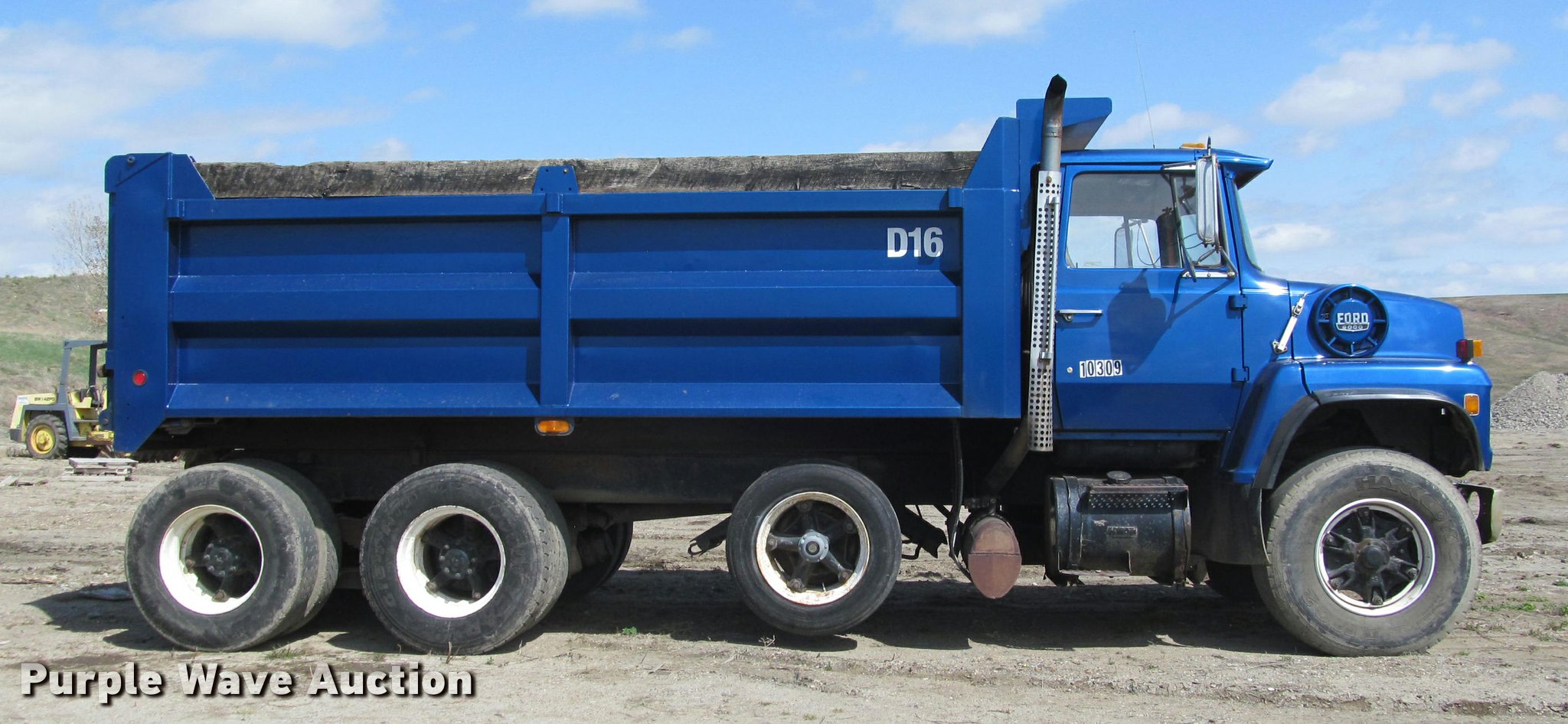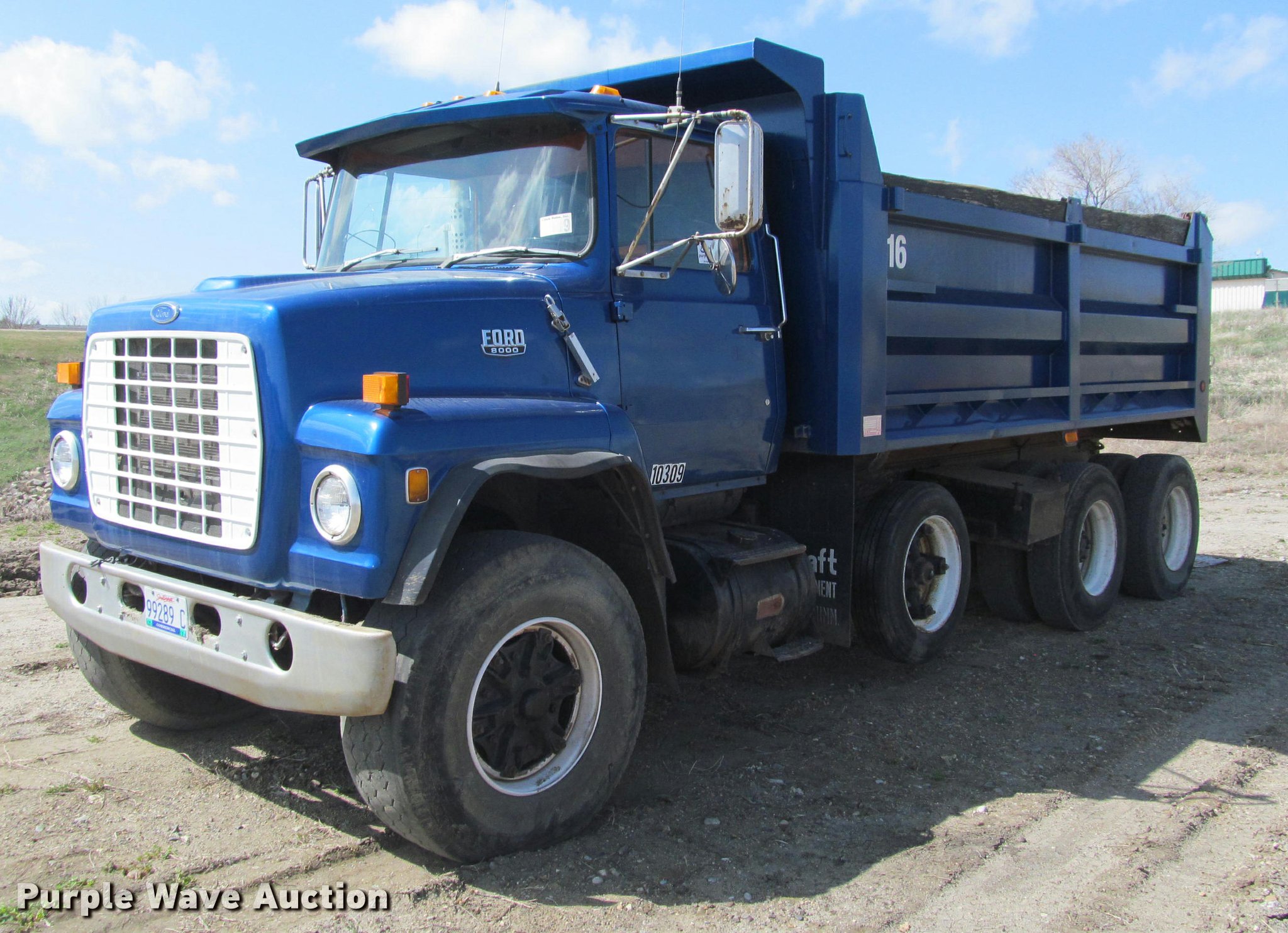 Purple Wave is selling a used Construction Dump Truck in South Dakota. This item is a 1986 Ford 8000 dump truck with the following: 310,919 miles on odometer, 108 hours on meter, Caterpillar 3208T 10.4L V8 diesel engine, Alliance re-manufactured engine, Serial ABPR0158E2D250, 15 speed manual transmission, Tandem axle, Inter-axle differential lock, Tag lift axle, AC and heat, AM, Air suspension seat, PTO, 16'L x 96"W steel dump bed, 45" side height, Air operated end gate, Single ram hoist, Dual fuel tanks, Pintle hitch, Spring over walking beam suspension, Air brakes, 204" wheelbase, 425/65R22.5 front tires, 11R22.5 rear tires, 255/70R22.5 tag axle tires, GVWR 56,000 lbs, Cracked windshield, Unit# 10309