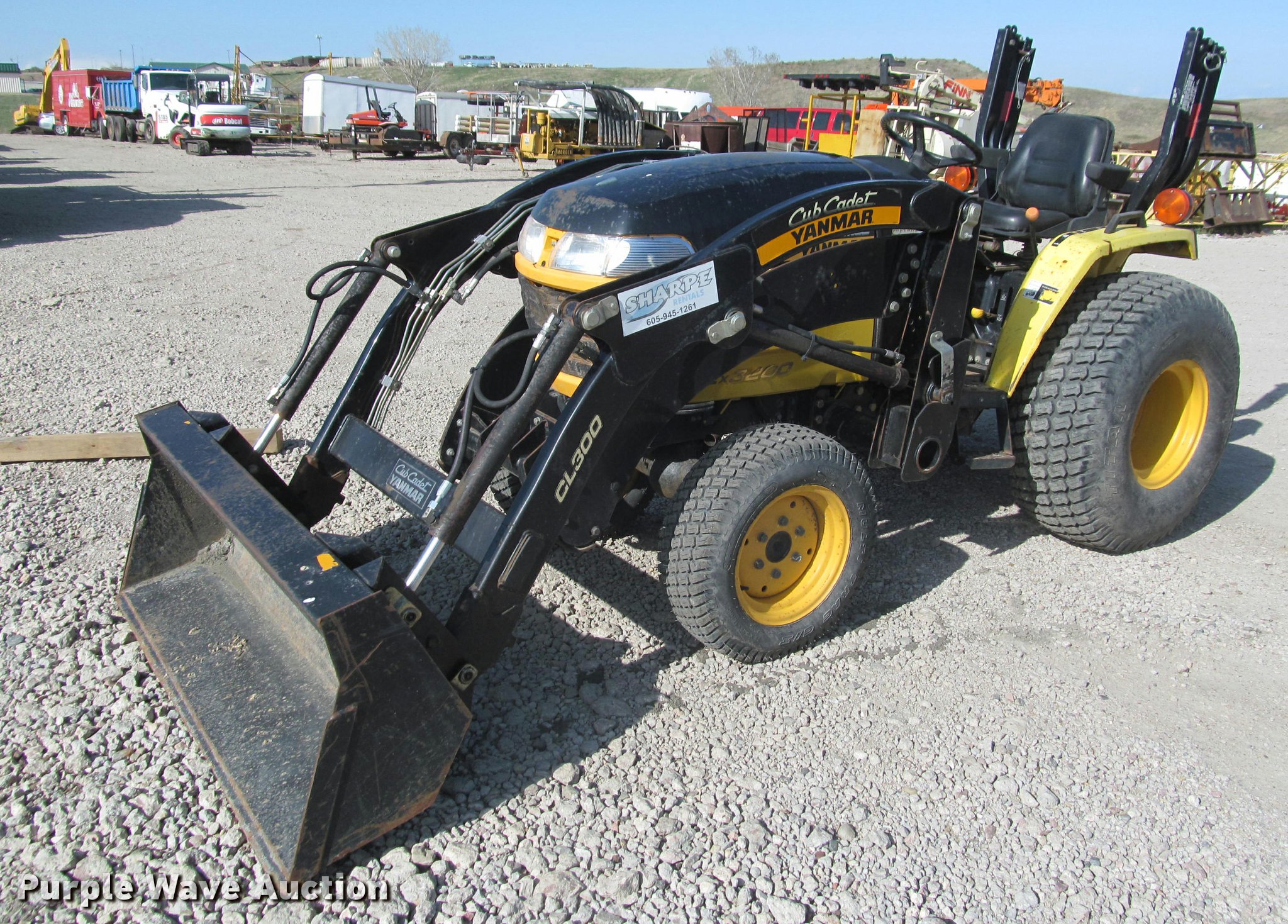 2008 Cub Cadet EX3200C MFWD tractor. 796 hours on meter, Yanmar 1.6L three cylinder diesel engine Serial 78582, Hydrostatic transmission, OROPS Serial 2133, Cub Cadet CL300 loader 60"W bucket, Joystick controls, Three point, 540 PTO, Auxiliary hydraulics, Multi-Trac C/S 25x8.50-14 front tires, Multi-Trac C/S 13.6-16 rear tires, Serial 001594, Unit# 75002. Sharpe Rentals, Inc. - Inspection available May 18 and 19. 720 N Garfield Ave. Pierre, SD 57501