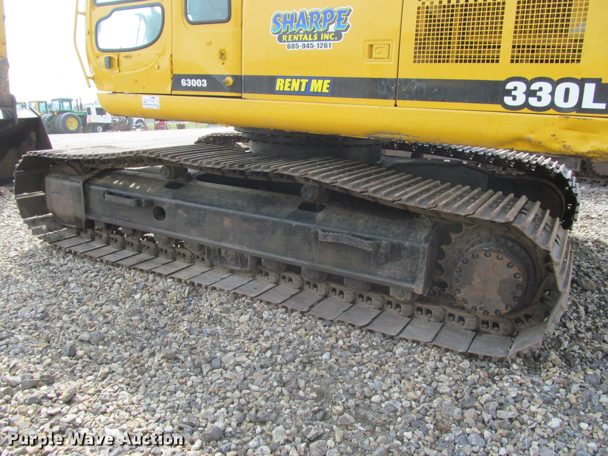 1998 John Deere 330LC excavator. 11,952 hours on meter, Six cylinder turbo diesel engine, Hydrostatic transmission, Two speed travel, Enclosed cab AC and heat, AM/FM, Suspension seat, Front work lights, Wipers, Standard boom, C&P 59"W bucket (6) pin-on teeth, Serial 359-82617-1, 32"W steel triple grouser track pads, Seat torn, (2) cracked windows, Side damage, Cab damage, Serial FF0330X080030, Unit# 63003. Sharpe Rentals, Inc. - Inspection available May 18 and 19. 720 N Garfield Ave. Pierre, SD 57501