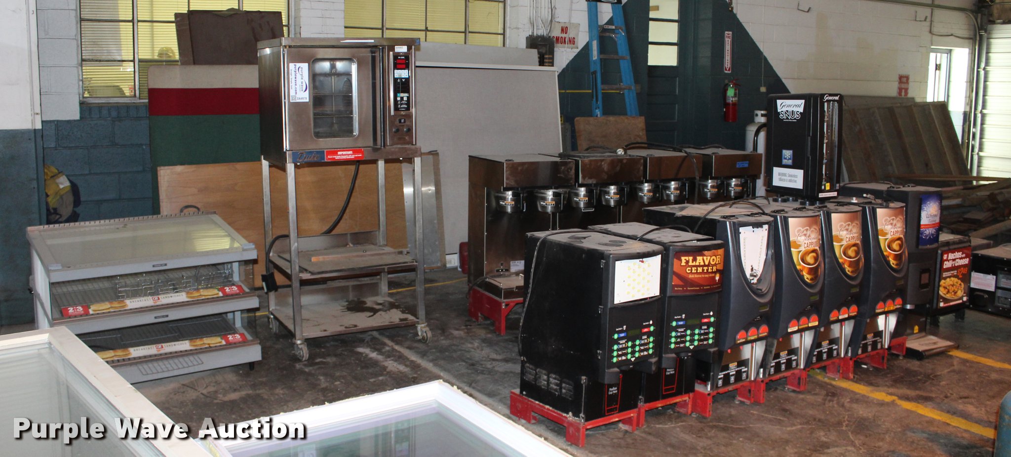 Purple Wave is selling a used Restaurant Equip. in Missouri. This item is a Restaurant equipment with the following: Warming table, (2) shelves, Duke oven, Rolling stand, (4) two burner coffee makers, (6) cappuccino machines, General chilling container, Nacho machine, Whipped topping machine, (3) Amana microwaves