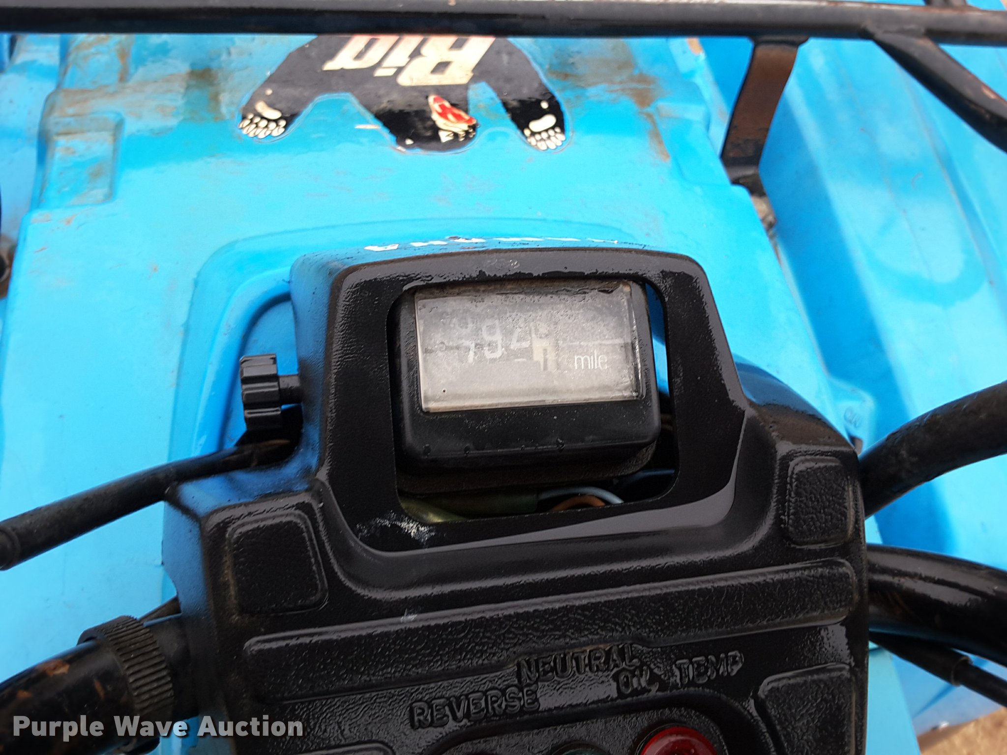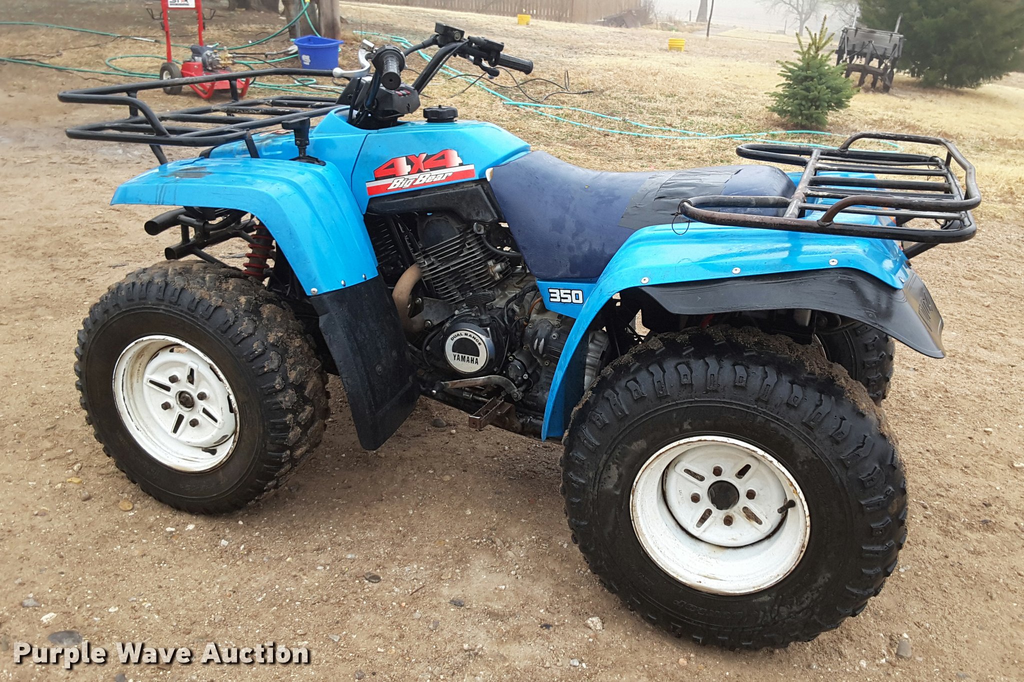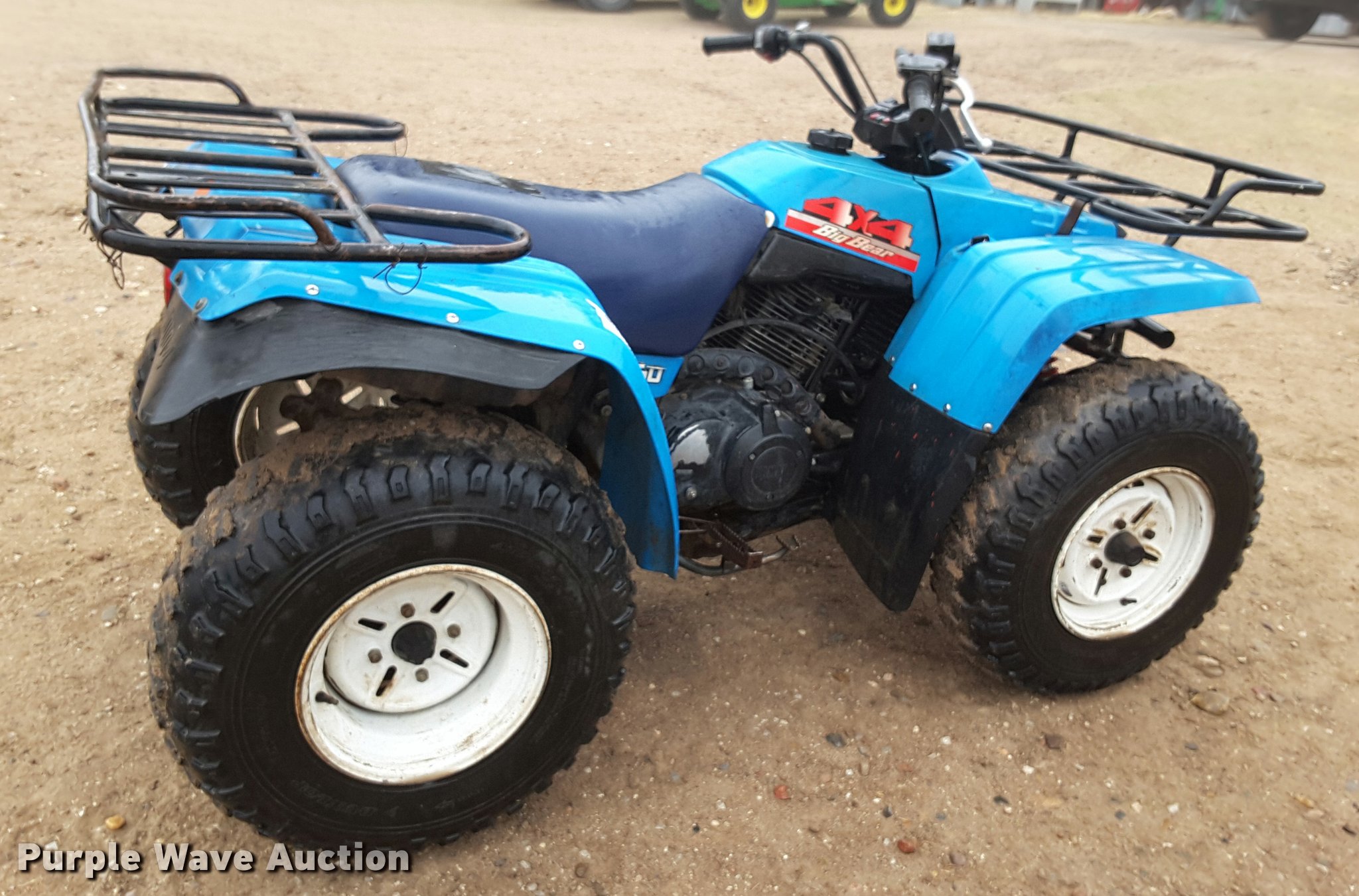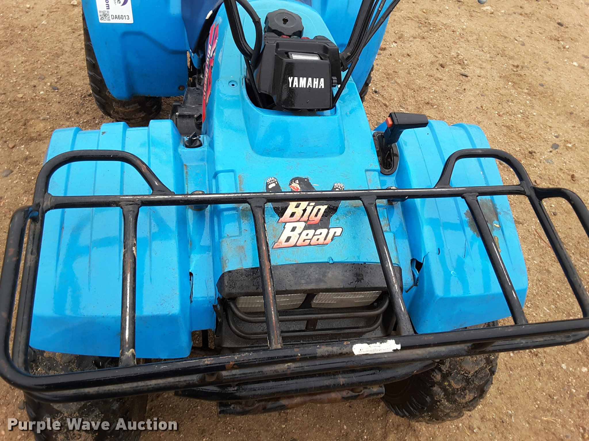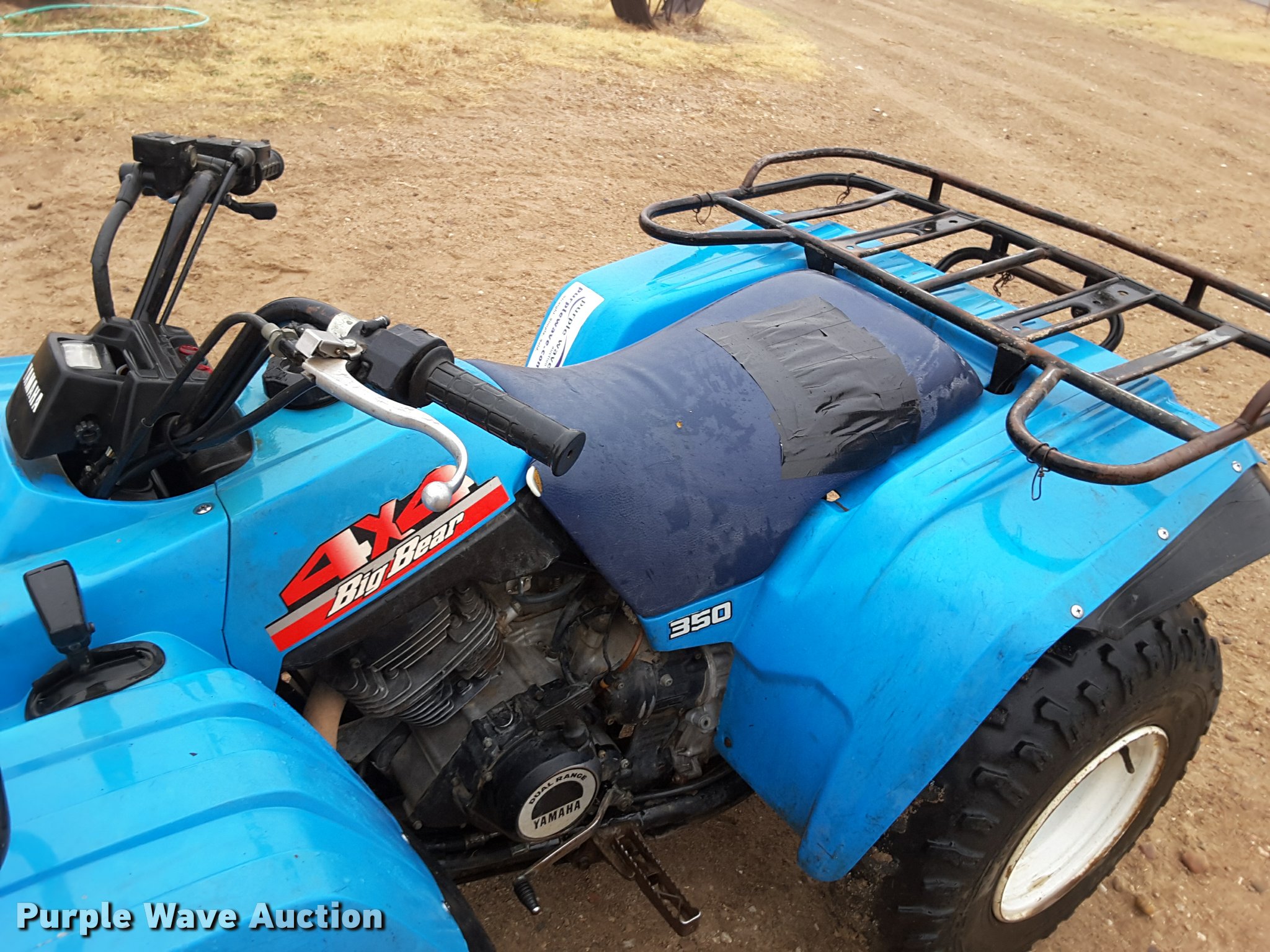 Purple Wave is selling a used ATV in Kansas. This item is a 1988 Yamaha Big Bear 350 ATV with the following: 792 miles on odometer, Yamaha 350cc single cylinder gas engine, Yamaha transmission, 5F-5R gears, Hi-low transmission, Four wheel drive, Electric start, Recoil start, Headlights, Grill guard, Front and rear racks, Rear hitch, Dunlop 25x8-12 front tires, Dunlop 25x12-12 rear tires, Weak battery, Starting/idle issues, Reverse shifter stiff, Left front fender cracked, Seat damage