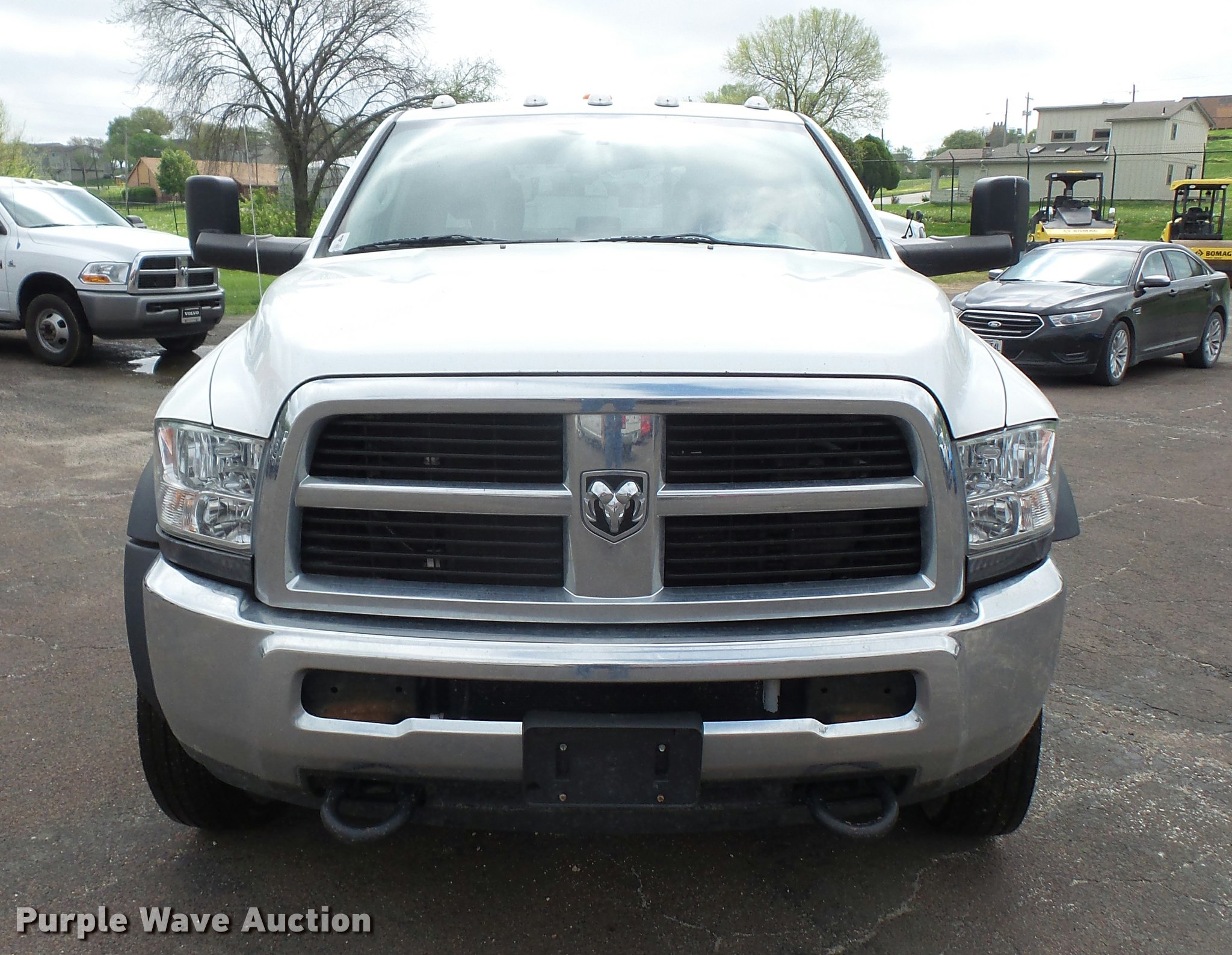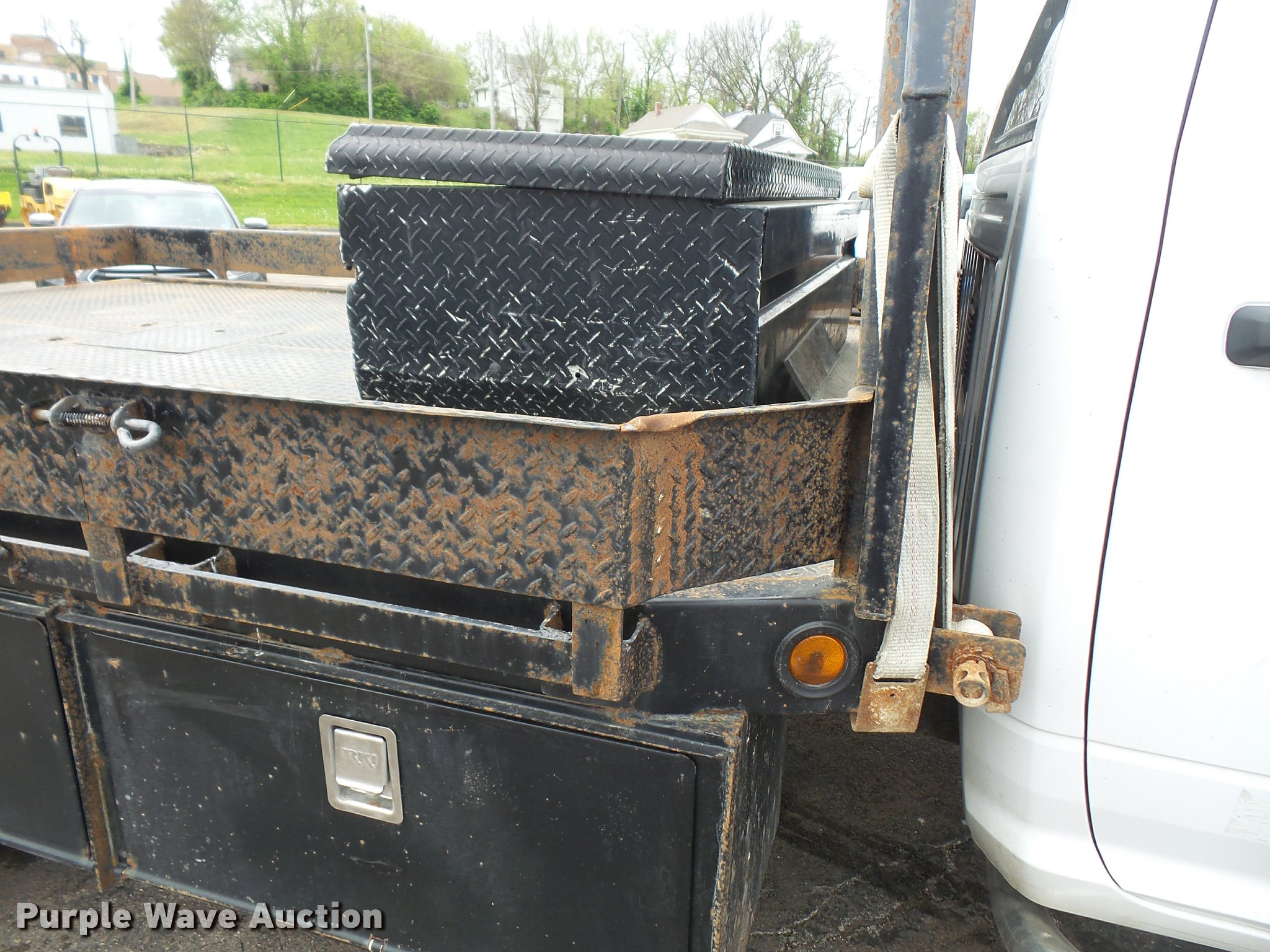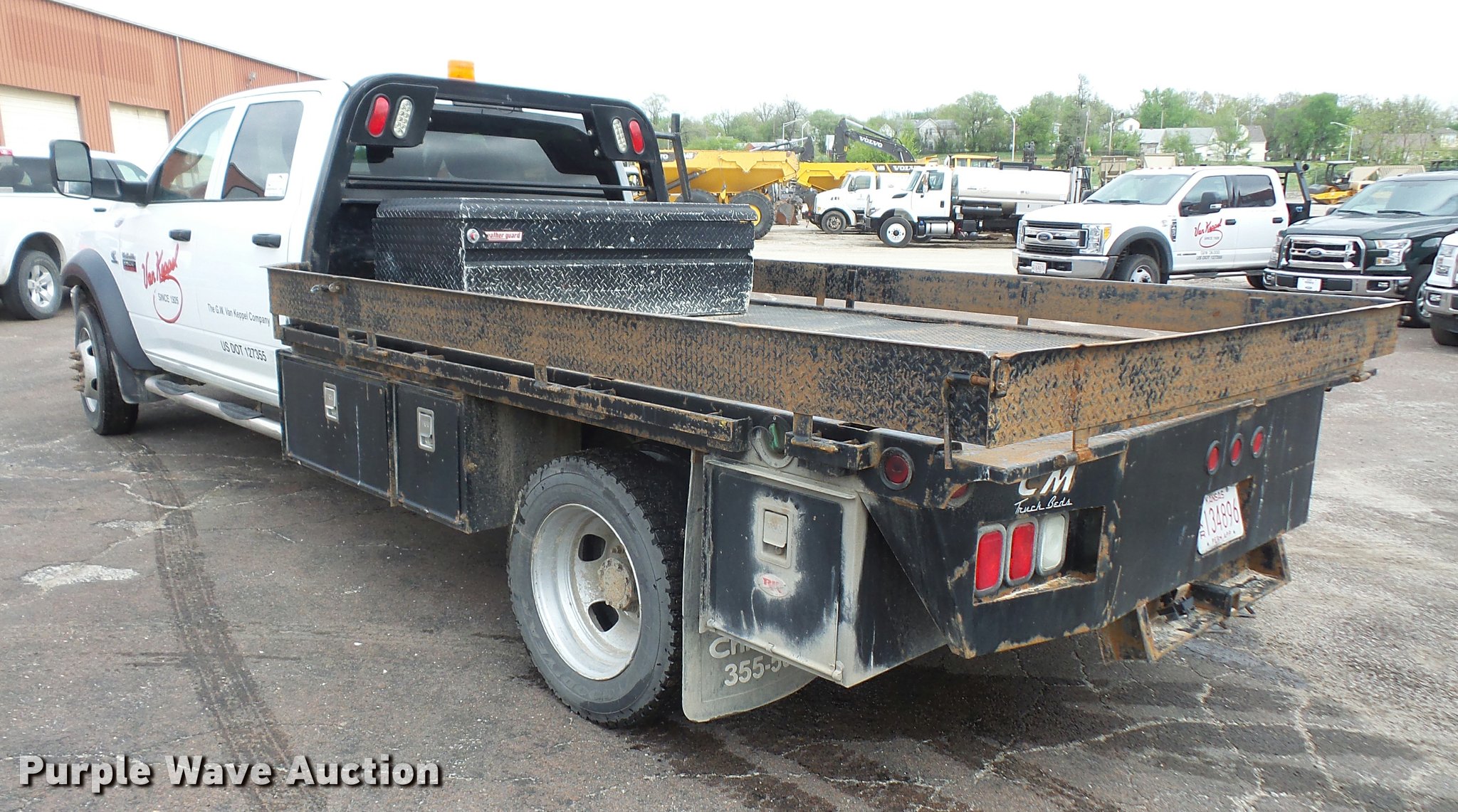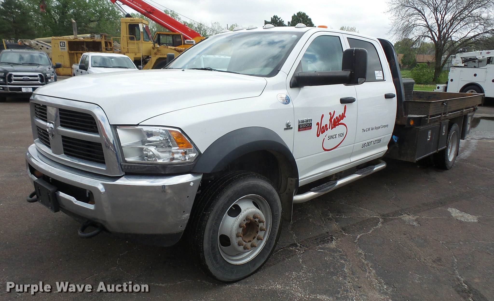 Purple Wave is selling a used Flat Bed Truck in Kansas. This item is a 2012 Dodge Ram 5500 Crew Cab flatbed truck with the following: 143,134 miles on odometer, 6.7L L6 OHV 24V diesel engine, Automatic transmission, AC and heat, Tilt, Cruise, AM/FM/CD, Power windows, locks, and mirrors, Vinyl interior, Front tow hooks, Running boards, 11.5'L x 100"W flatbed, Toolbox, Gooseneck ball, Receiver hitch, 225/75R19.5 tires, Decals will be removed prior to auction