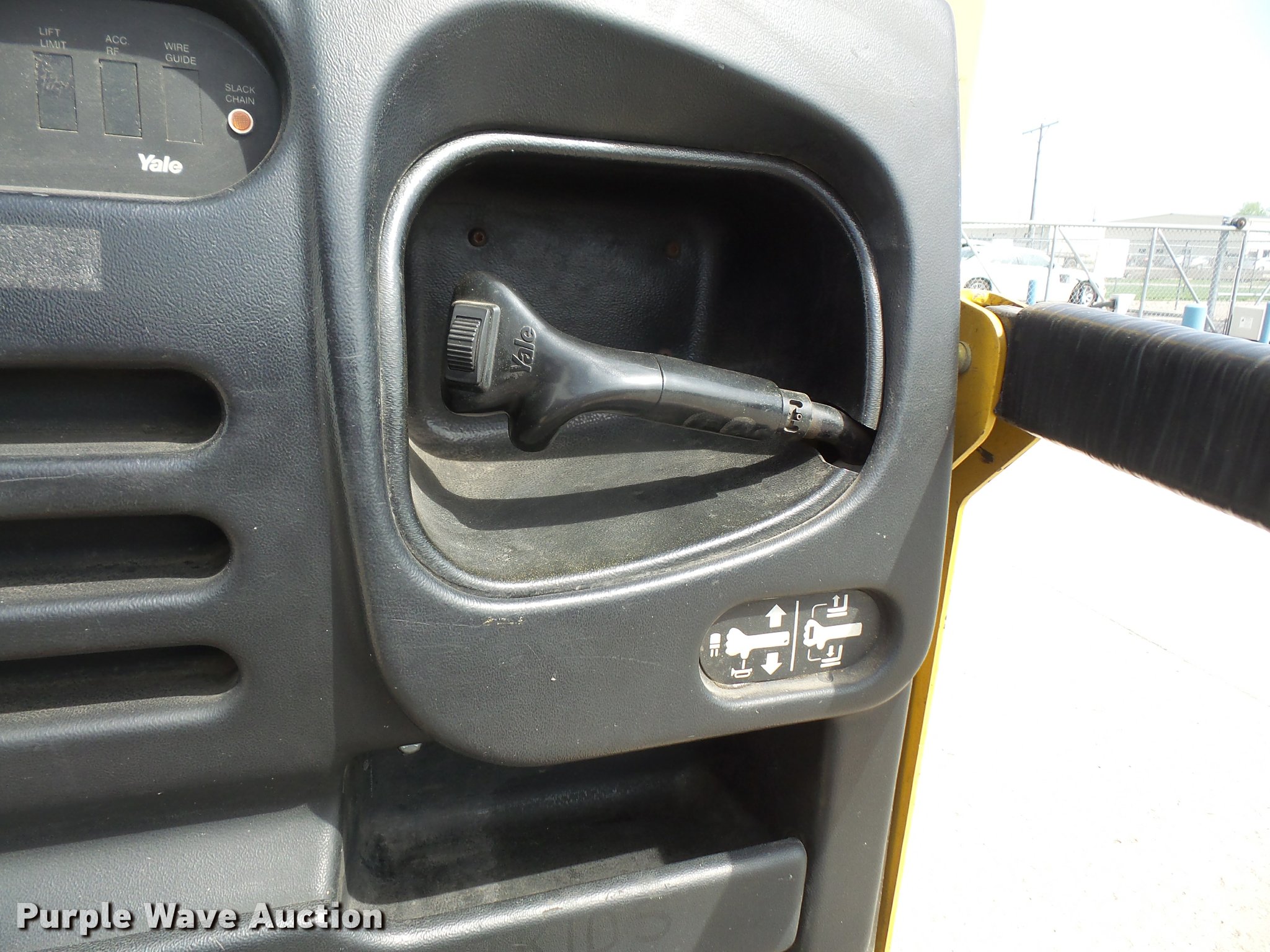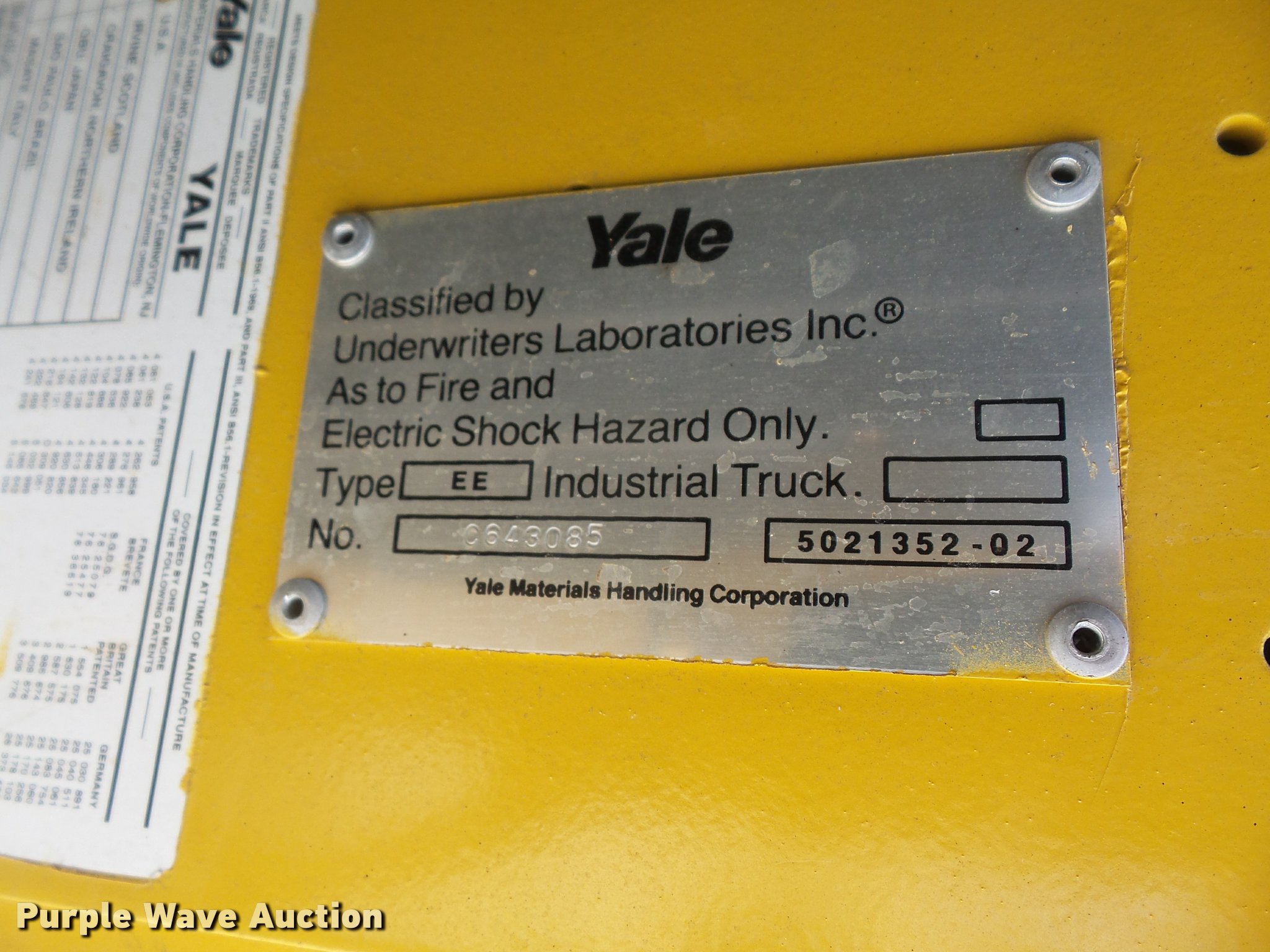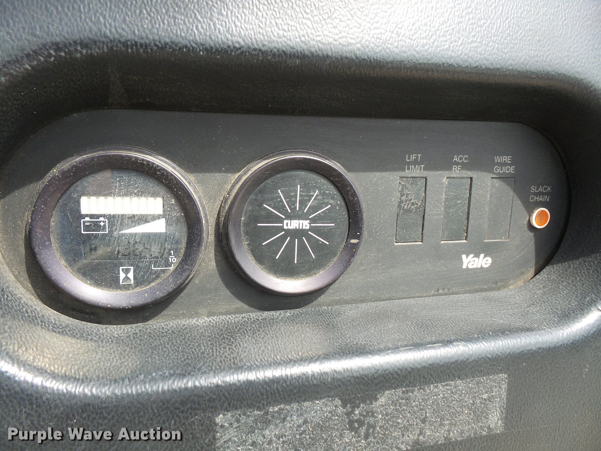 Purple Wave is selling a used Warehouse Forklift in Kansas. This item is a Yale C826N01833X forklift with the following: 1,364 hours on meter, 24V operation, 3,000 lbs maximum lift capacity, 195" maximum lift height, 42"L forks, 48"L x 35"W man basket, Gould Ferro charger, Model AFC12-72JT1, 208/240/280V, Three phase, Serial 2800504795, Serial C826N01833X