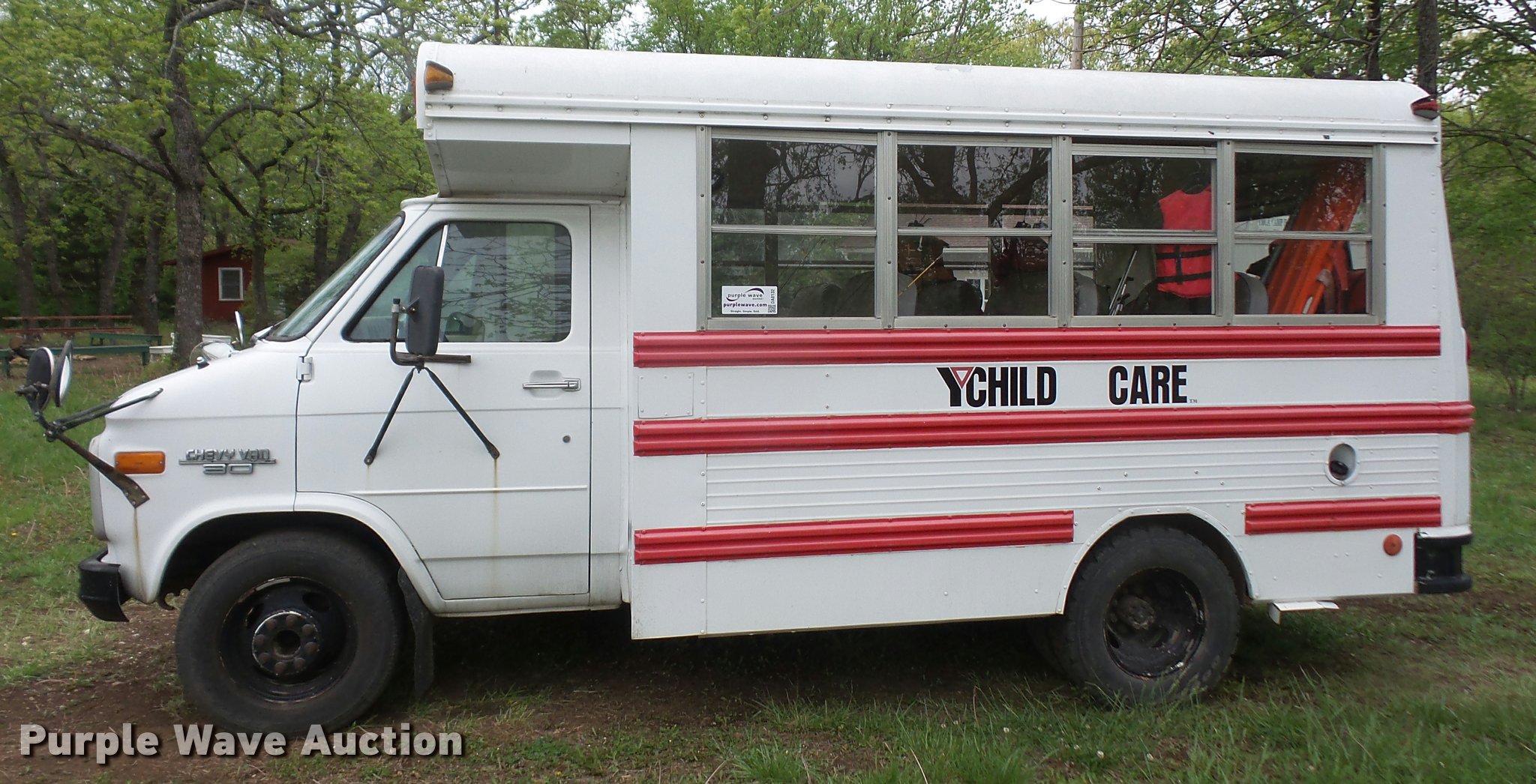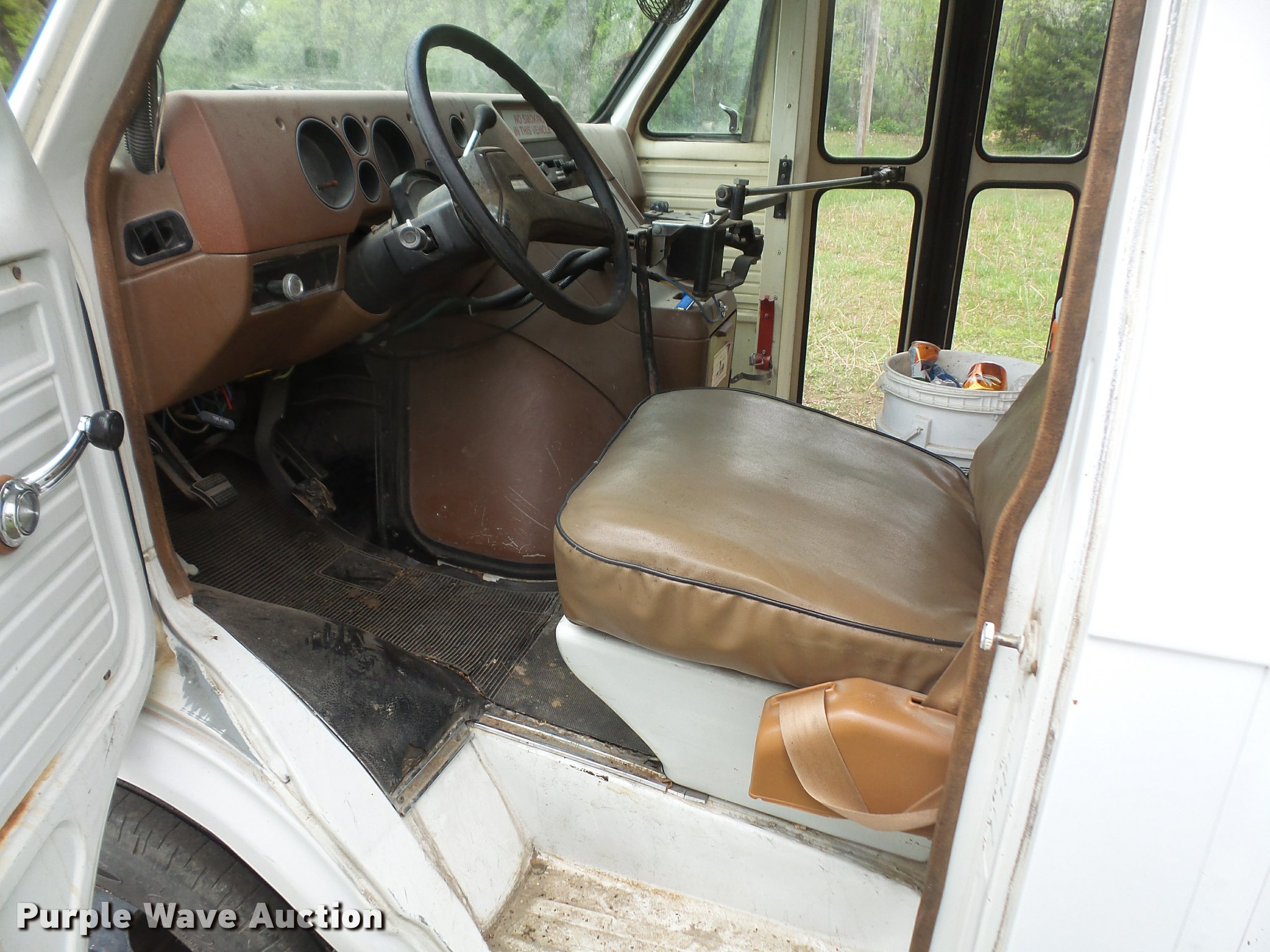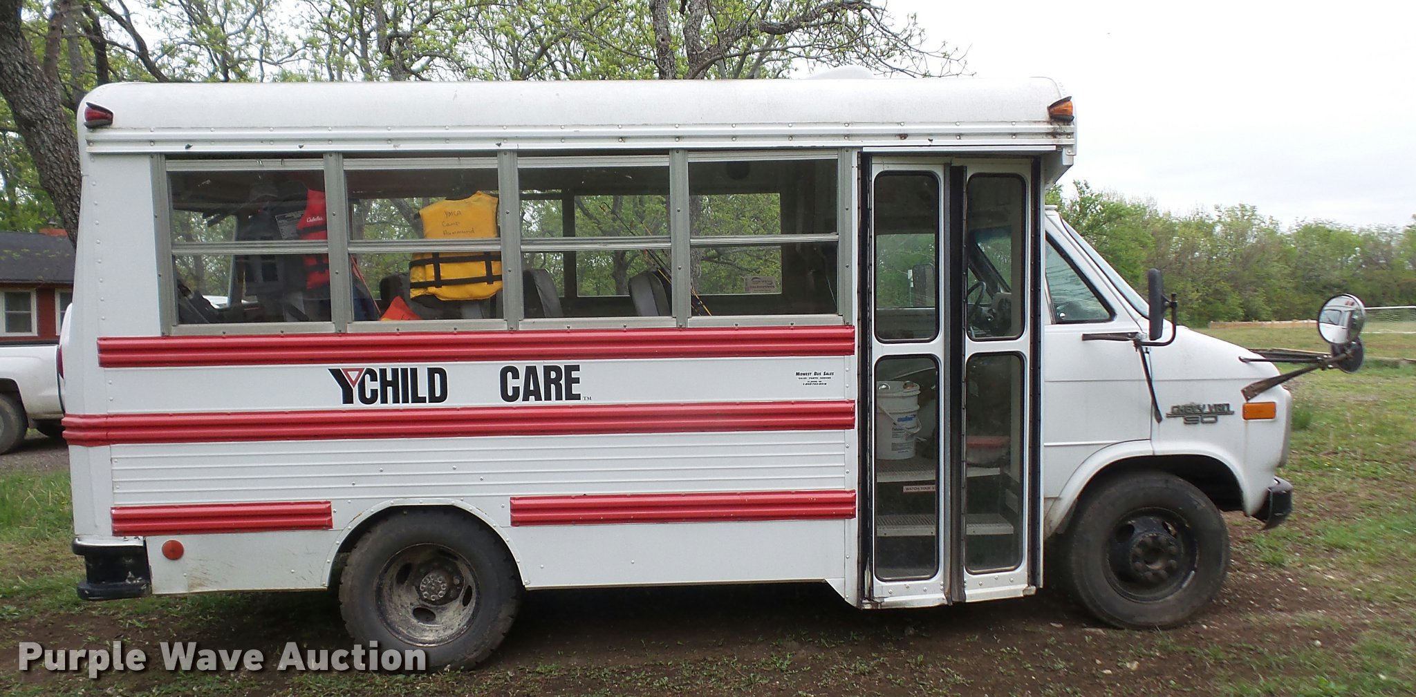 Purple Wave is selling a used Bus in Kansas. This item is a 1991 Chevrolet G30 school bus with the following: 165,801 miles on odometer, 5.7L V8 OHV 16V gas engine, Automatic transmission, Single axle, AC and heat, AM/FM, 15 passenger capacity, Hydraulic brakes, 225/75R16 tires, Contents not included, Exit door window broken, Hood latch needs repaired, Hood will not open
