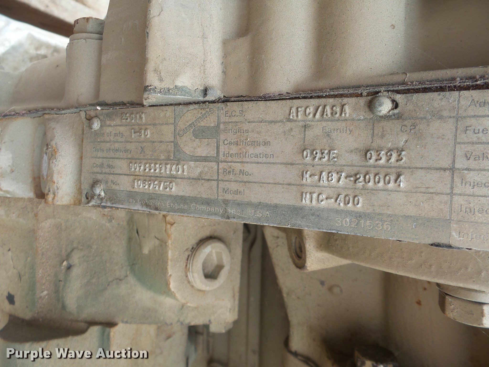 Purple Wave is selling a used Engine in Kansas. This item is a Cummins NTC-400 six cylinder turbo diesel engine with the following: Hole in engine block, Non-operational unit