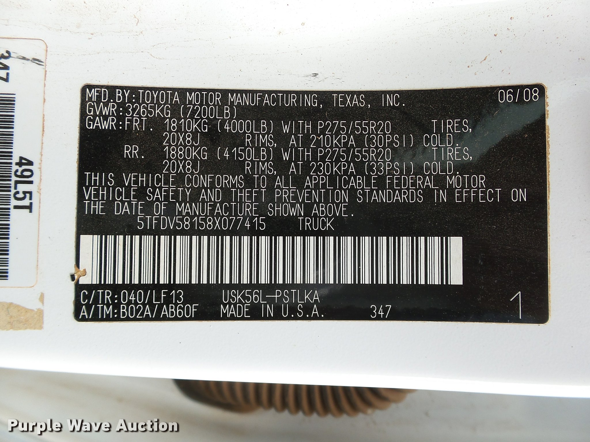 Purple Wave is selling a used 1/2 Ton Pickup or Van in Oklahoma. This item is a 2008 Toyota Tundra Limited CrewMax pickup truck with the following: 195,658 miles on odometer, 5.7L V8 DOHC 32V gas engine, Automatic transmission, Four wheel drive, AC and heat, Tilt, Cruise, AM/FM/CD, Power windows, locks, mirrors, and seat, Heated seats, Leather interior, Power sunroof, Fog lights, Brake controller, Running boards, Receiver hitch, Trailer wiring, P275/60R20 tires, Unit# 155.199