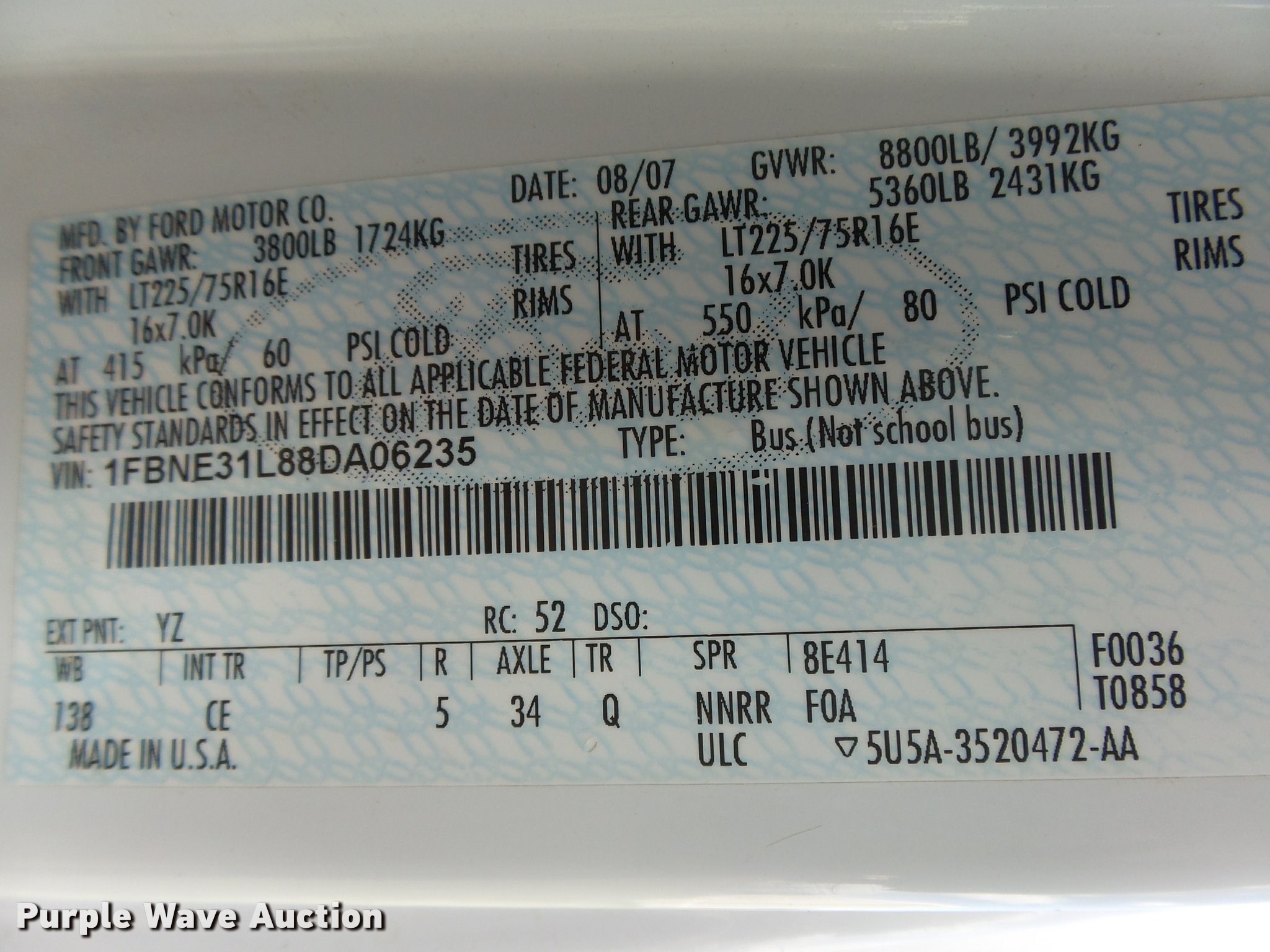 Purple Wave is selling a used 3/4 or 1 Ton Pickup or Van in Kansas. This item is a 2008 Ford E350 Super Duty XL van with the following: 187,858 miles on odometer, 5.4L V8 SOHC 16V gas engine, Automatic transmission, AC and heat, Tilt, Cruise, AM/FM/CD, Power windows and locks, Cloth interior, 12 passenger capacity, LT245/75R16 tires, Check engine light on