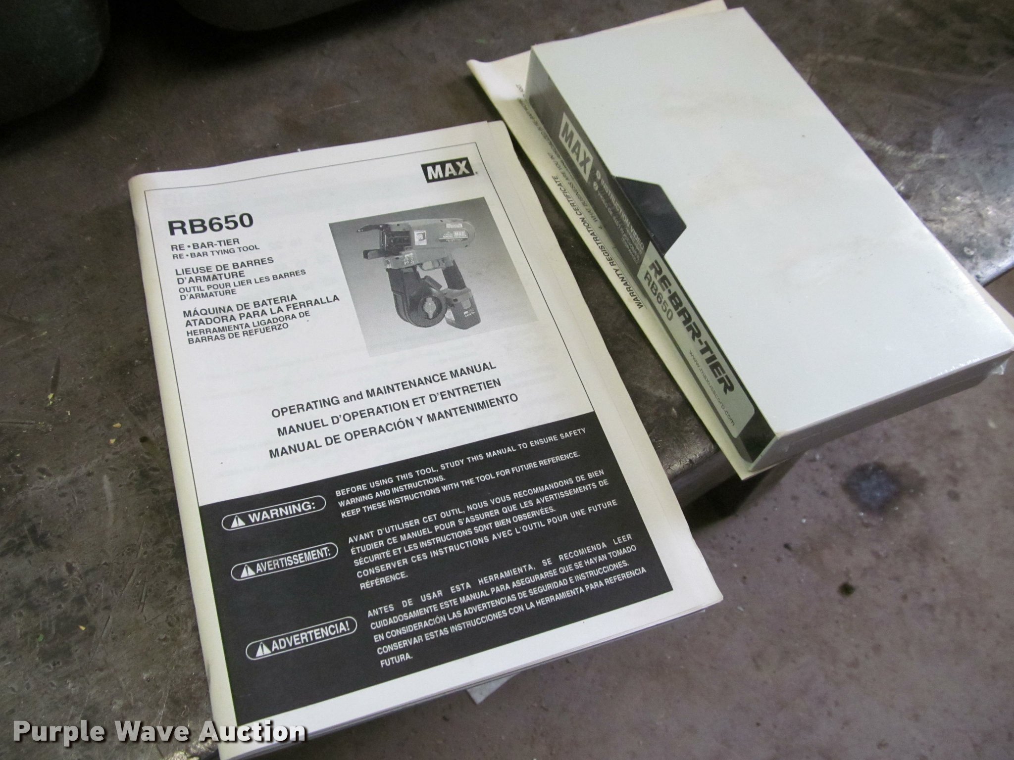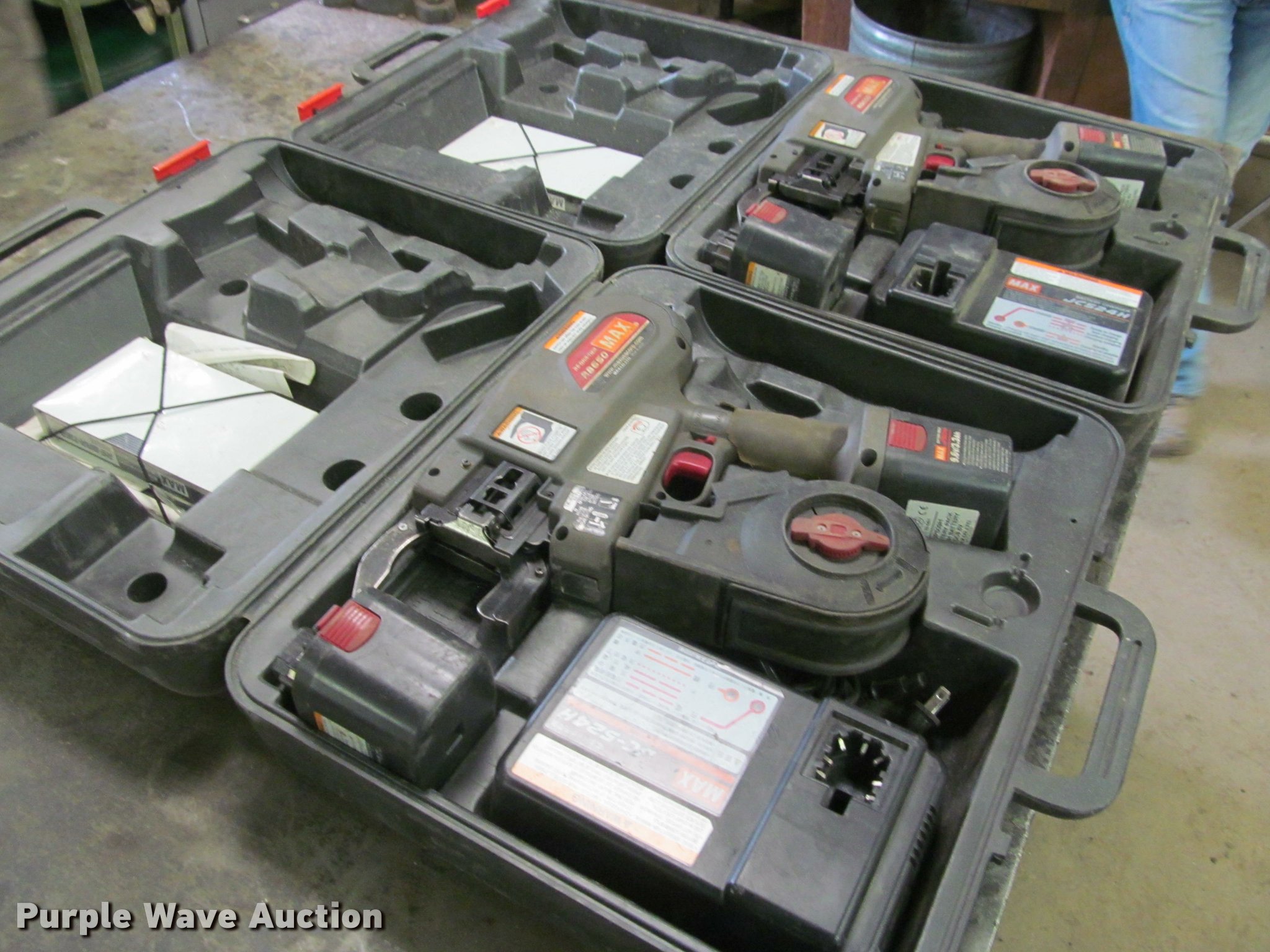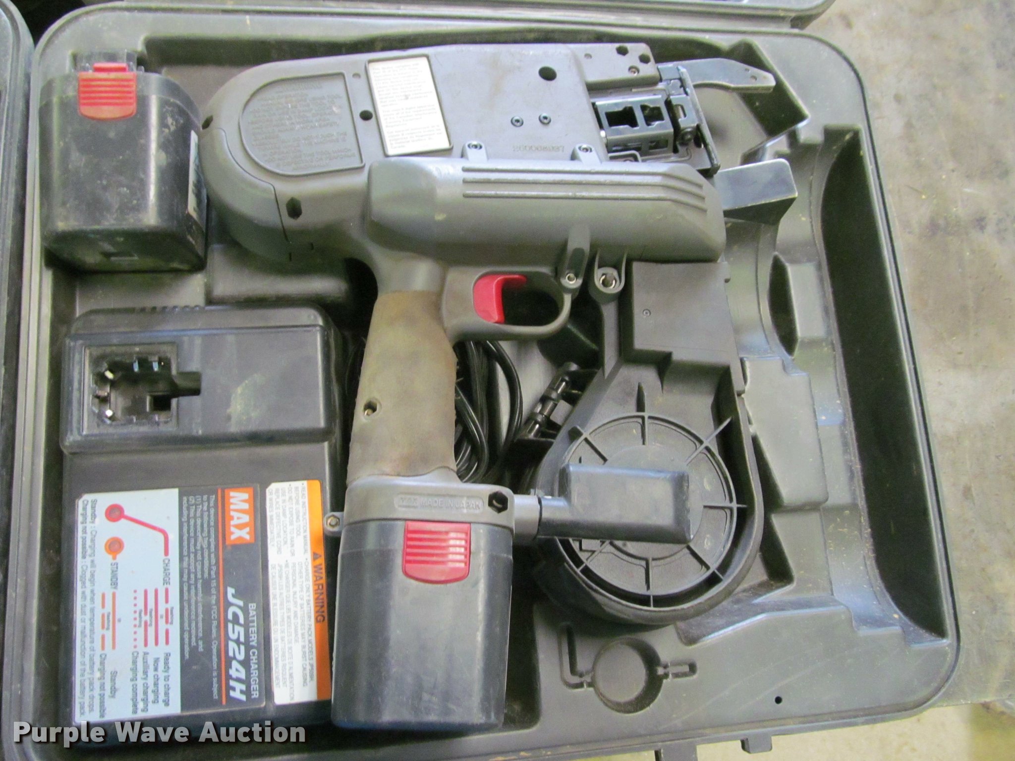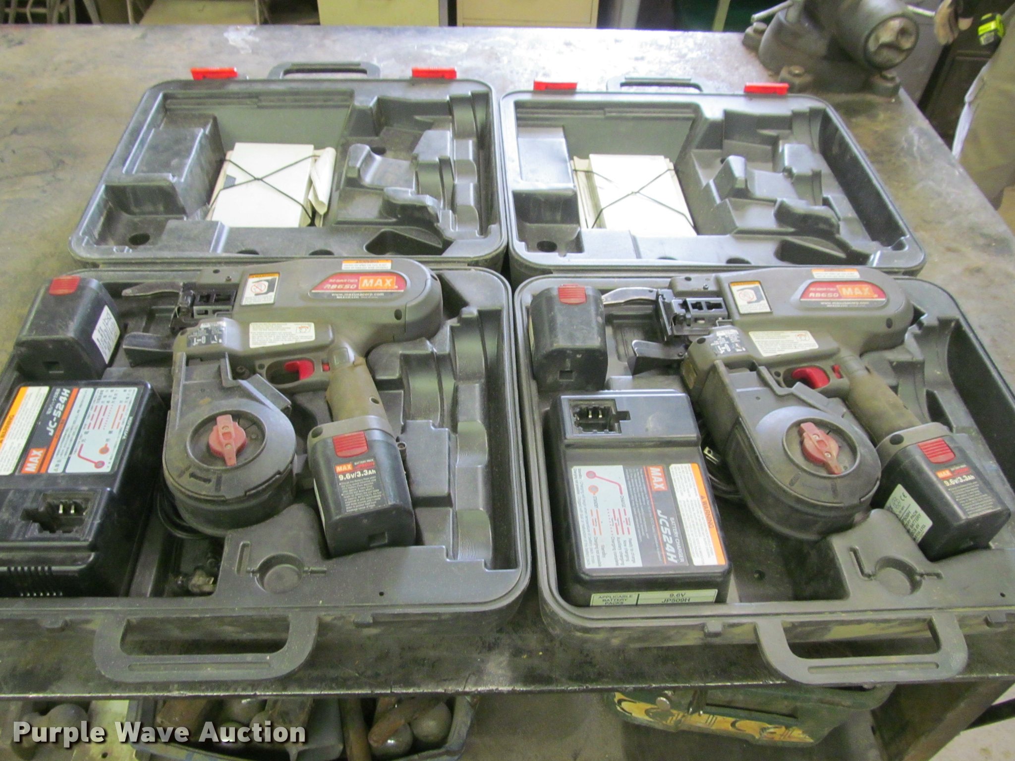 Purple Wave is selling a used Tools in Iowa. This item is a (2) Max RB650 rebar tiers with the following: Adjustable tension control, NI-MH battery, 9.6V DC, (2) additional batteries, Chargers, Operating/maintenance manuals, Protective cases, Unknown operating condition