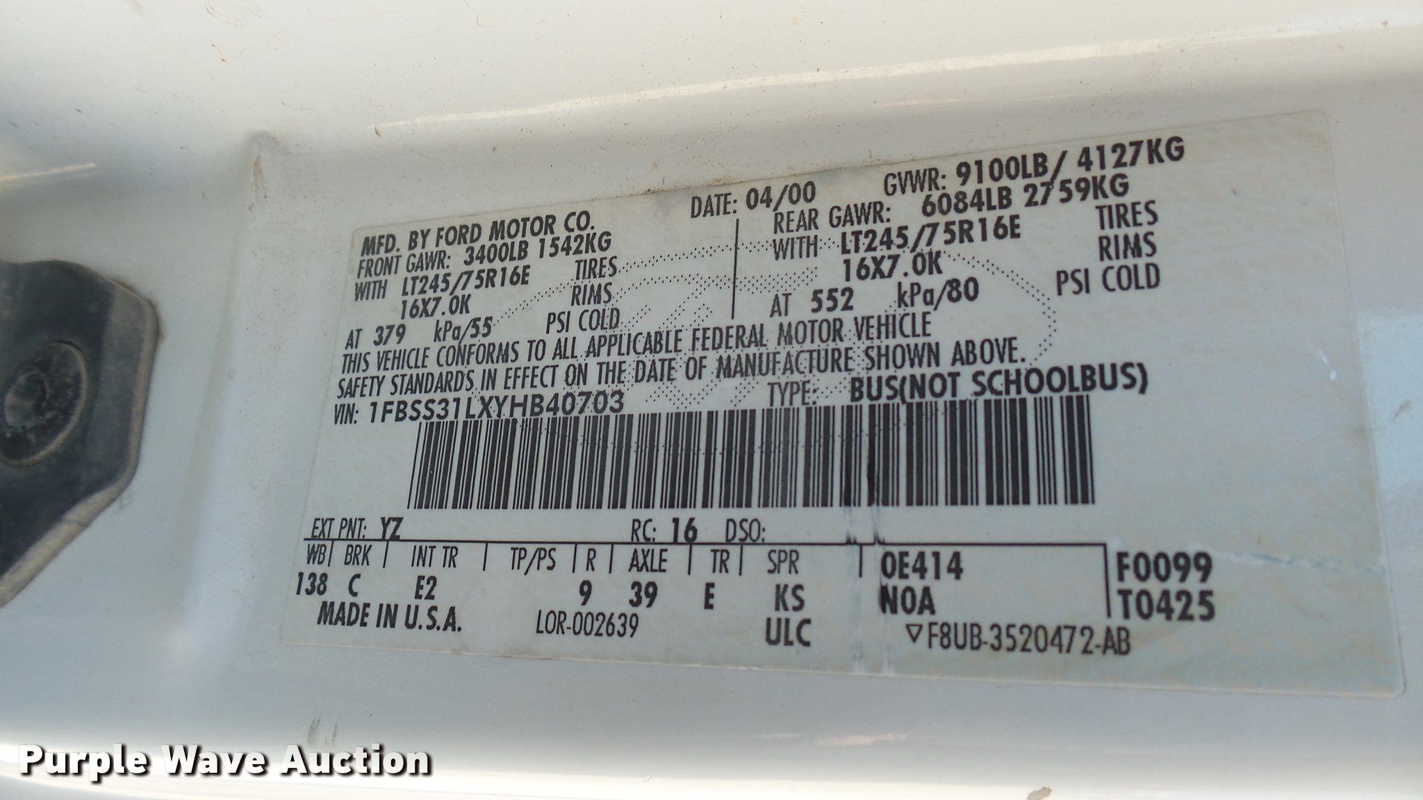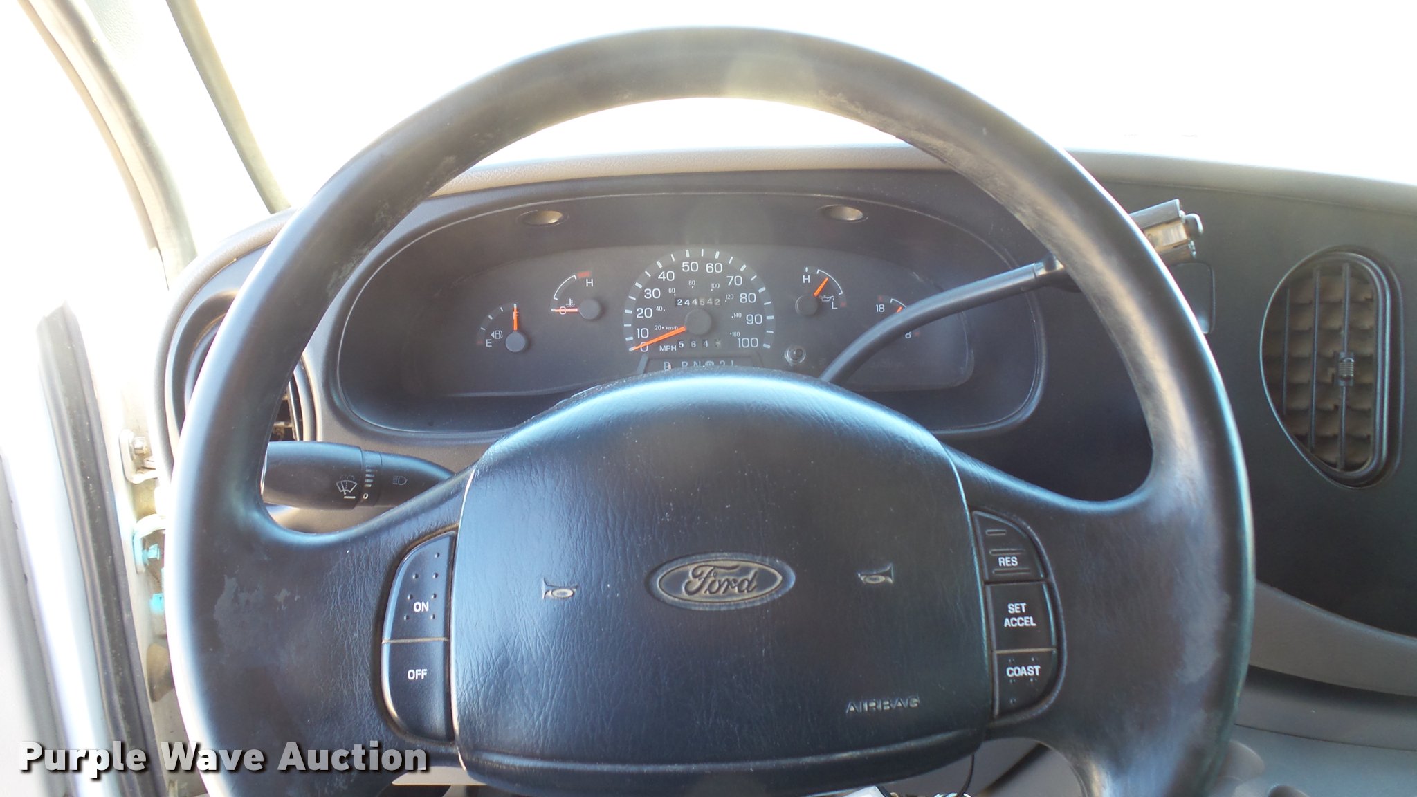 Purple Wave is selling a used 3/4 or 1 Ton Pickup or Van in Kansas. This item is a 2000 Ford Econoline E350 Extended van with the following: 244,542 miles on odometer, 5.4L V8 SOHC 16V gas engine, Automatic transmission, AC and heat, Tilt, Cruise, AM/FM/cassette, Power windows, locks, and mirrors, Cloth interior, 14 passenger capacity, Receiver hitch, Trailer wiring, 245/75R16 tires