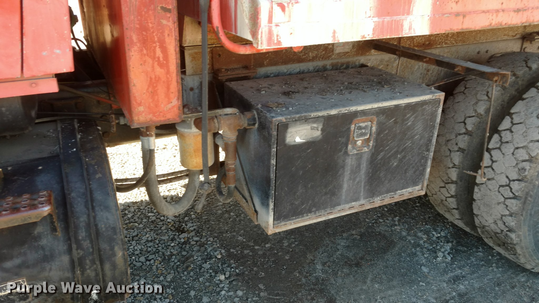 Purple Wave is selling a used Construction Dump Truck in Kansas. This item is a 1989 Ford L8000 dump truck with the following: 259,298 miles on odometer, 4,285 hours on meter, 7.8L L6 diesel engine, Automatic transmission, Tandem axle, Heat, Air suspension seat, PTO, Heil HP17412 dump bed, 12'L x 96"W, Rollover tarp, Single ram hoist, Flink 11PA44.5 snow plow, 11'W, Flink stainless steel spreader, Hydraulic driven, Seven cu. yd. capacity, Pintle hitch, Spring suspension, Air brakes, 275/80R22.5 front tires, 295/75R22.5 rear tires
