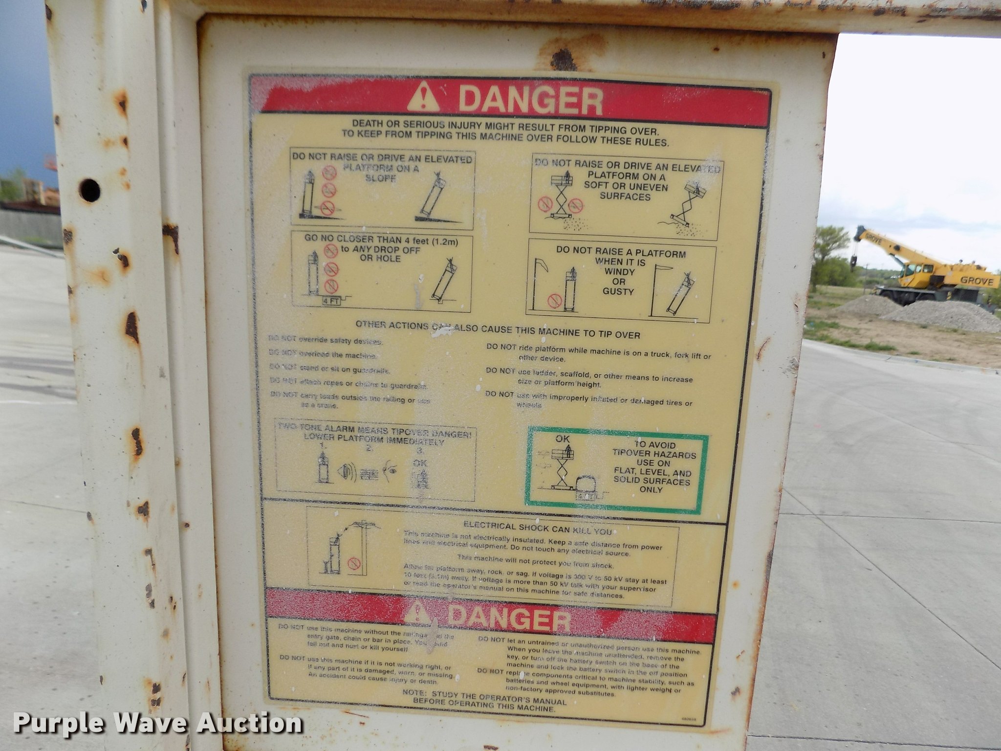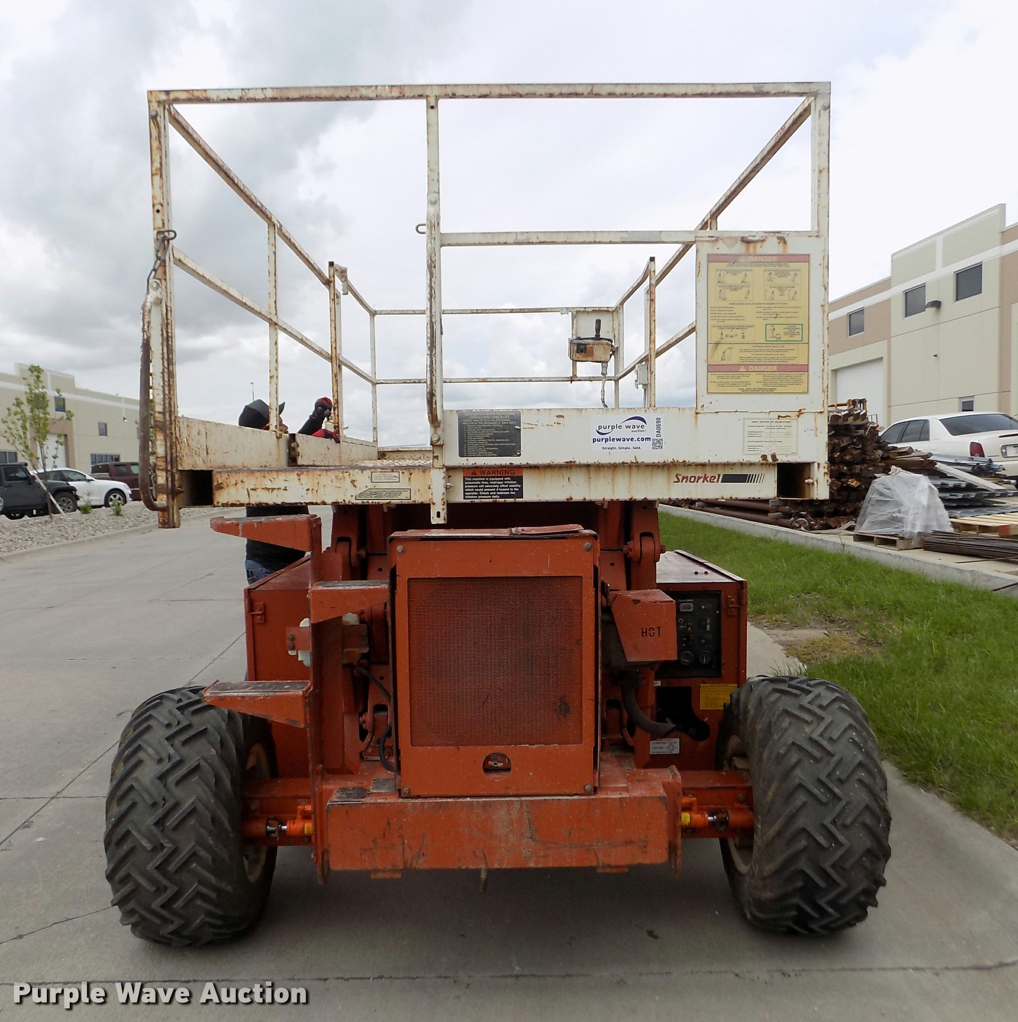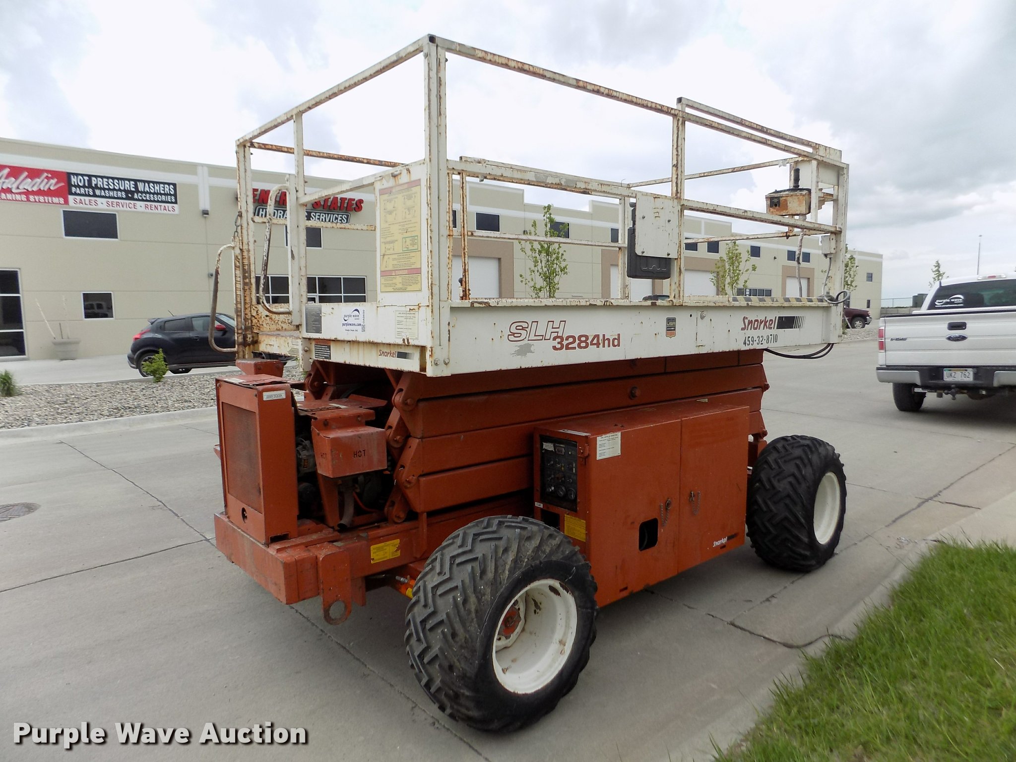 Purple Wave is selling a used Scissor or Vertical Lift in Nebraska. This item is a Snorkel SLH3284HD scissor lift with the following: 1,338 hours on meter, Three cylinder dual fuel engine, 1,250 lbs maximum lift capacity, 32' maximum lift and travel height, 10'3"L x 6'W platform, Manual platform extensions, Platform and ground controls, Safety alarm, Emergency lowering valve, Goodyear 31 x 15.50-15 calcium filled tires, Overspray, Serial 9628031296
