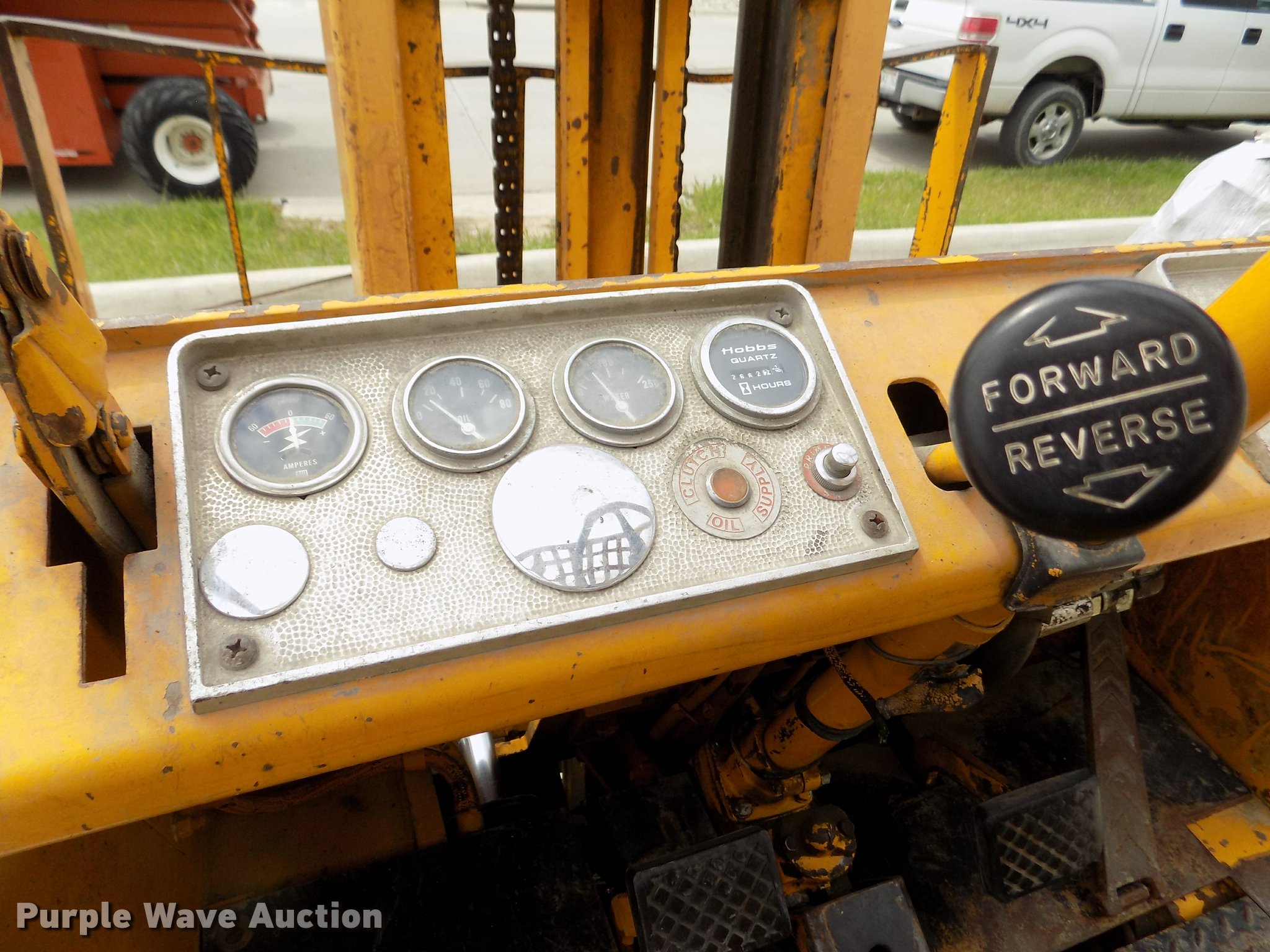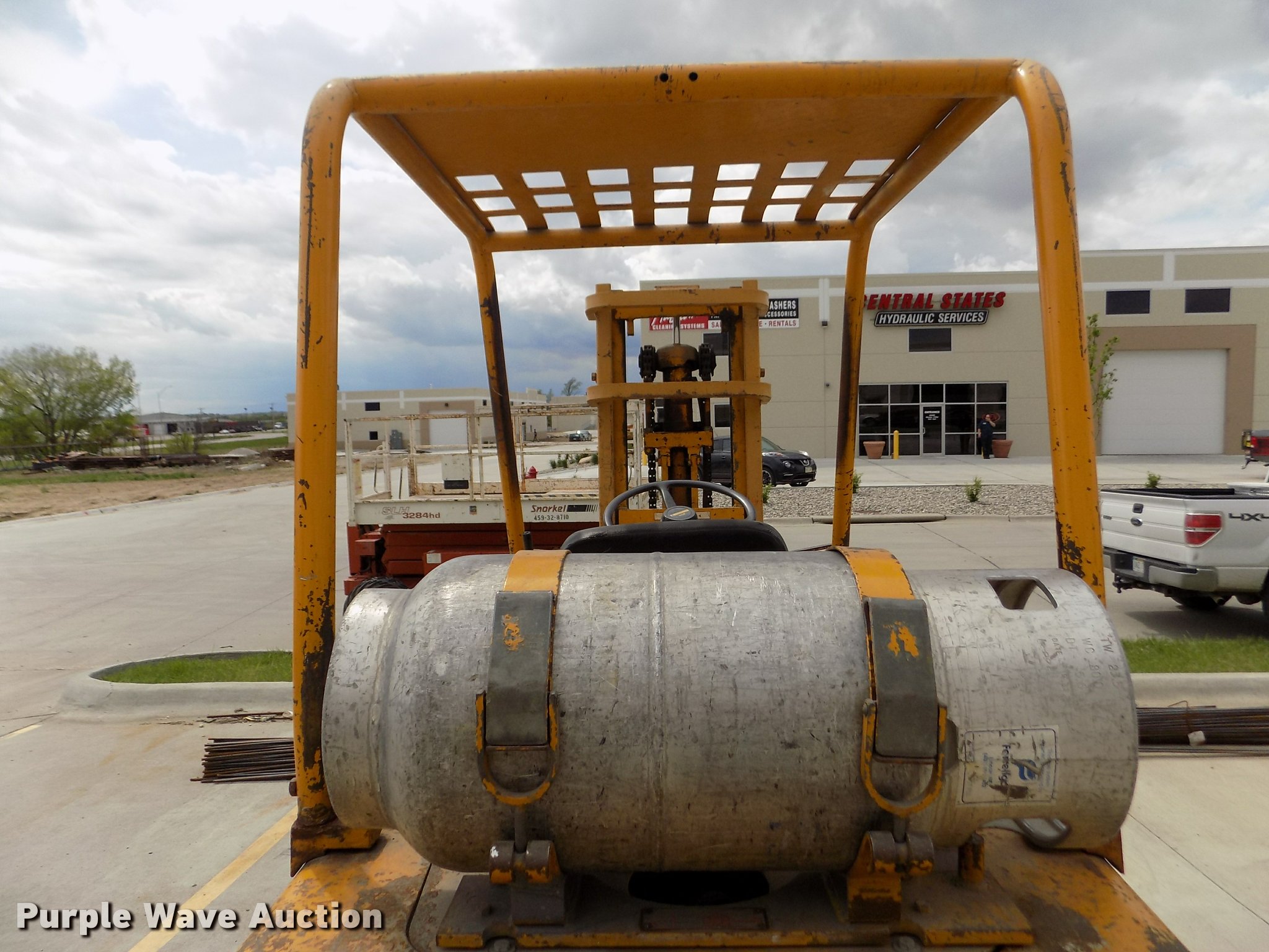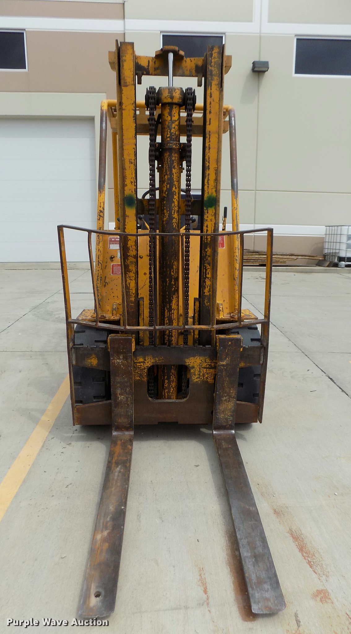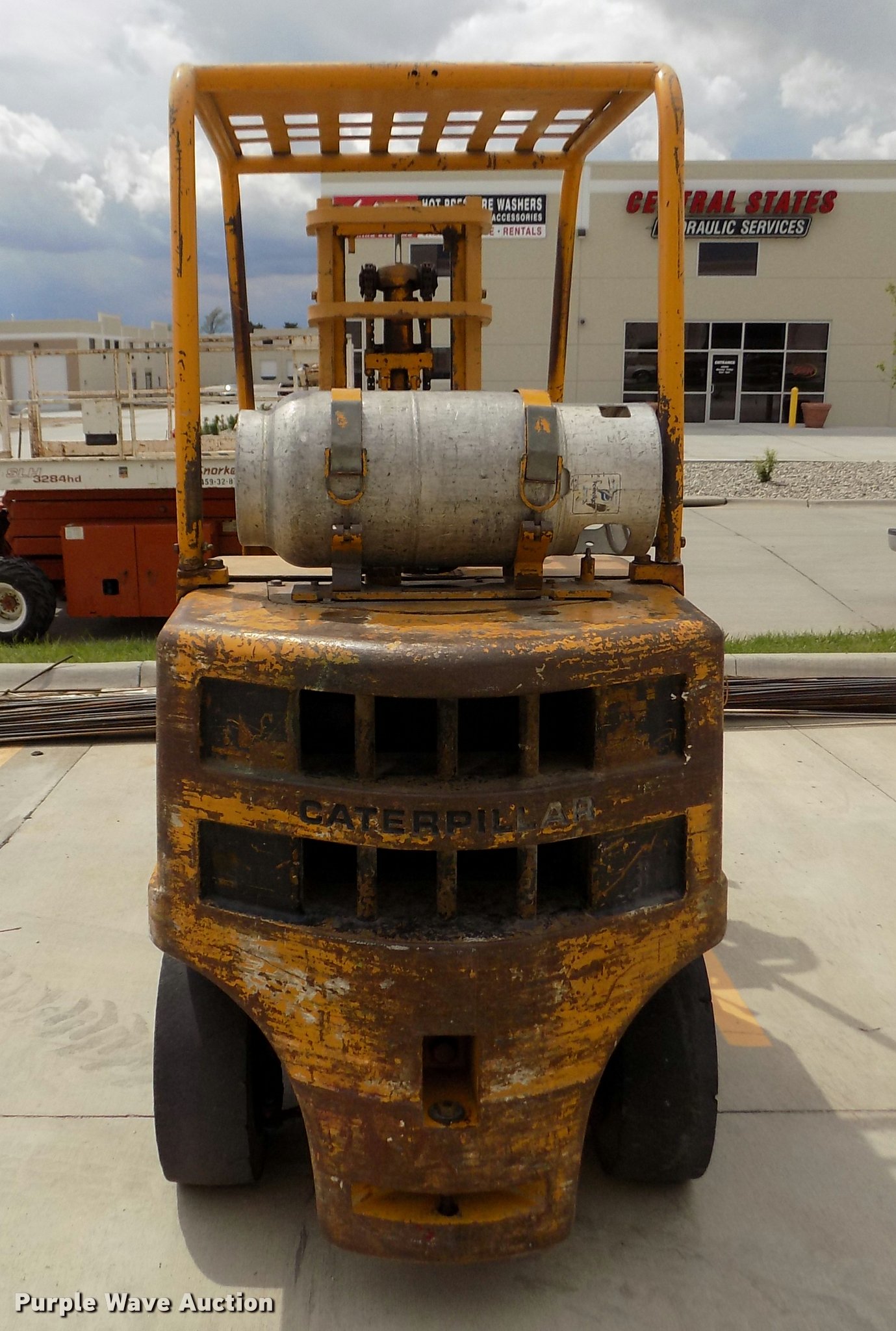 Purple Wave is selling a used Strt. Mast Rough Terr. Forklift in Nebraska. This item is a Caterpillar V60B forklift with the following: 2,663 hours on meter, Six cylinder propane engine, 2F-2R gears, Canopy, 6,000 lbs maximum lift capacity, 130" maximum lift height, Two stage mast, Mast tilt, 46"L x 5"W forks, Hole in forks, 45"W x 48"H carriage, 811 x 05 solid front tires, 6.50 x 10 solid rear tires, 9,310 lbs. base operating weight, Man basket is not included, Battery weak, Propane bottle is not included, Serial 89M1057