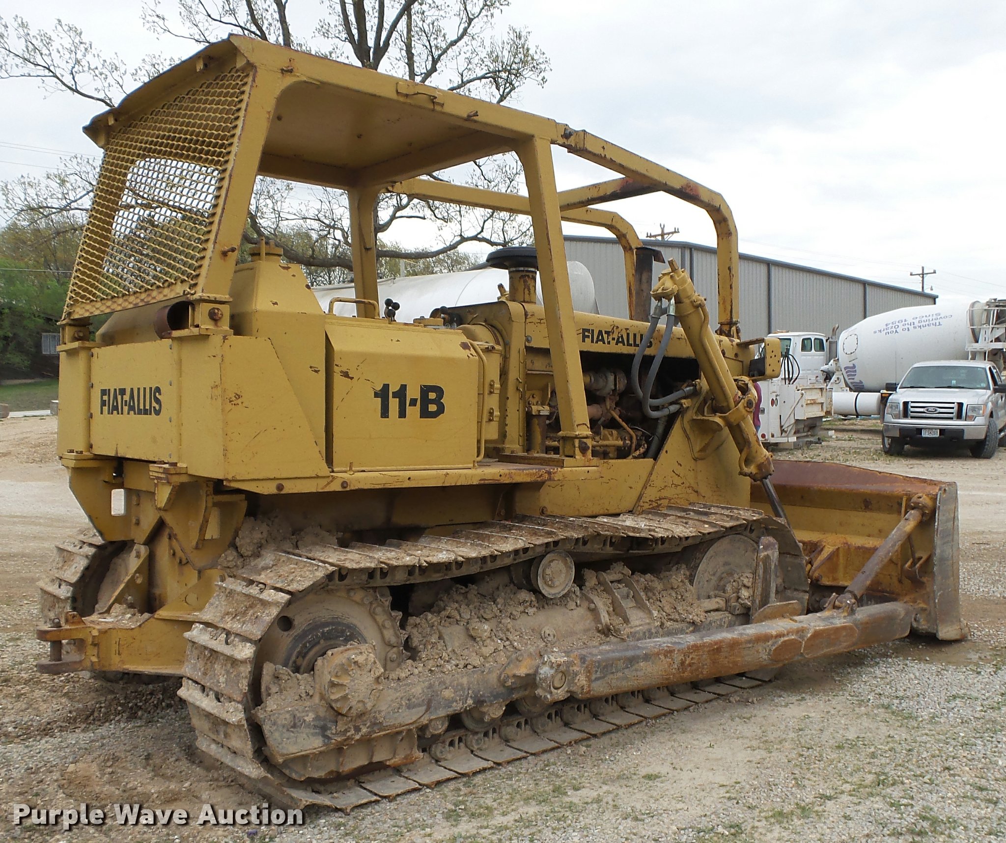 1976 Fiat-Allis 11B dozer. 4,987 hours on meter, Allis Chalmers six cylinder turbo diesel engine, Powershift transmission 2F-2R gears, Canopy, Suspension seat, Joystick control steering, Sweeps, Rear screen guards, 9'10" single tilt dozer blade, Rear drawbar, Six bottom rollers, 20" single grouser track pads, Pin hole in cylinder head gasket, Right rear driver sprocket seal leaking, Serial 25L-19559. Scotts Concrete. 2969 Old N Hwy 5. Camdenton, MO 65020