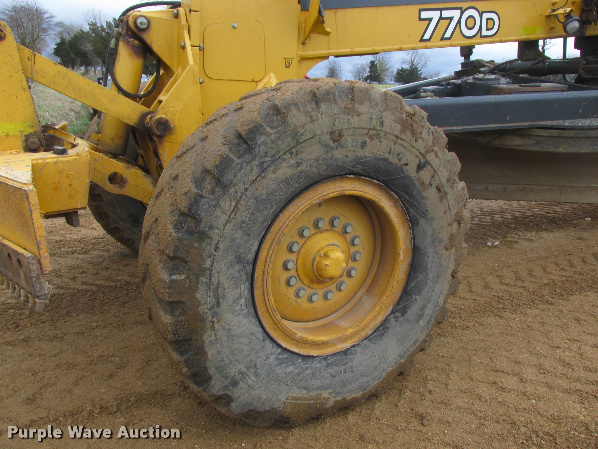Purple Wave is selling a used Motor Grader in Missouri. This item is a 2006 John Deere 770D motor grader with the following: 13,427 hours on meter, Hours may vary, unit is still in use, John Deere six cylinder diesel engine, Serial 6081HDW13, Powershift transmission, 8F-8R gears, Differential lock, Circle slip clutch, EROPS, AC and heat, AM/FM, Suspension seat, Front and rear work lights, 14'W moldboard, 14.00R24 tires, Combo lift group and front mounted scarifier are not included, Serial DW770DX605555