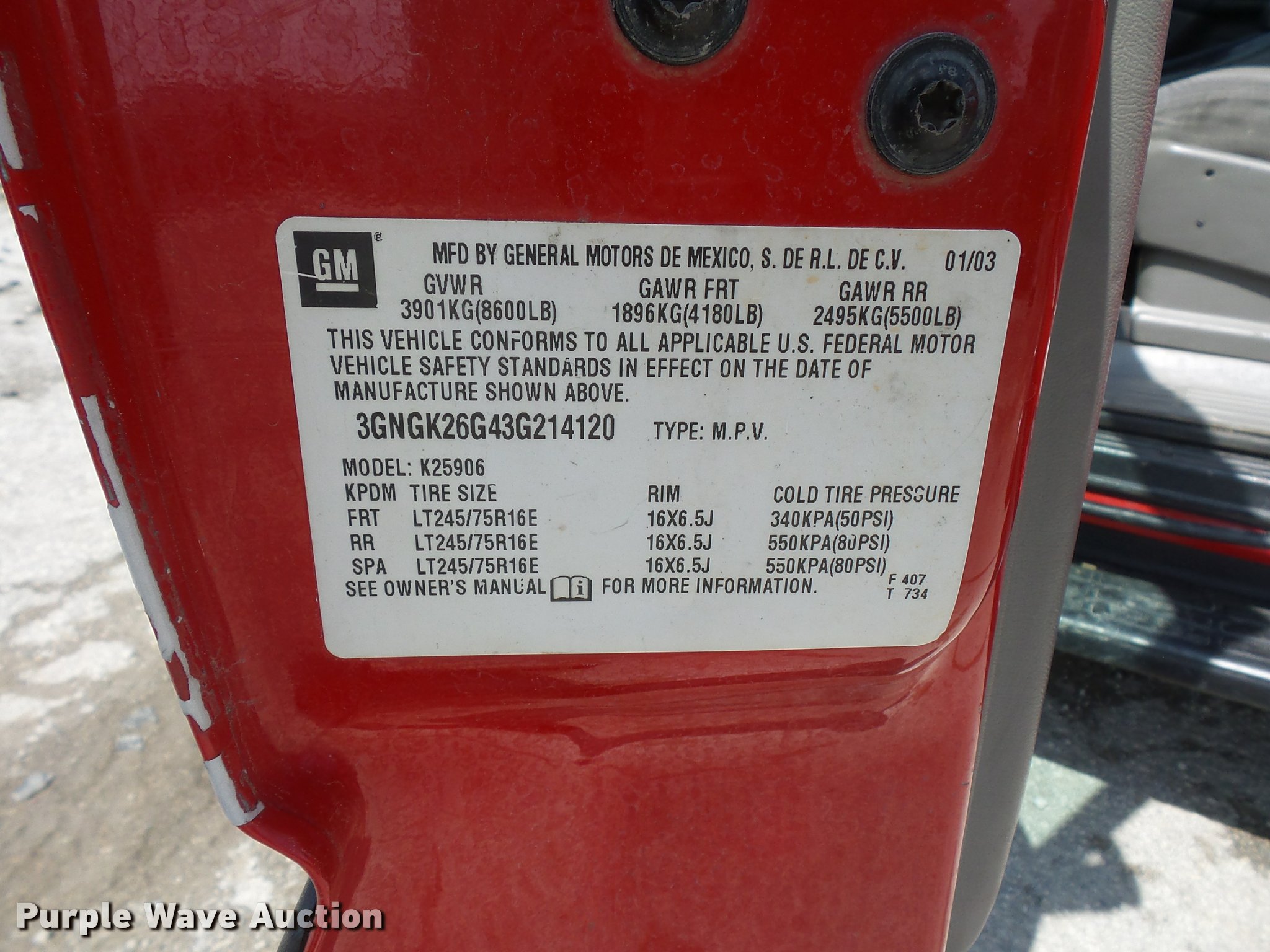 Purple Wave is selling a used Passenger Vehicle in Missouri. This item is a 2003 Chevrolet Suburban 2500 SUV with the following: 118,145 miles on odometer, 8.1L V8 OHV 16V gas engine, Automatic transmission, Four wheel drive, AC and heat, Tilt, Cruise, AM/FM/CD, Power windows, locks, and mirrors, Cloth interior, Receiver hitch, Trailer wiring, 245/75R16 tires