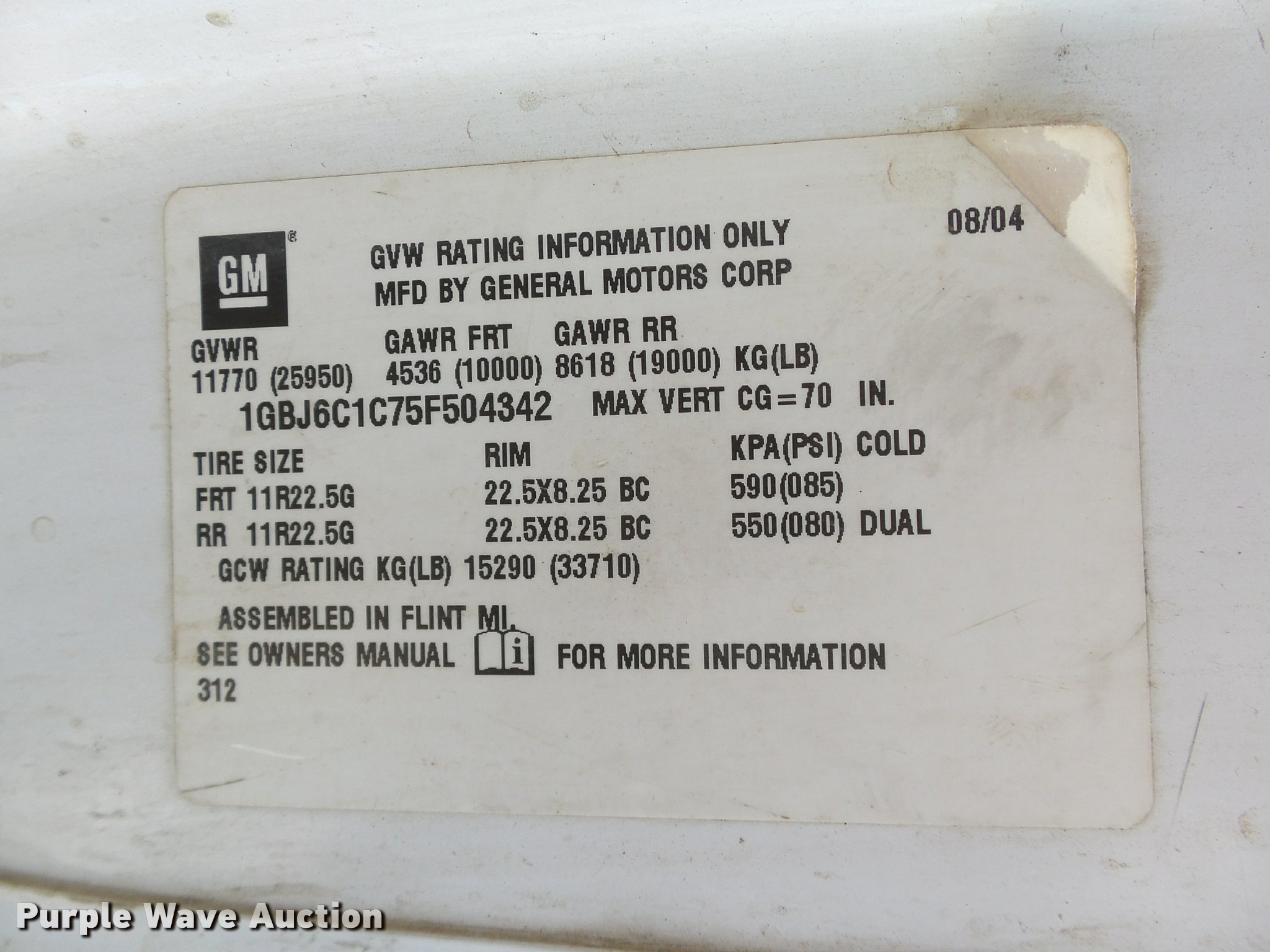 2005 Chevrolet C6500 truck chassis. 303,892 miles on odometer, 25,428 hours on meter, Caterpillar C7 7.2L six cylinder turbo diesel engine 207 HP, Serial KAL63779, Six speed manual transmission, Single axle, AC and heat, AM/FM, Tilt , Cruise, PTO, Front tow hooks, Dual fuel tanks, 154" wheelbase, Spring suspension, Hydraulic brakes, 11R22.5 tires, GVWR 25,950 lbs, FAWR 10,000 lbs, RAWR 19,000 lbs, Unit# 761.191. Oklahoma title. 1GBJ6C1C75F504342. Duit Holdings Inc. - Open inspection May 23. 7183 E Waterloo Industrial Rd. Edmond, OK 73034