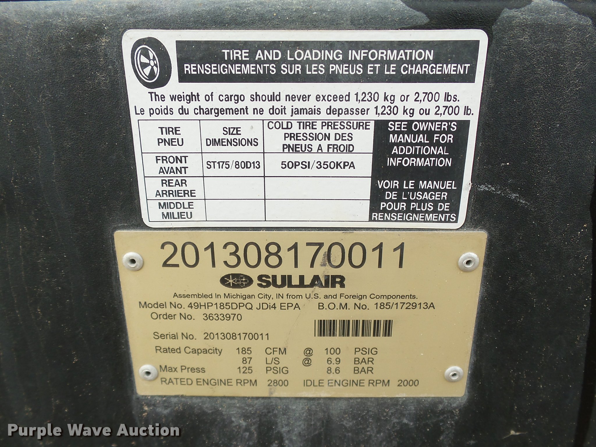 Purple Wave is selling a used Air Compressor in Oklahoma. This item is a 2013 Sullair 185DPQ air compressor with the following: 1,097 hours on meter, John Deere 4024TF281A four cylinder turbo diesel engine, 49 HP, Serial PE4024R130610, 185 CFM, 125 psi, Single discharge valve, Serial 201308170011, Unit# 111.603