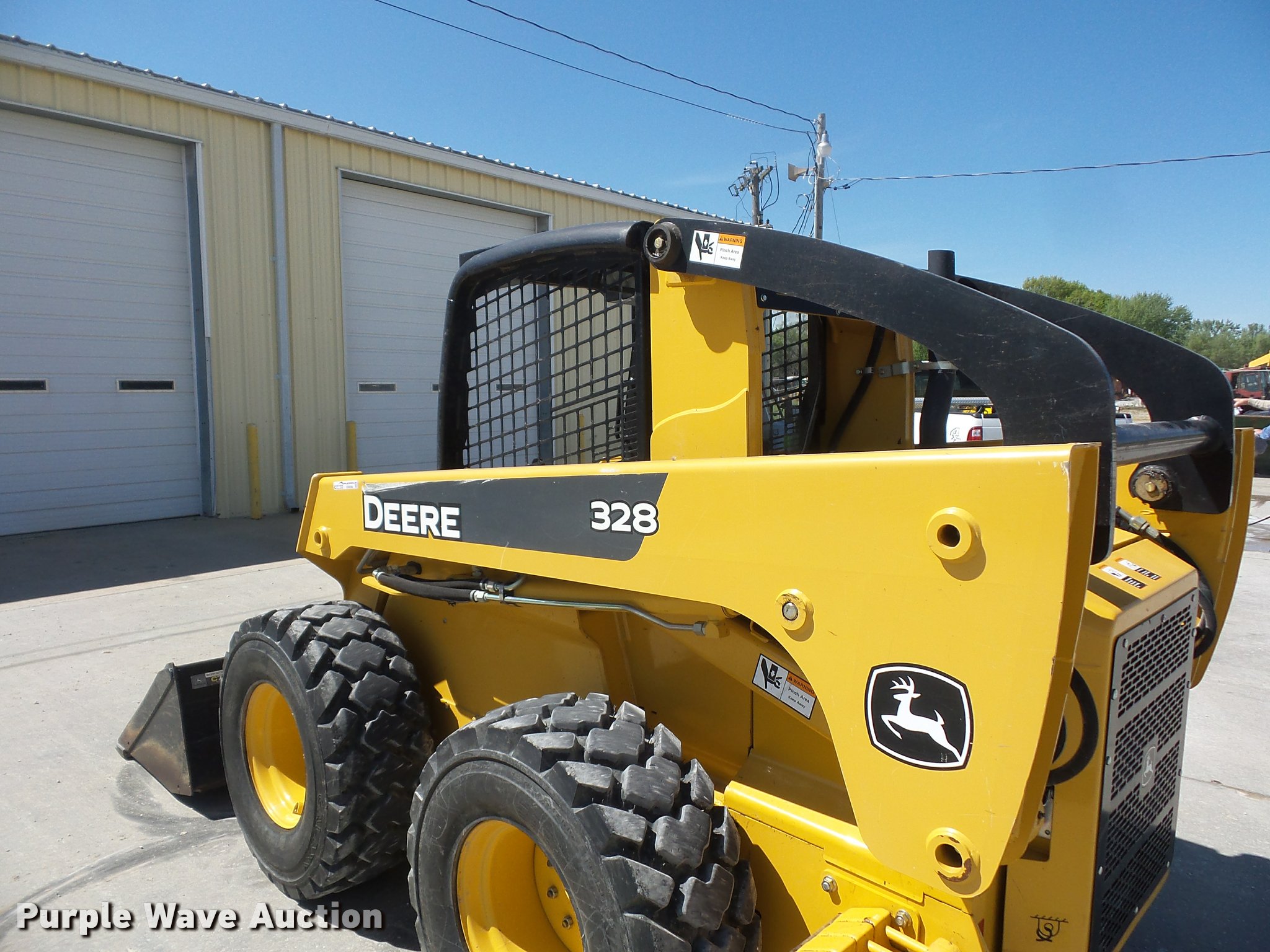 Purple Wave is selling a used Skid Steer Loader in Missouri. This item is a 2007 John Deere 328 skid steer with the following: 900 hours on meter, John Deere four cylinder turbo diesel engine, Hydrostatic transmission, Front and rear work lights, 78"W bucket, Hydraulic quick coupler, Auxiliary hydraulics, Counter weights, 14 x 17.5 tires, Serial T00328A147293