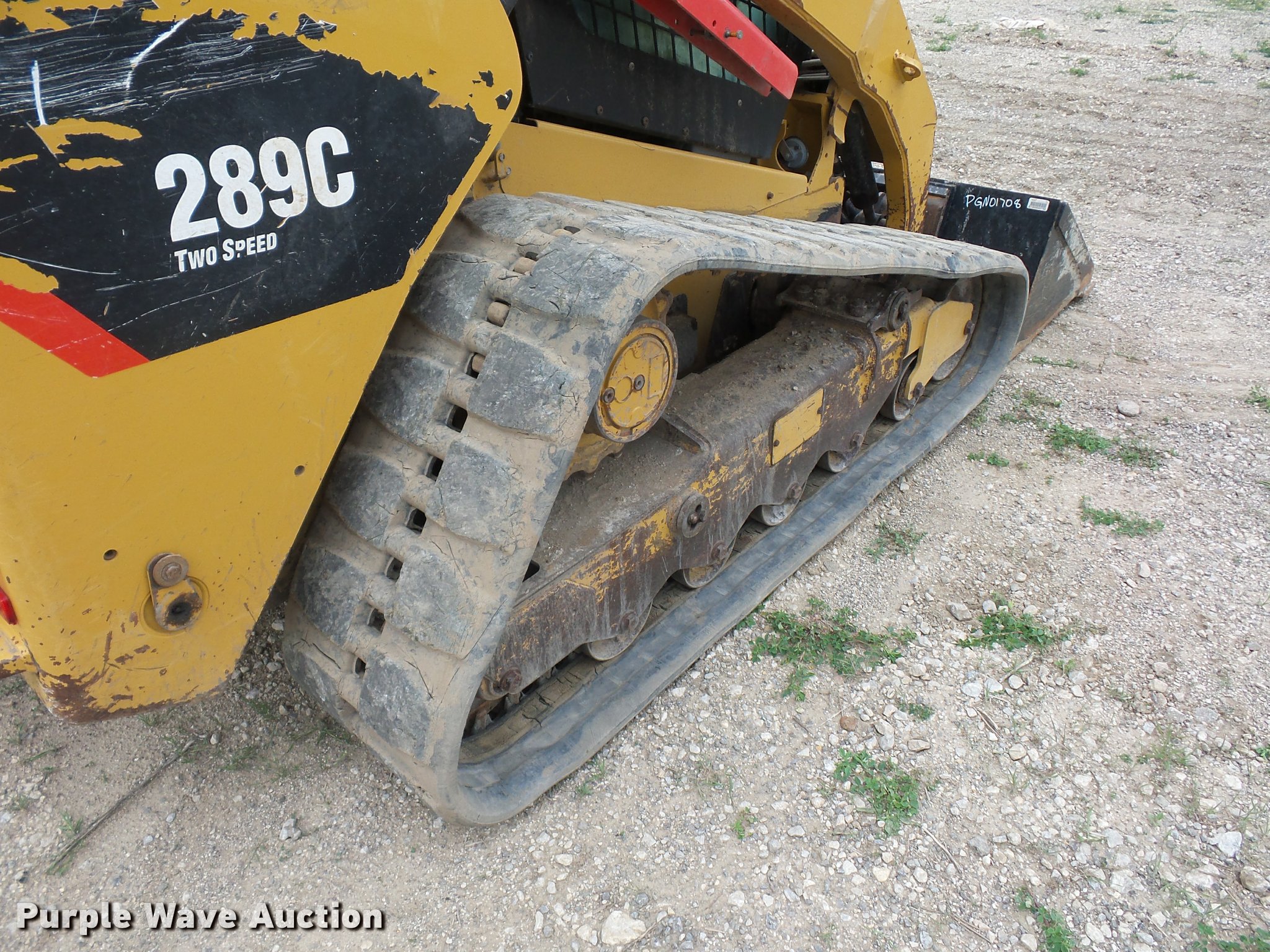 Purple Wave is selling a used Tracked Skid Steer Loader in Kansas. This item is a 2012 Caterpillar 289C skid steer with the following: 4,852 hours on meter, Four cylinder turbo diesel engine, Hydrostatic transmission, Enclosed cab, AC and heat, Joystick controls, Front and rear work lights, Wipers, Auxiliary hydraulics, Manual quick coupler, 74"W bucket, 17.5"W tracks, Front torsion bar on right side is broken, Serial CAT0289CKJMP02710