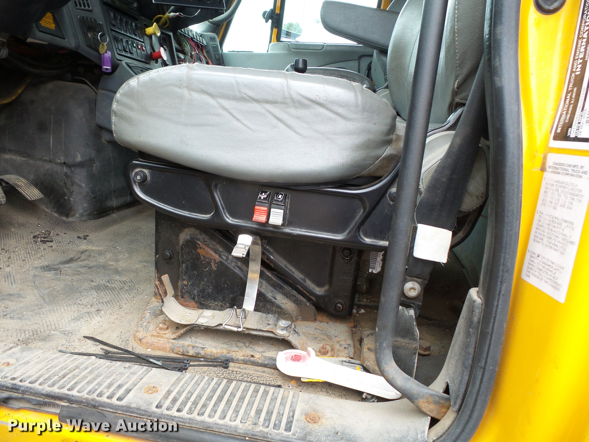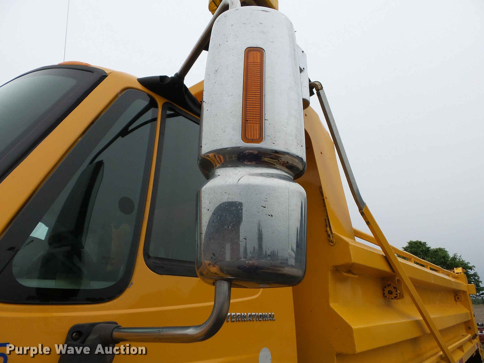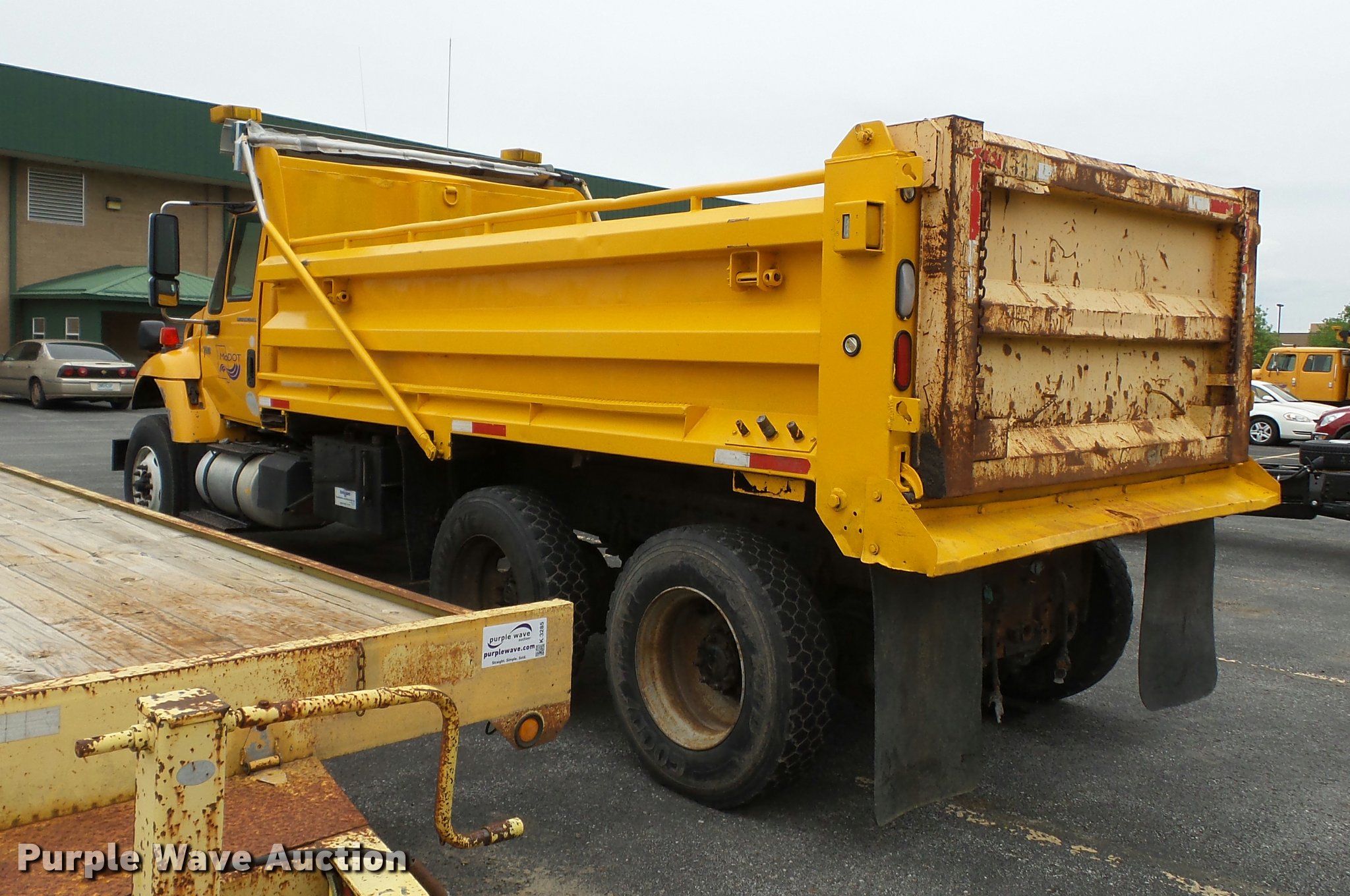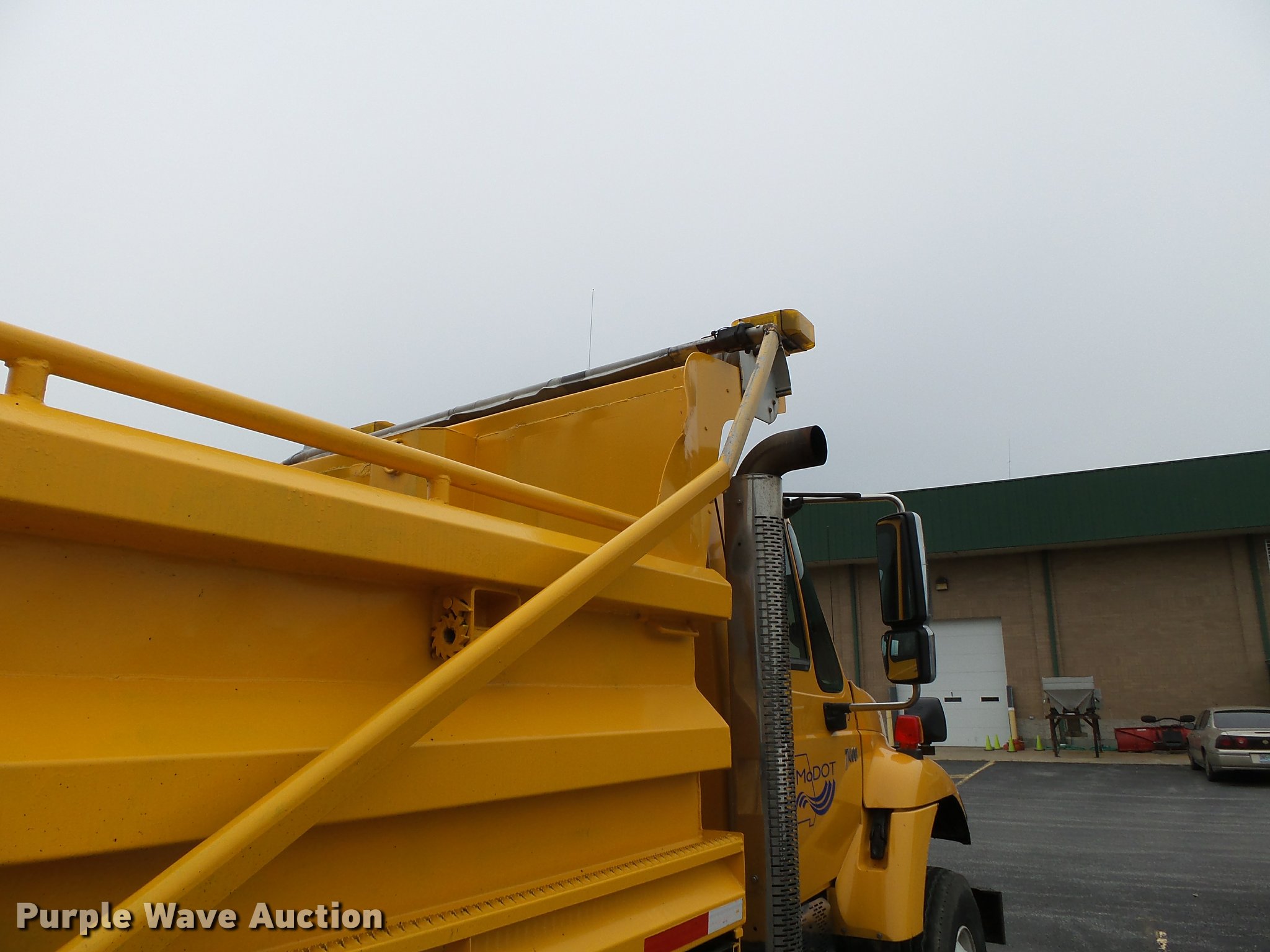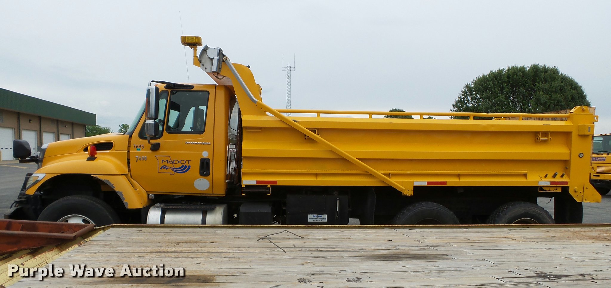 Purple Wave is selling a used Construction Dump Truck in Missouri. This item is a 2006 International 7400 dump truck with the following: 187,356 miles on odometer, 9,462 hours on meter, International DT570 9.3L L6 turbo diesel engine, Automatic transmission, Tandem axle, AC and heat, Cruise, AM/FM, Power windows, Power and heated mirrors, Air suspension seat, Block heater, Front mounted PTO, Backup alarm, Wheeler steel dump bed, 16'L x 96"W, Single ram hoist, Air operated end gate, Roll tarp, Single fuel tank, 213" wheelbase, Walking beam suspension, Air brakes, Engine brake, 315/80R22.5 front tires, 11R22.5 rear tires, GVWR 58,000 lbs, FAWR 18,000 lbs, IAWR 20,000 lbs, RAWR 20,000 lbs, Two way radio is not included, Beacon light is not included, Inside rear wheels missing, Rear wheel seal leaking, Bed hydraulics disables, Bed rail rusted, Check engine light on, MODOT ID 7695