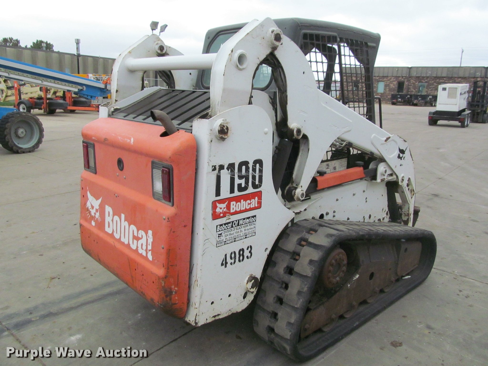 Purple Wave is selling a used Tracked Skid Steer Loader in Iowa. This item is a 2012 Bobcat T190 skid steer with the following: Kubota V2607-T four cylinder turbo diesel engine, Serial CA1054, Hydrostatic transmission, Open station/canopy, Hand and foot controls, Spring suspension seat, Front and rear work lights, Block heater, 67"W bucket, Bolt-on cutting edge, Hydraulic quick coupler, Auxiliary hydraulics, Auxiliary electrical outlet, 12"W tracks, Serial A3LN40554, Unit# 4983