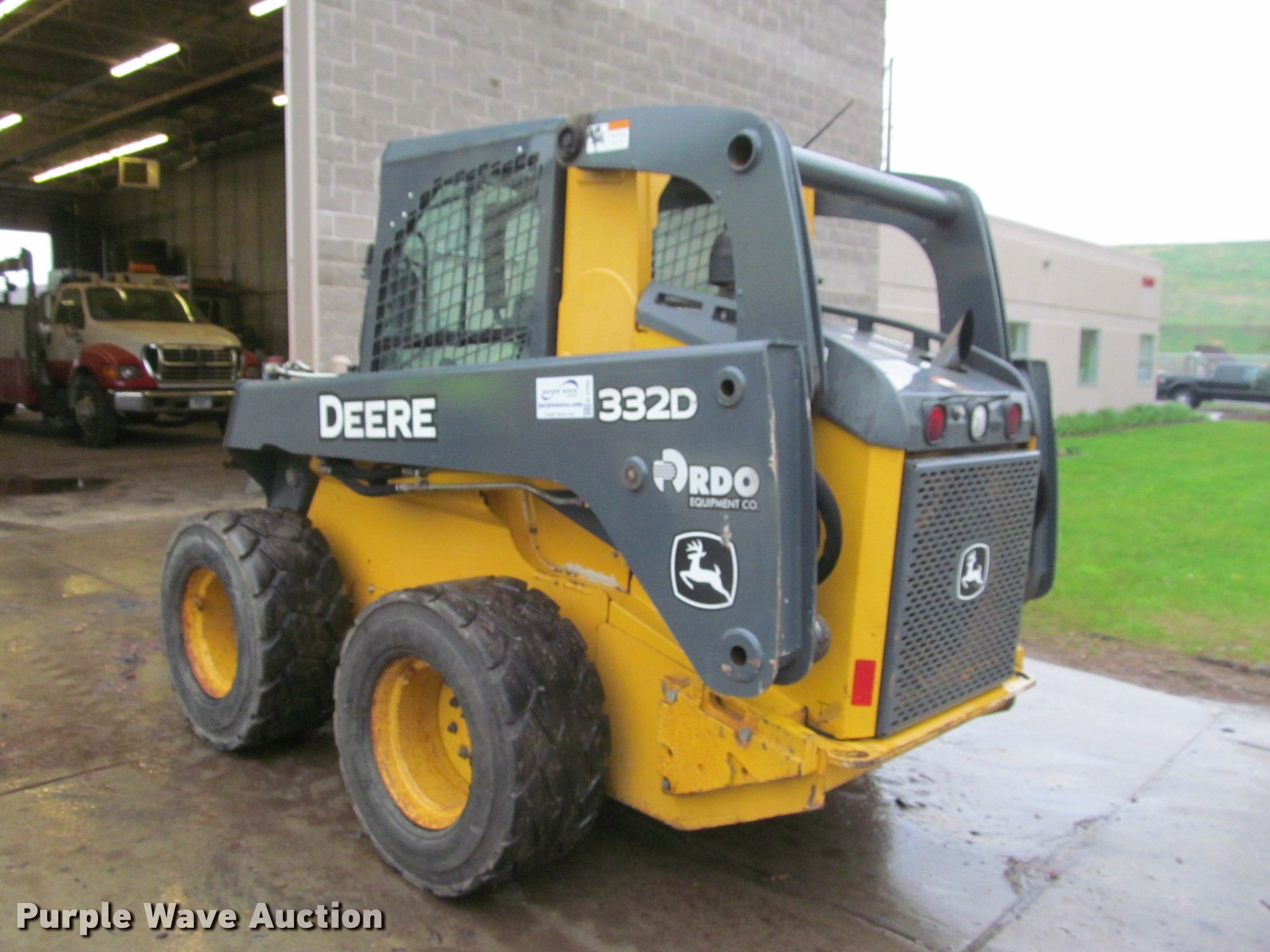 Purple Wave is selling a used Skid Steer Loader in Minnesota. This item is a 2011 John Deere 332D skid steer with the following: 1,387 hours on meter, John Deere turbo diesel engine, Hydrostatic transmission, Enclosed cab, AC and heat, AM/FM, Joystick controls, EMS panel, Spring suspension seat, Wipers, Front and rear work lights, Backup alarm, John Deere Work Site Pro 84 84"W bucket, Bolt-on cutting edge, Hydraulic quick coupler, Auxiliary hydraulics, Counter weights, Samson 14-17.5 tires, Serial 1T0332DKCBD206685