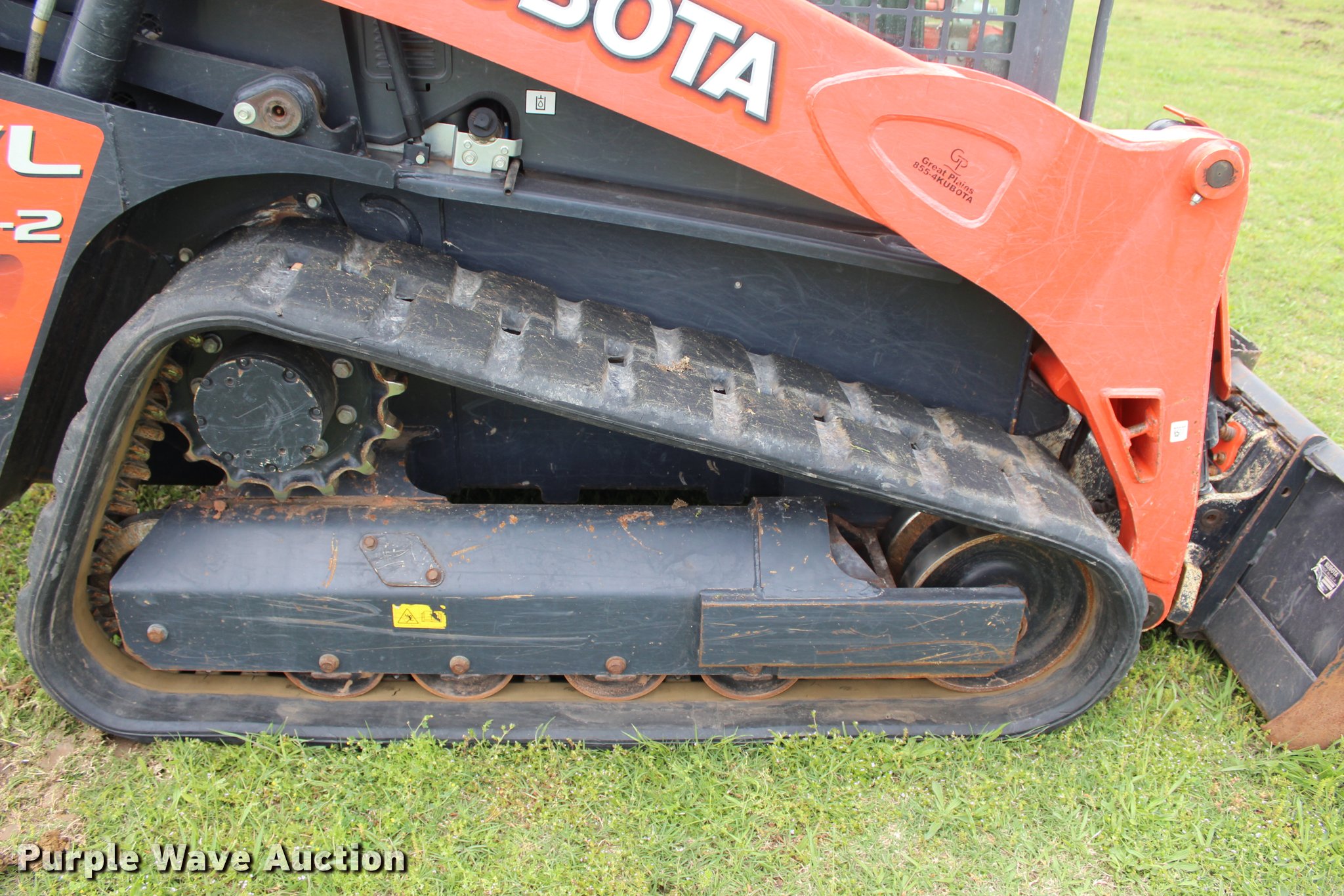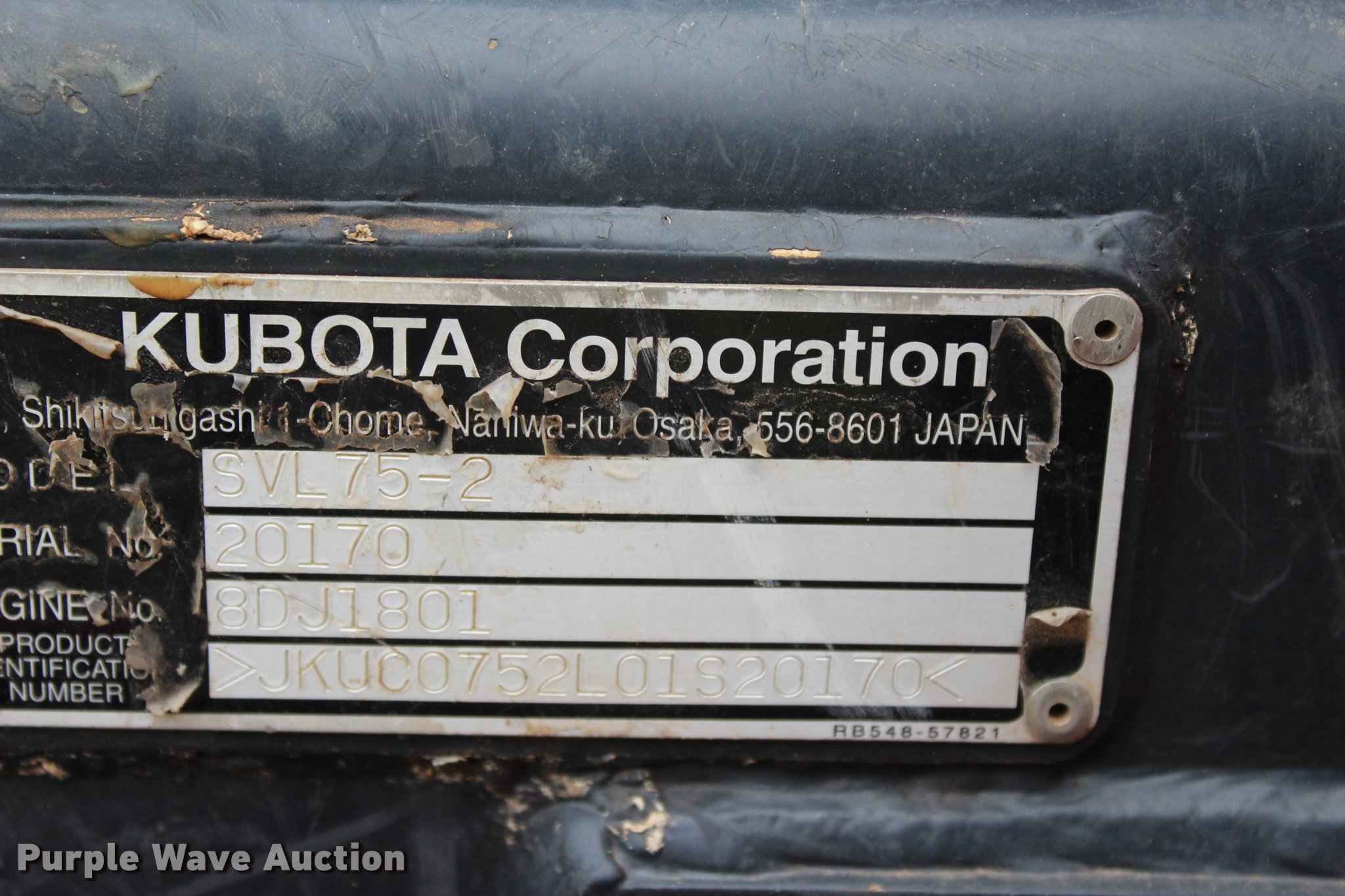 Purple Wave is selling a used Tracked Skid Steer Loader in Oklahoma. This item is a 2014 Kubota SVL75-2 skid steer with the following: 517 hours on meter, Kubota 3.3L four cylinder turbo diesel engine, Serial 8DJ1801, Two speed hydrostatic transmission, Enclosed cab, AC and heat, AM/FM, Joystick controls, Spring suspension seat, Wipers, Front and rear work lights, 72"W low profile bucket, Hydraulic quick coupler, Auxiliary hydraulics, Auxiliary electrical outlet, 15"W tracks, Serial 20170