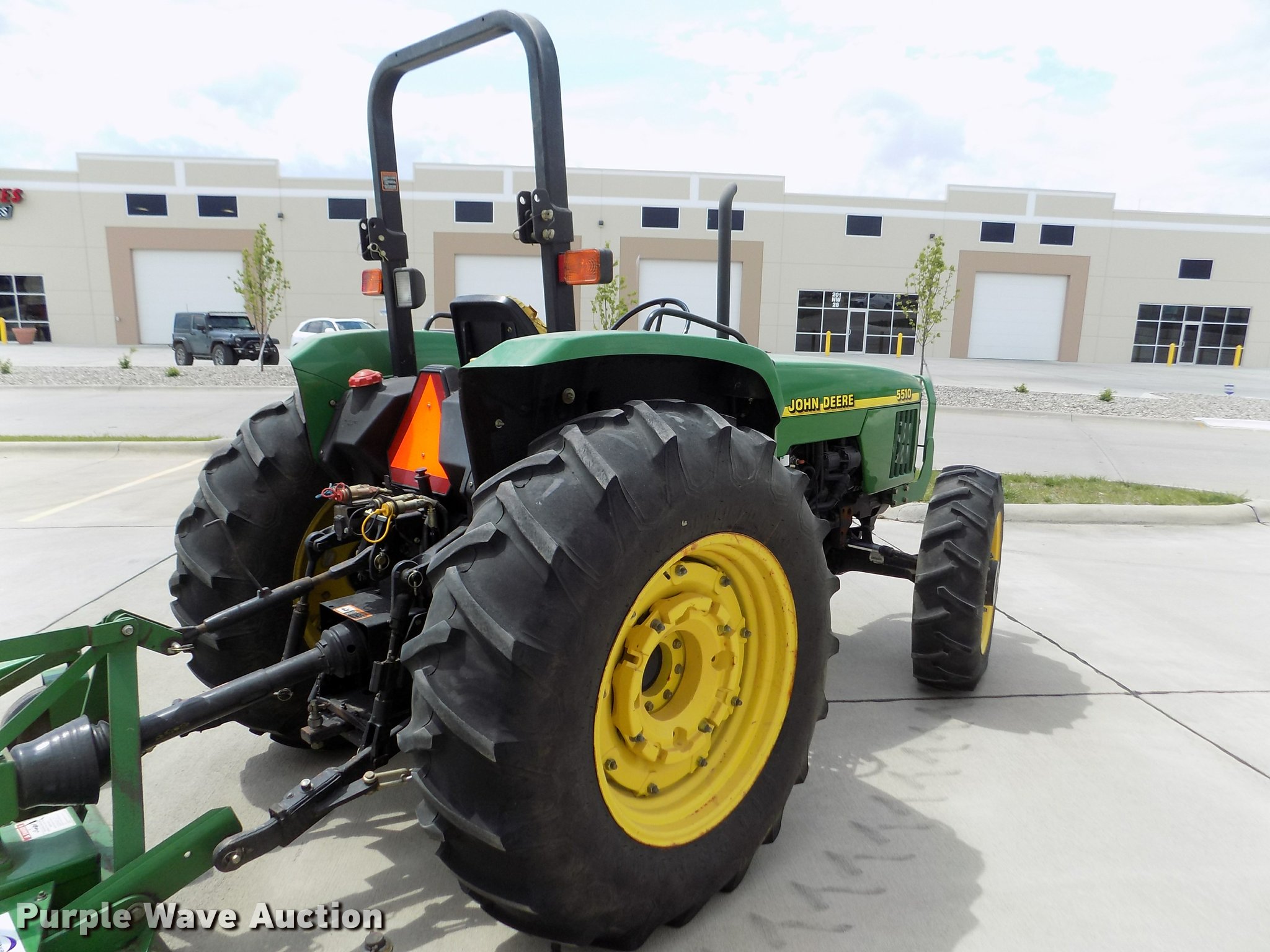 Purple Wave is selling a used Tractor in Nebraska. This item is a 1998 John Deere 5510 MFWD tractor with the following: 1,097 hours on meter, John Deere 4045TLV50 4.5L four cylinder turbo diesel engine, 89 HP, Serial PE4045008960, Sync shuttle shift transmission, 9F-3R gears, Differential lock, Folding roll bar, Suspension seat, Seven pin outlet, 540 PTO, (2) rear hydraulic remote sets, (2) wheel weights, 11.2-24 front tires, 16.9-30 rear tires, Stored inside, Seat worn, Rotary mower not included, Serial LV5510S152229