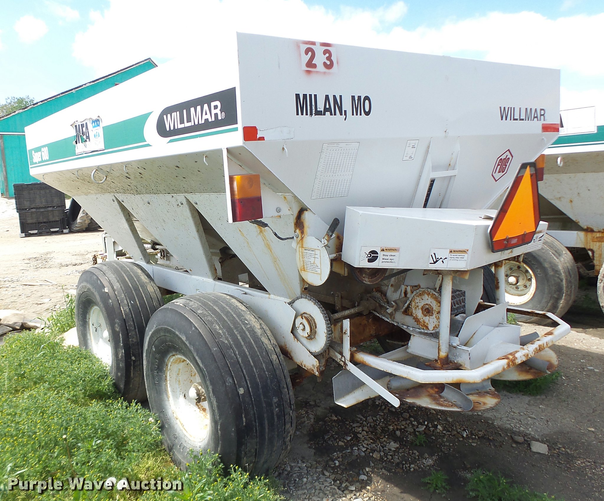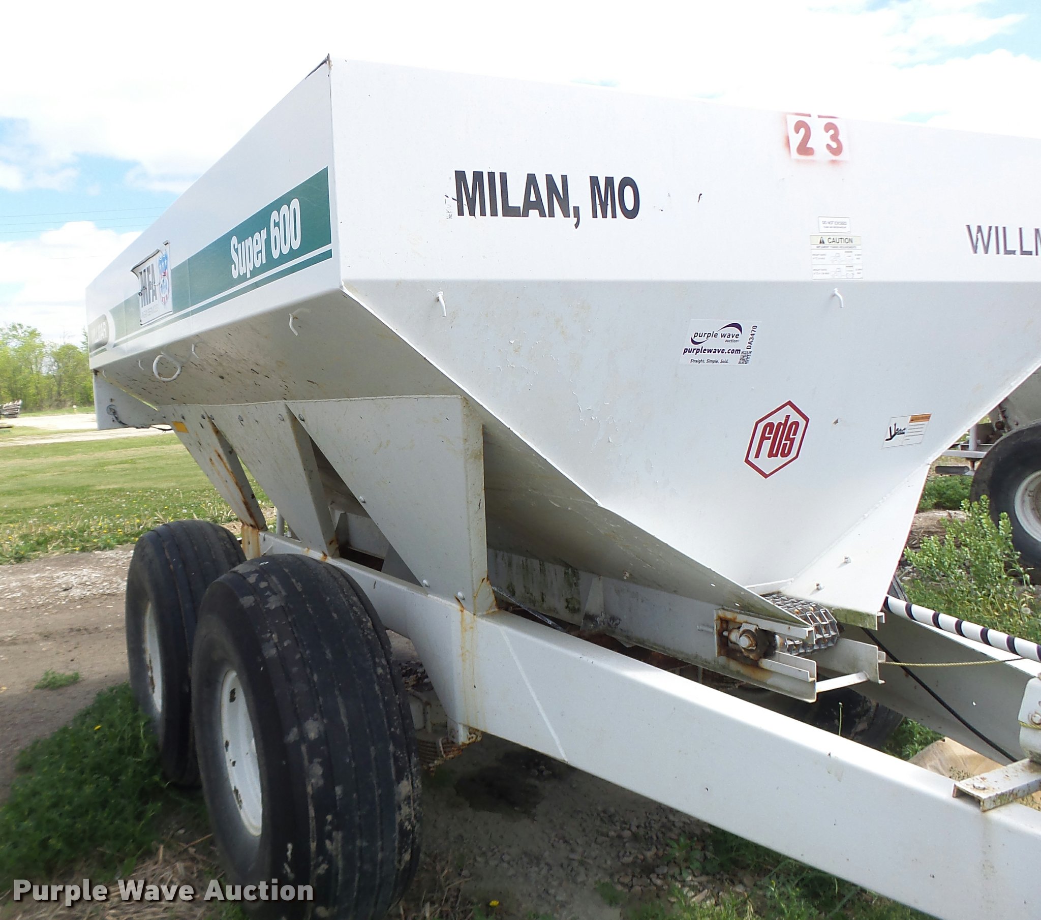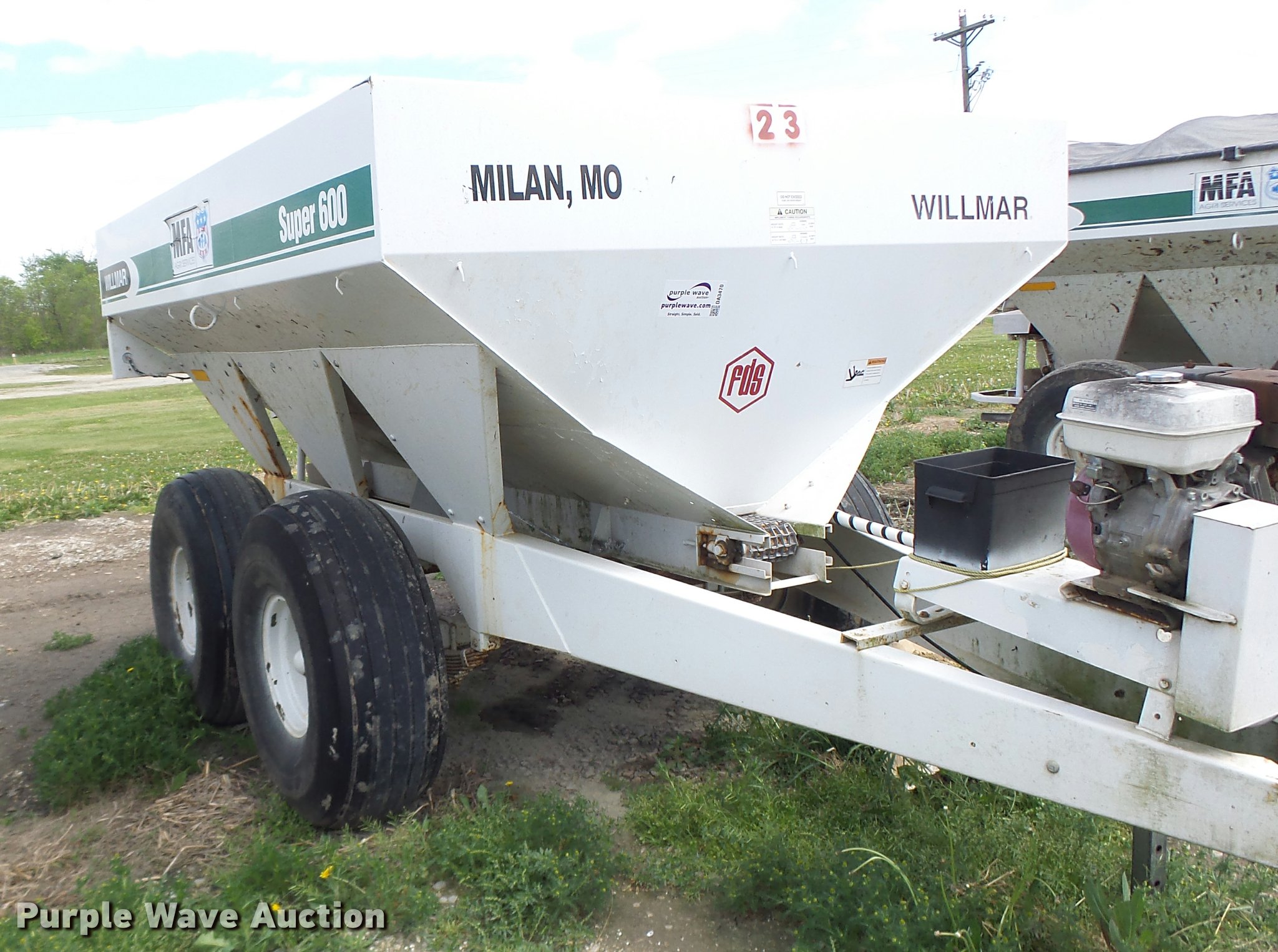 Purple Wave is selling a used Applicator Pull Type in Missouri. This item is a Willmar Super 600 fertilizer spreader with the following: Gas engine, Dual spinners, Pin hitch, 16.5L-16.1 tires, Unknown operating condition, Unit# 23