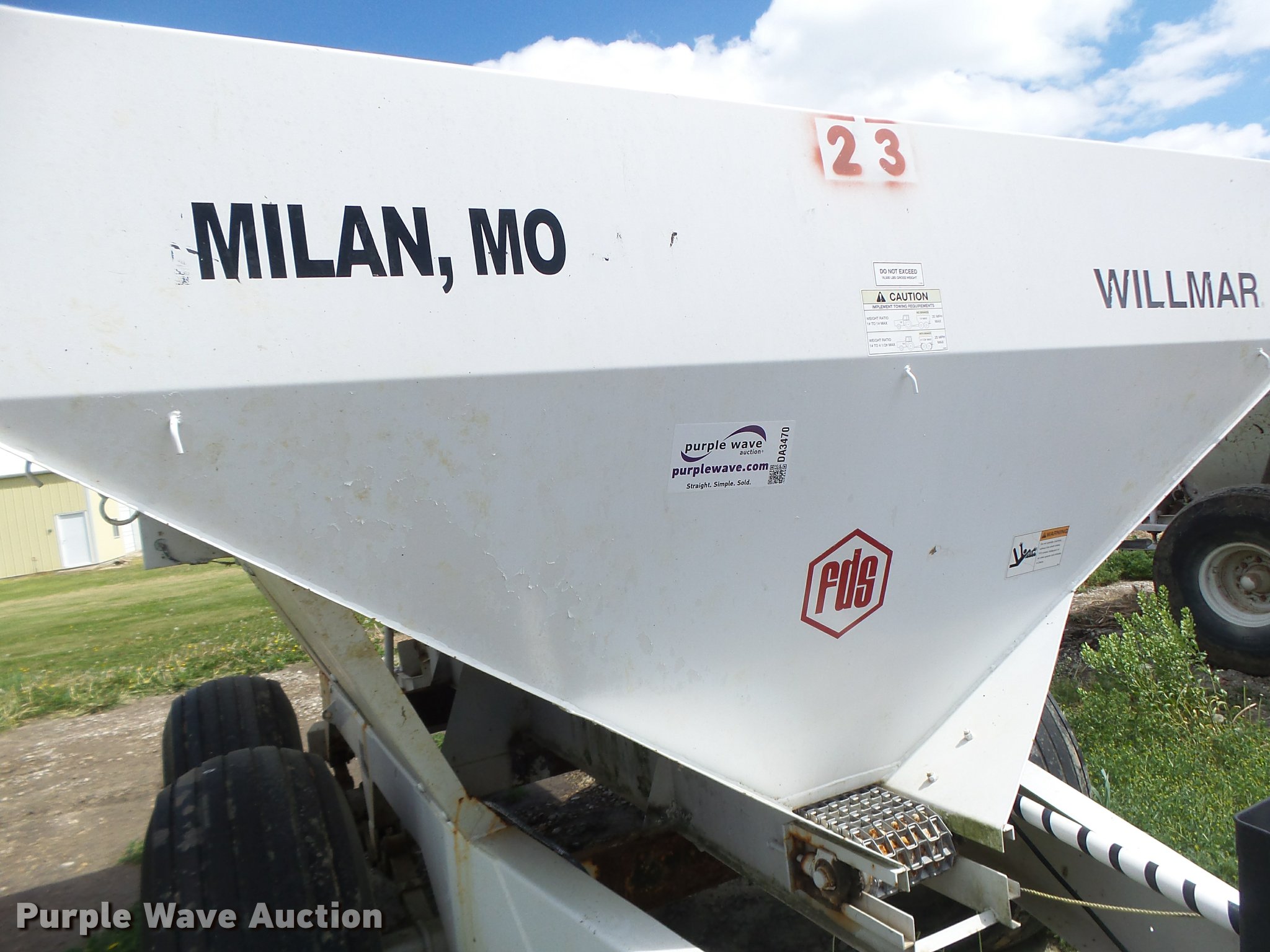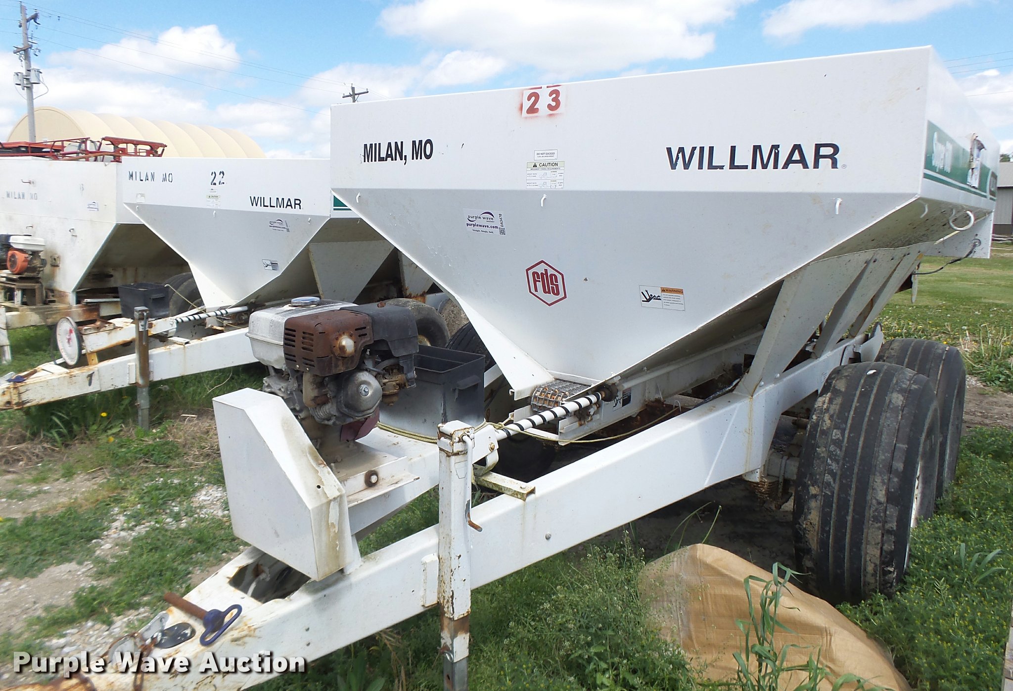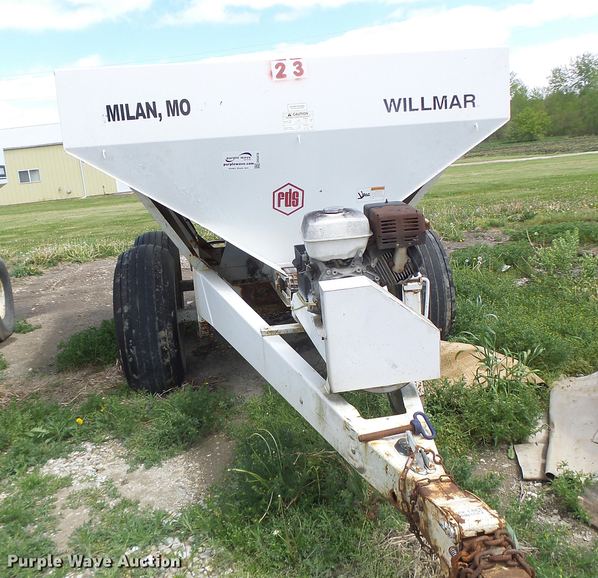 Purple Wave is selling a used Applicator Pull Type in Missouri. This item is a Willmar Super 600 fertilizer spreader with the following: Gas engine, Dual spinners, Pin hitch, 16.5L-16.1 tires, Unknown operating condition, Unit# 23