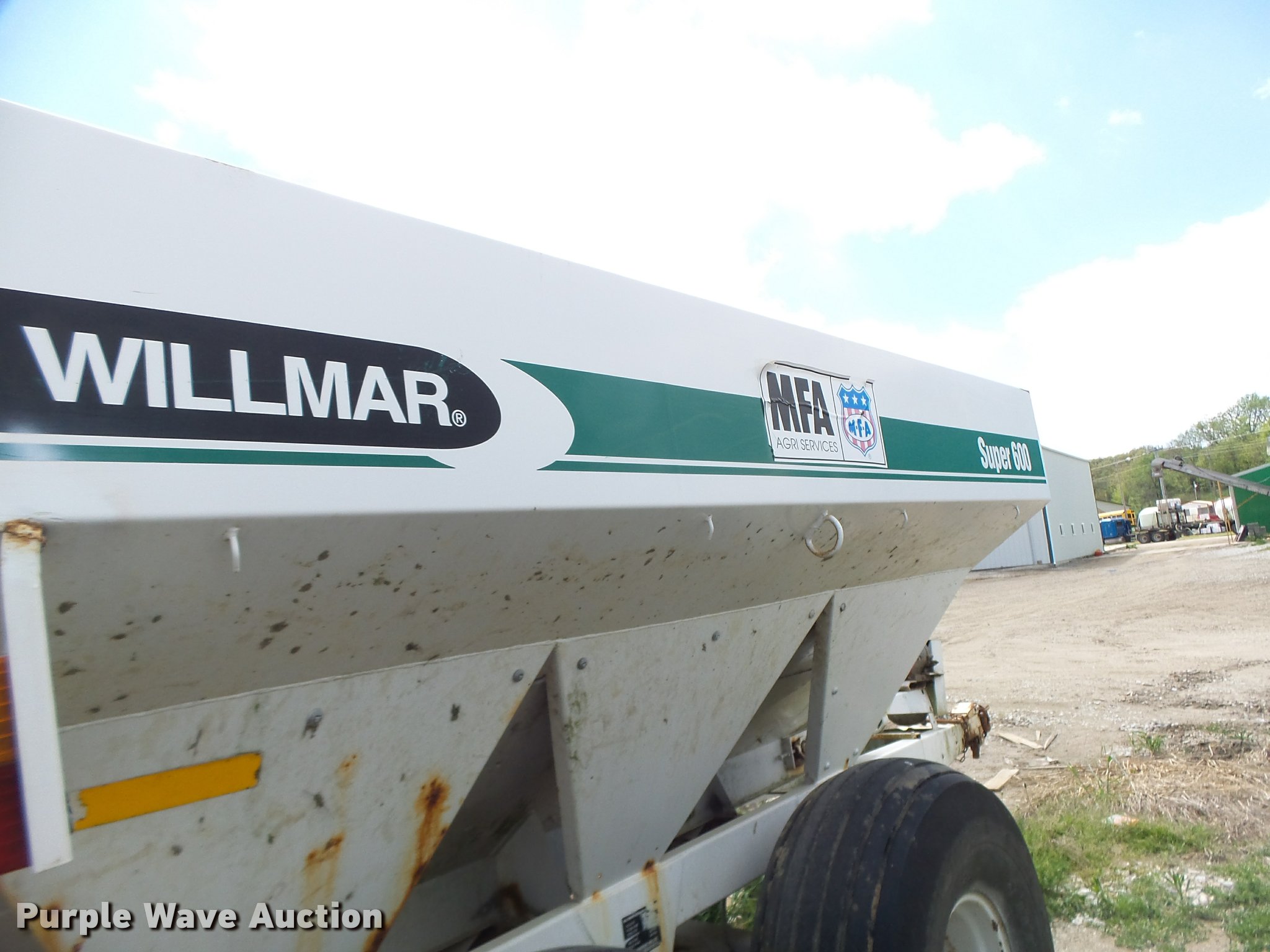 Willmar Super 600 fertilizer spreader. Gas engine, Dual spinners, Pin hitch, 16.5L-16.1 tires, Unknown operating condition, Unit# 23. MFA Ag Inc.. 914 E 3rd St. Milan, MO 63556